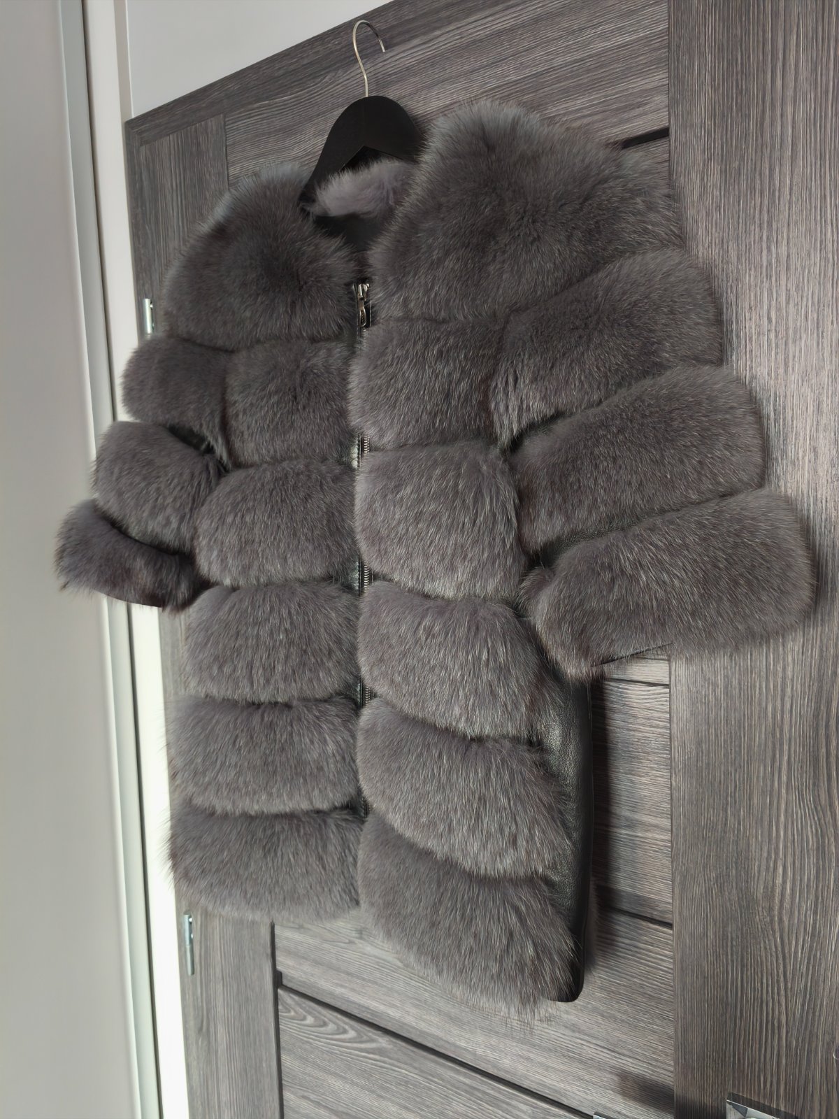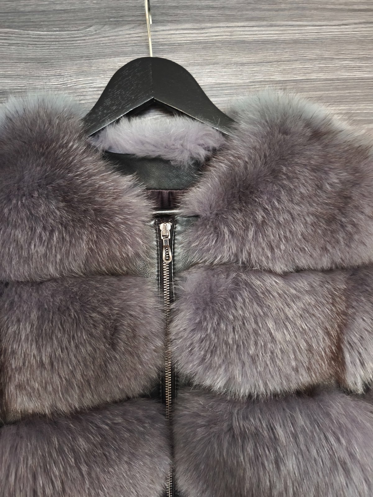 Nadherny luxusny velmi teply kozuch z lisky, zapinanie na zips kombinovany s pravou kozou, po boku vrecka 3/4 rukavy. Najlepsie sedi na XS/S. Obleceny asi 3-4x na prilezitost v top stave. Povodna cena vysoka.