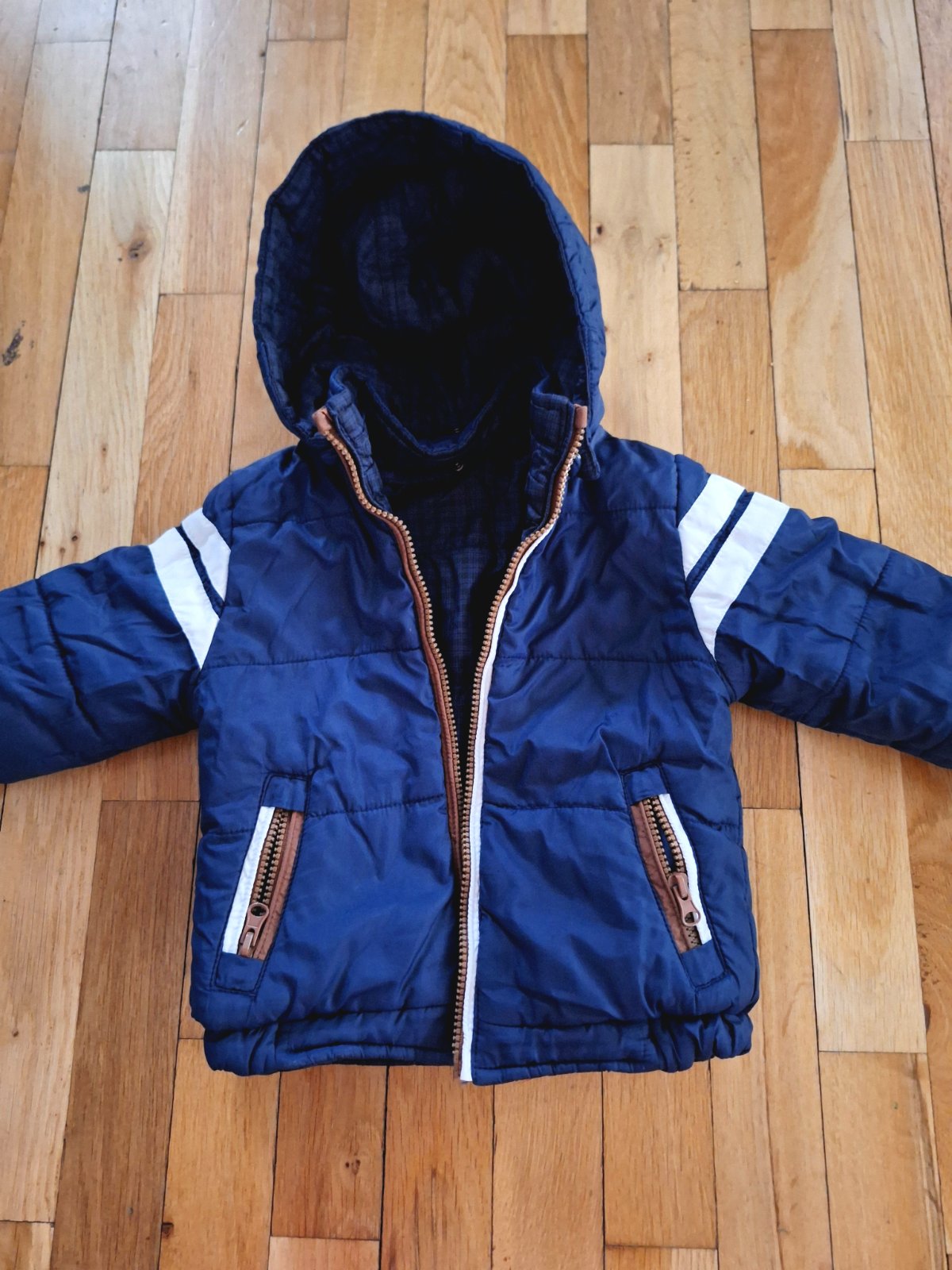 Kvalitná bunda na prechodné obdobie.je hrubšia, kapucňa odopínatelná, druhá strana je hnedá, bezchybný stav. dlžka 46cm, šírka 41cm, rukáv od krku 39cm.