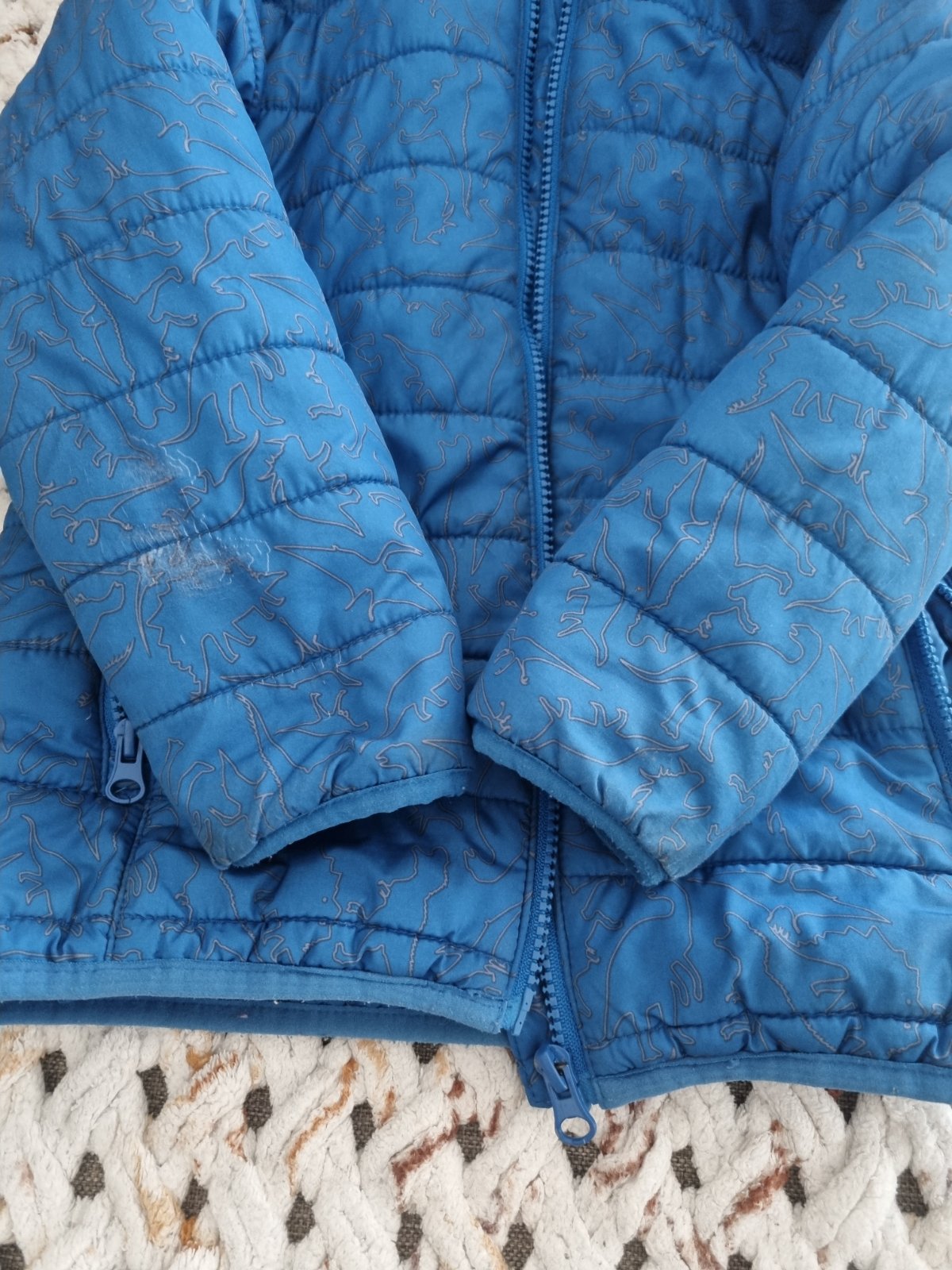 Bunda s dinosaurami.Na jednom rukáve zozadu šuchnutá.