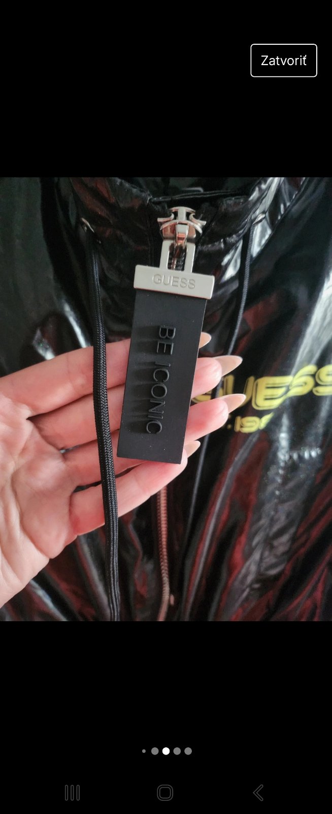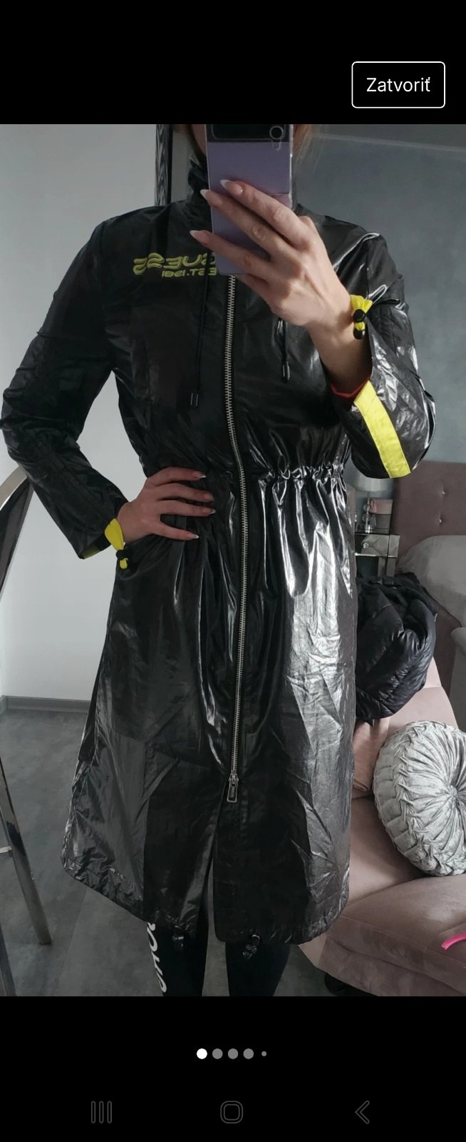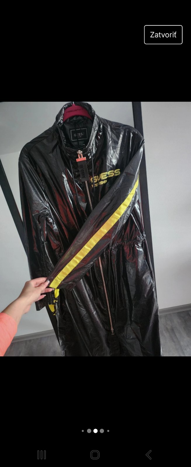 Prechodny nepremokavy cierny kabat, original Guess obleceny párkrát....zial po porode mi je tesny.. velkost zodpoveda S ... stoji mi v skrini keby bol o cislo vacsi neposuvam... kapuca sa da odobra...