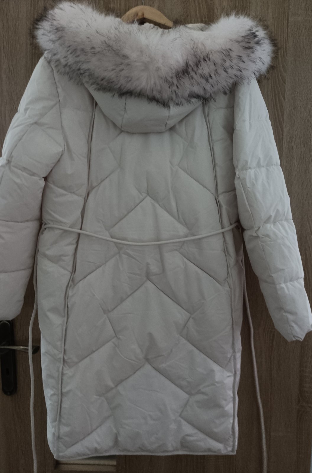 - Krásna snehová biela bunda s odnímateľnou kapucňou, zateplene eko kožušinkou, celková dĺžka 75, prsia 58x2 pás 52 boky 62x2, rukáv od krku 78