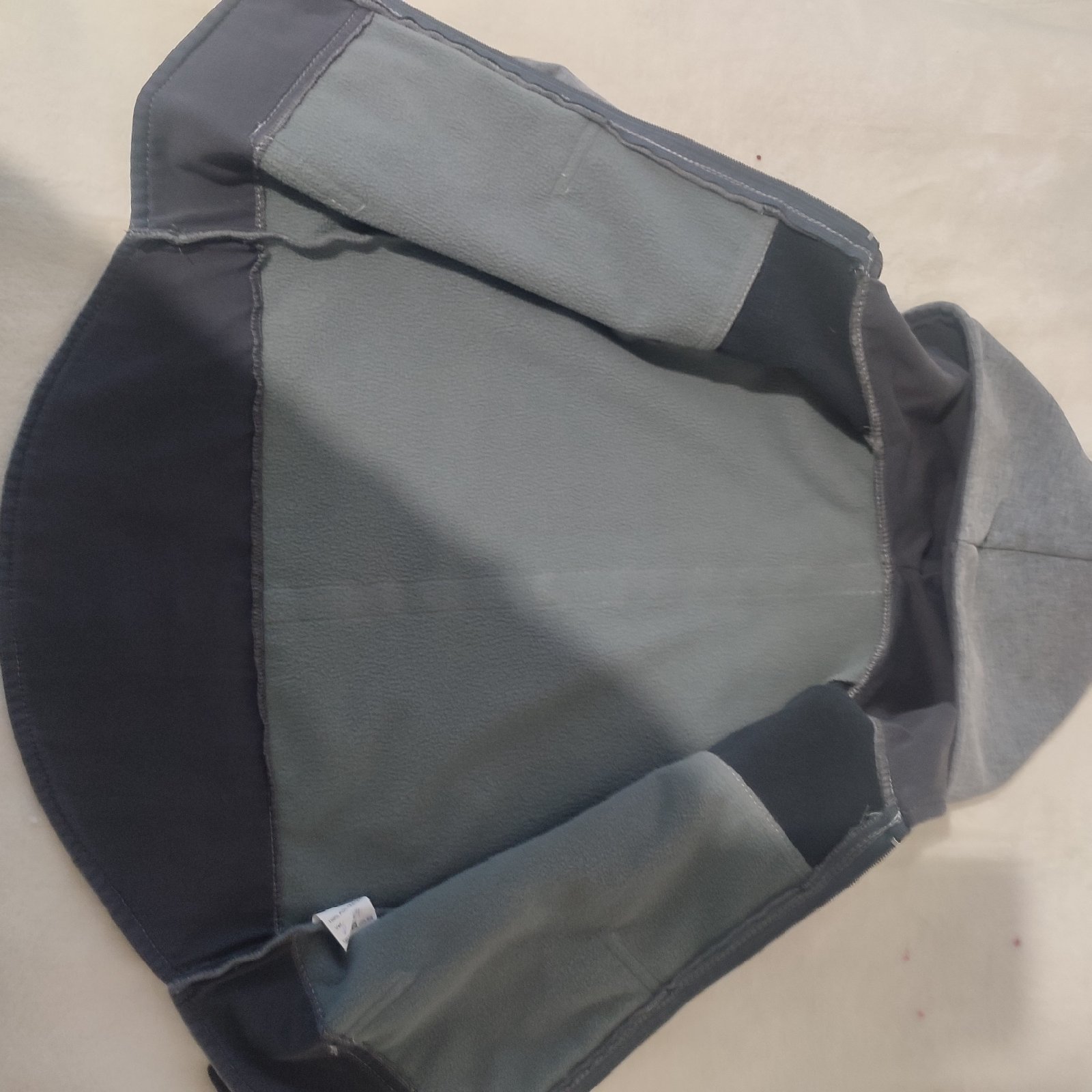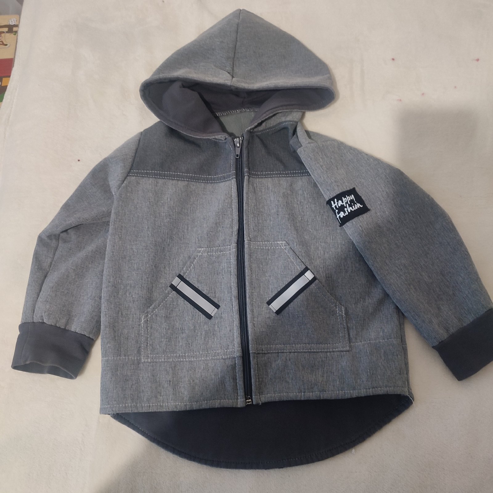 Sivá softshell bundička Tchibo, veľ. 98/104, pri vrecku má malý žltý fliačik, pri nosení ho nie je vidieť, neskúšala som odstrániť žiadnym odstraňovačom škvŕn. Kapucka sa dá odopnut. Sivá nepremoka...