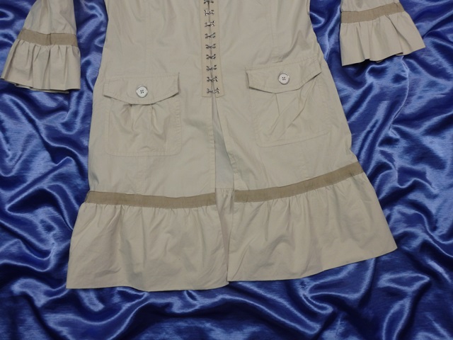 Kvalitný jarný kabátik so zapínaním na drobné háčiky, vypracovaný do detailov, vpredu vrecká, efektne nariasené rukávy, materiál 100% bavlna, super stav....pc 150 €