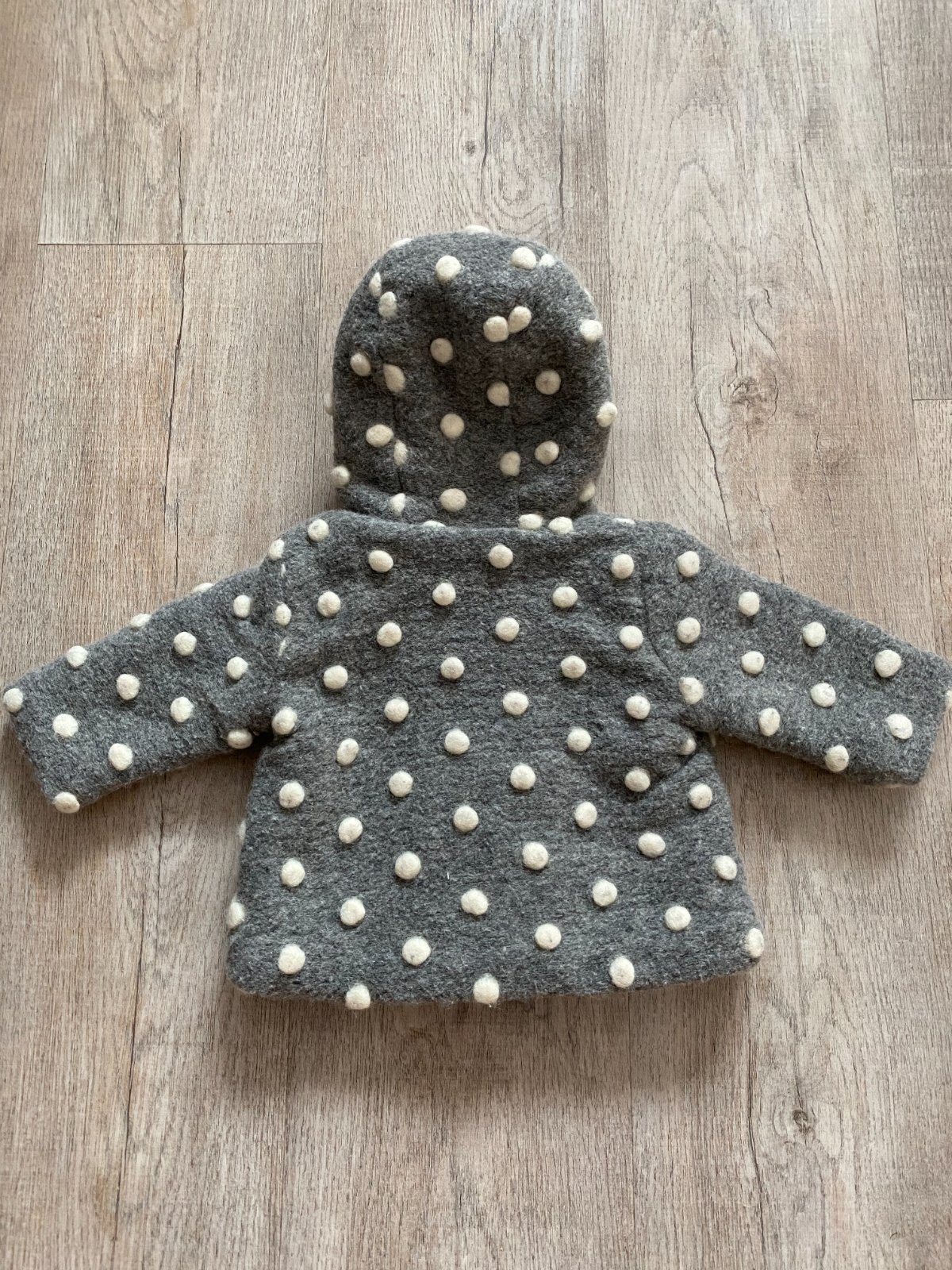 ❄️🧸 Predám nádherný bledosivý kabátik/ bundu s kapucňou a čiapkou, zdobený bielymi bodkami – pôsobí ako jemný snehový vzor.
