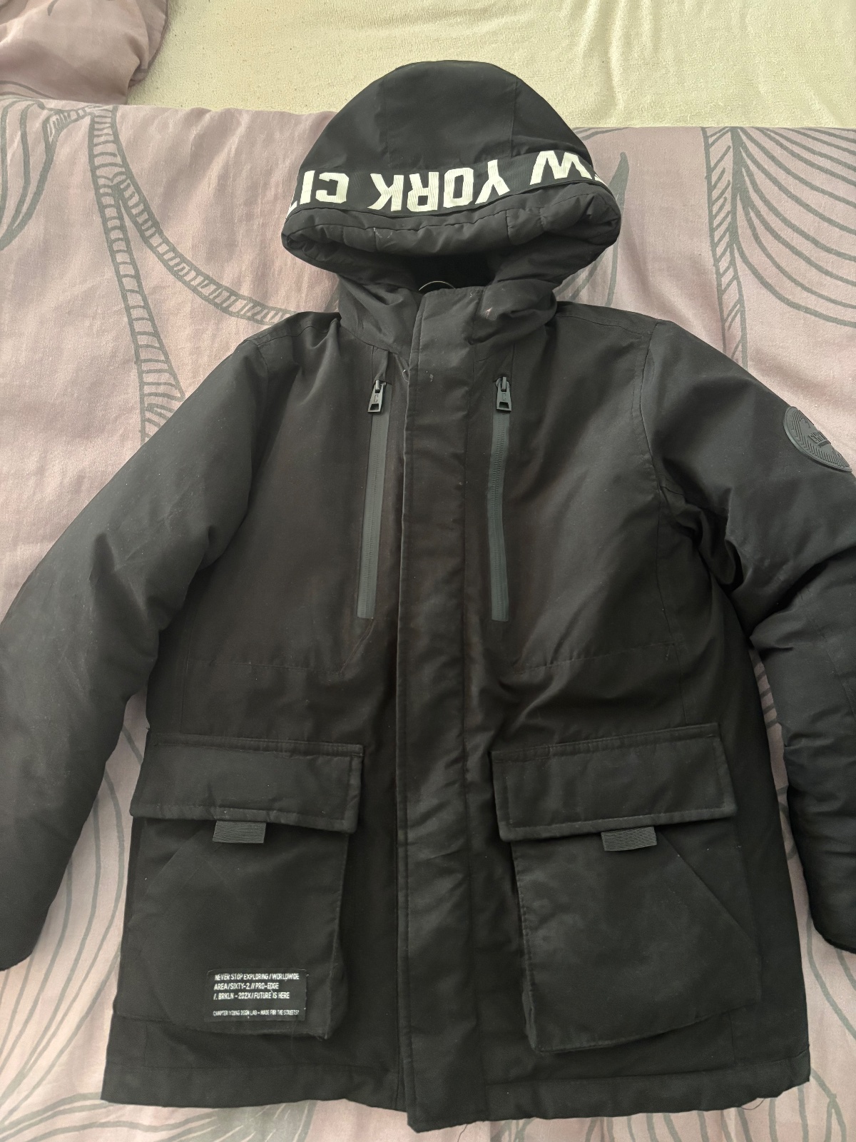 Čierna jemne lesklá extra tepla bunda na zimu,kombinovaná krikľavým gombíkmi a nápisom pri zipse,ktorý sa prekrýva priklopkou.Ma mnoho vreciek,vonkajších a jedno vnútorne.Rukav je ukončený teplým p...