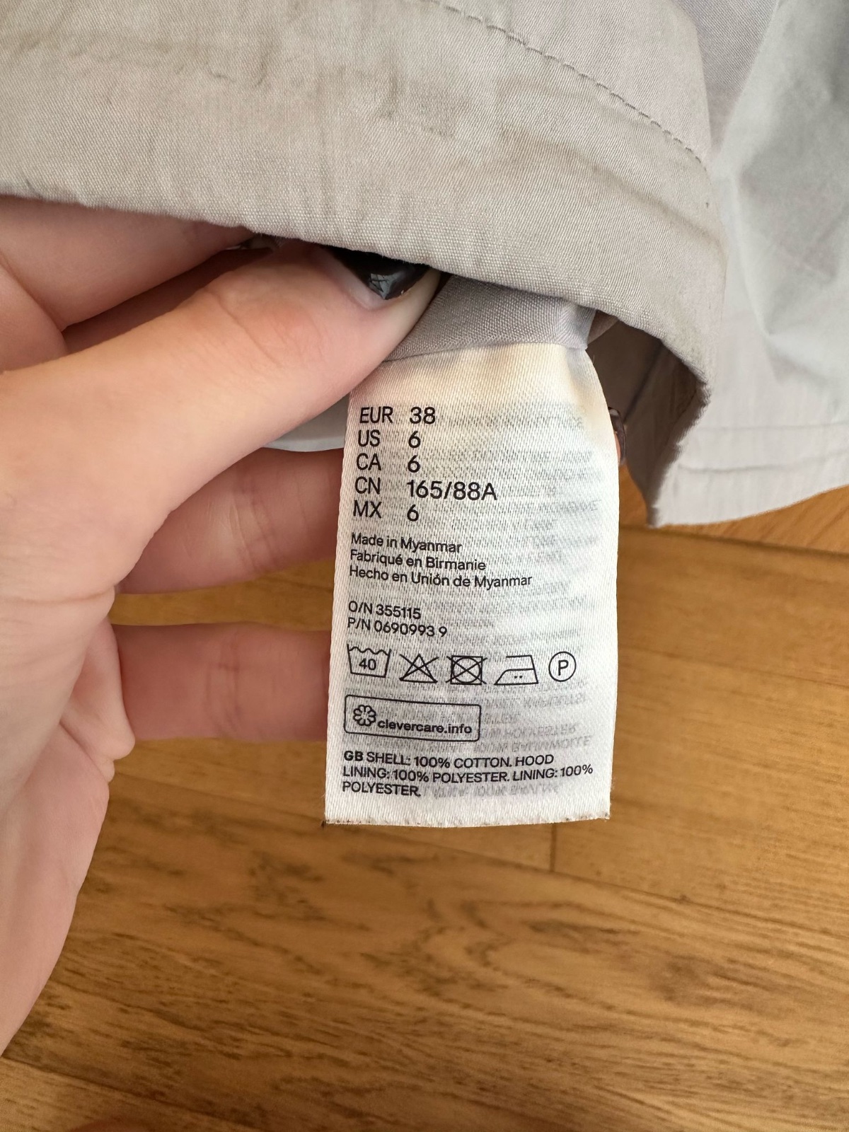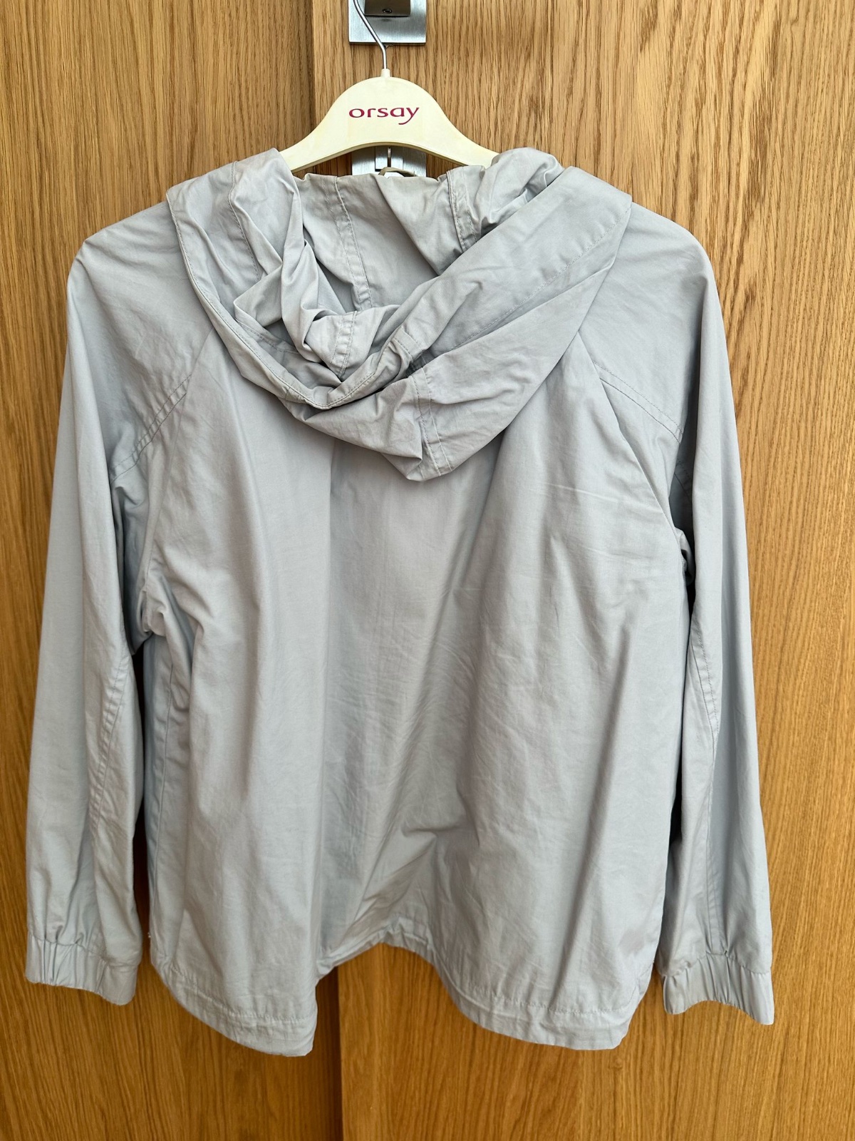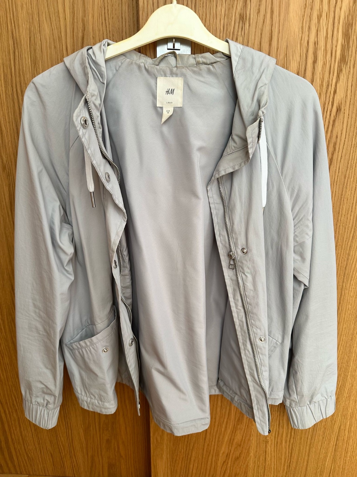 Párkrát nosená, bez poškodenia bledosiva prechodna bunda s kapucňou veľkosti 38 (M) značky H&M