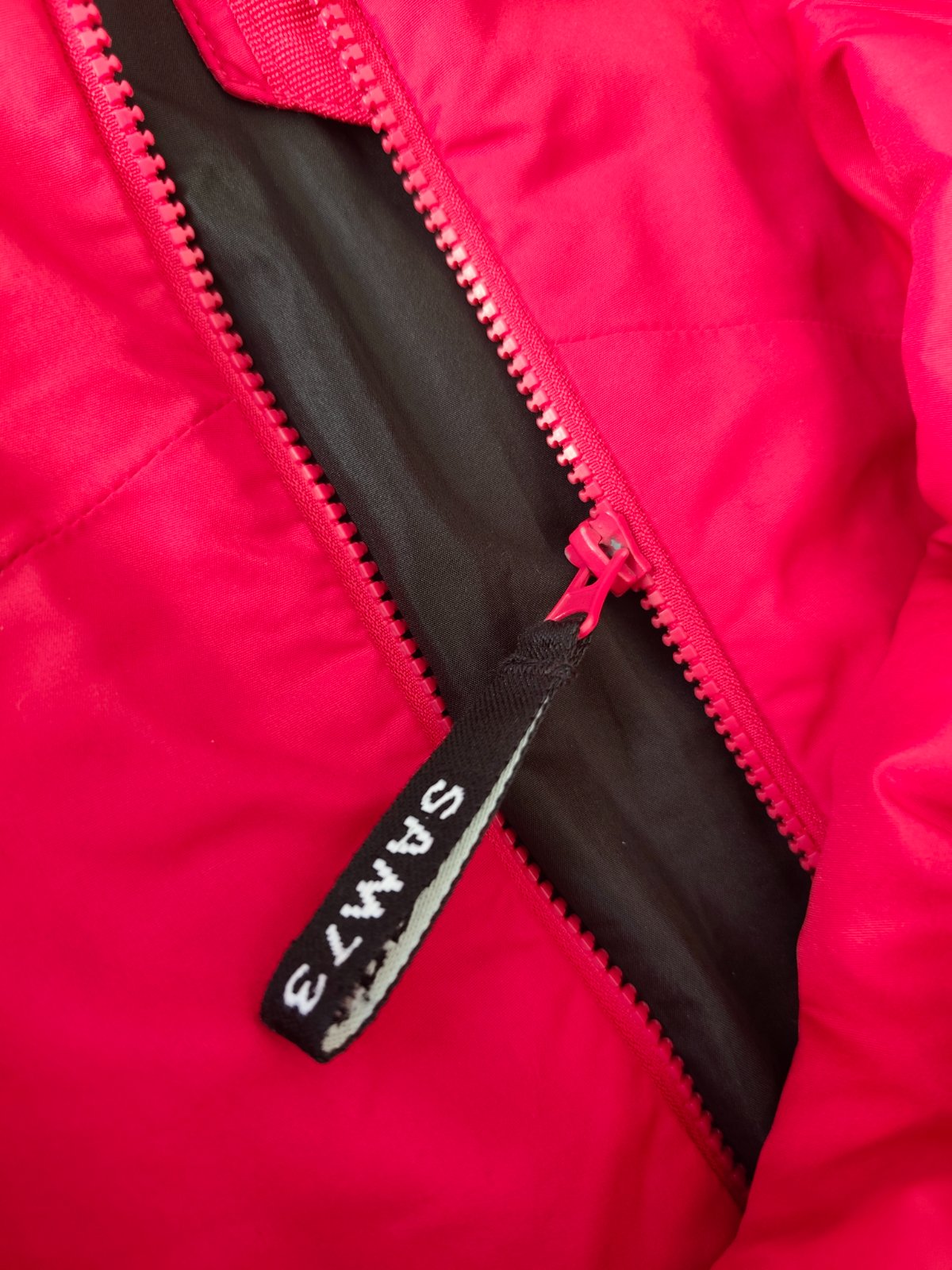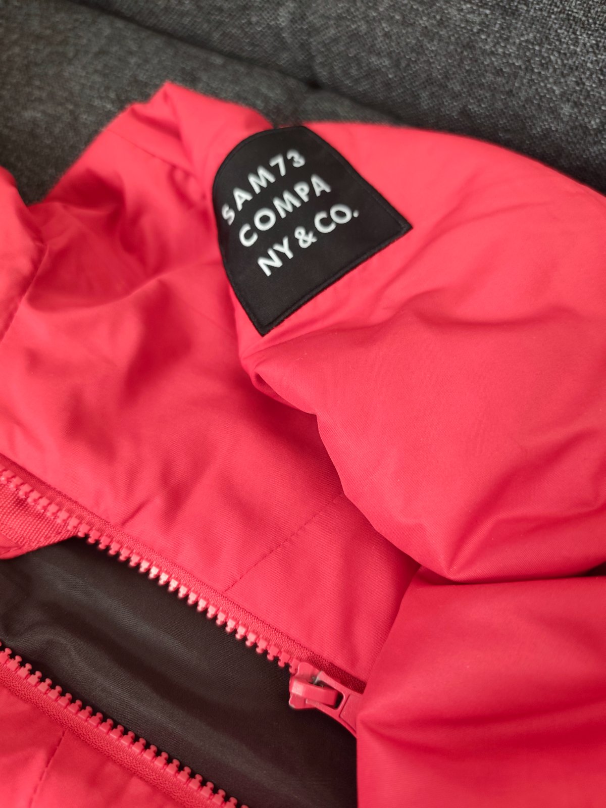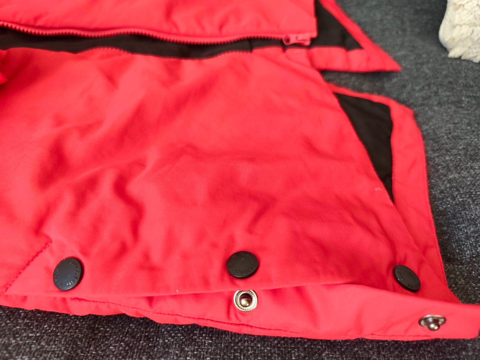 Kvalitná značková bunda Apparel, vyraznej červenej farby je vhodná na prechodné obdobie, slabšiu zimu. Ide o predĺžený strih. Vrecká, kapucňa, obojstranný zips a tiež suchý zips na upevnenie rukávov. Bunda má na bokoch v spodnej časti cviky, ktoré môže mať dieťa zapnuté alebo voľné.