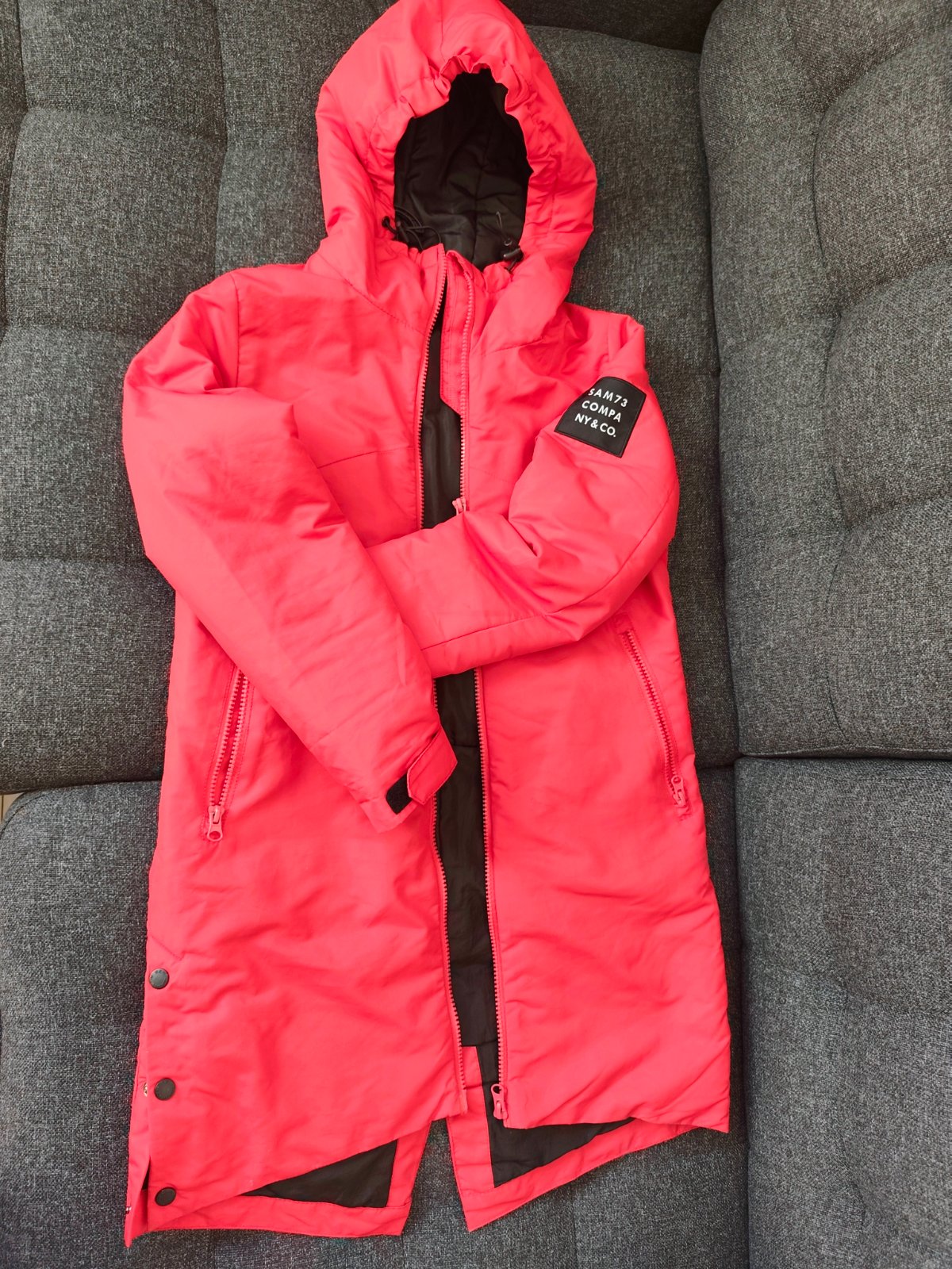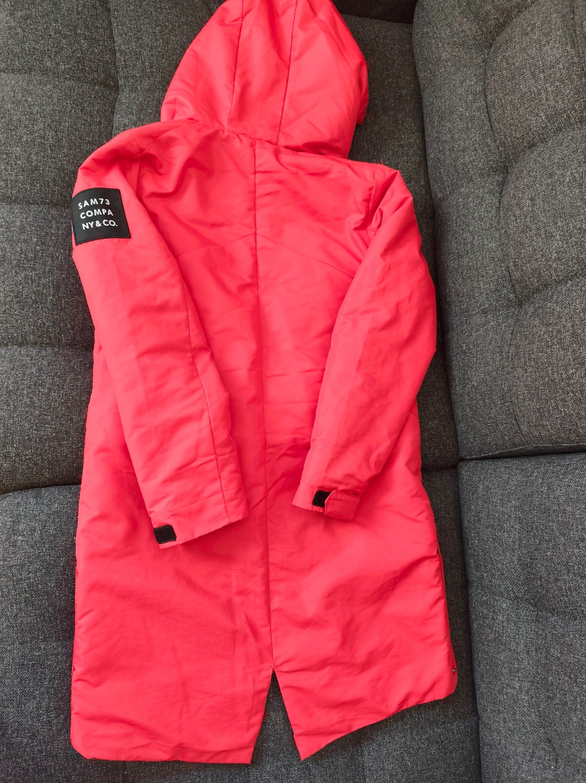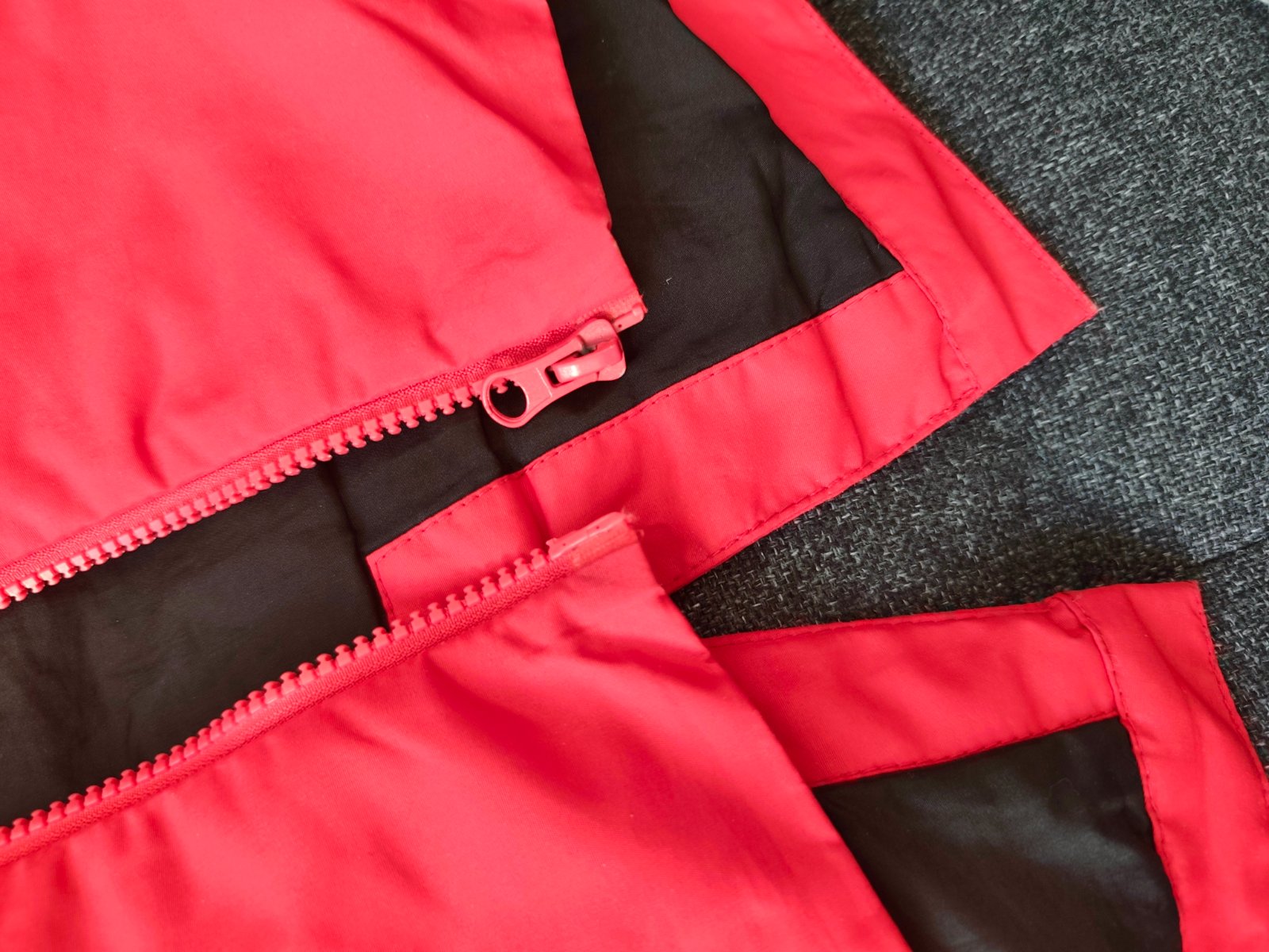Kvalitná značková bunda Apparel, vyraznej červenej farby je vhodná na prechodné obdobie, slabšiu zimu. Ide o predĺžený strih. Vrecká, kapucňa, obojstranný zips a tiež suchý zips na upevnenie rukávov. Bunda má na bokoch v spodnej časti cviky, ktoré môže mať dieťa zapnuté alebo voľné.