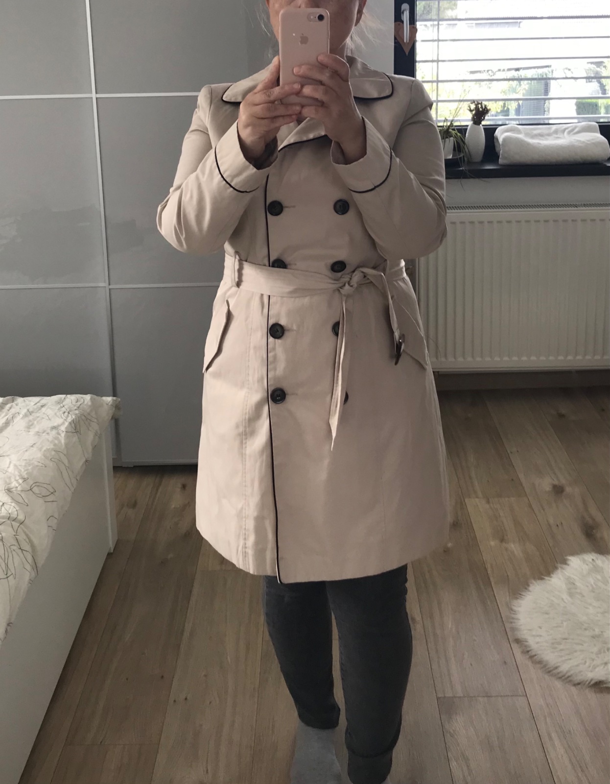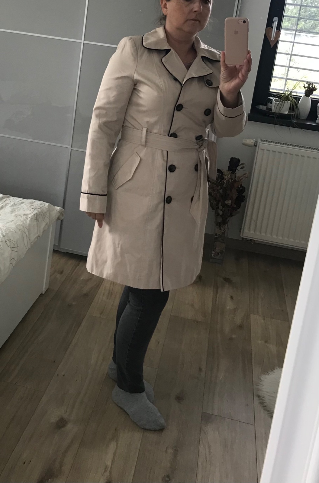 pekné sáčko/ kabátik, podšitý, pútka na opasok, po bokoch vrecká. 100% stav. Šírka popod paže je 57 x 2 cm, celková dĺžka je 70 cm - merala som cez stred chrbta, bez límca.