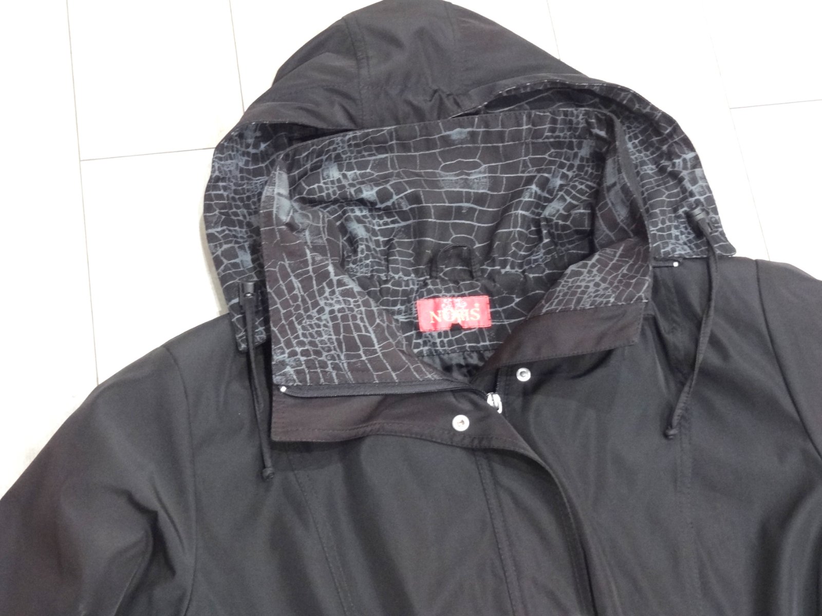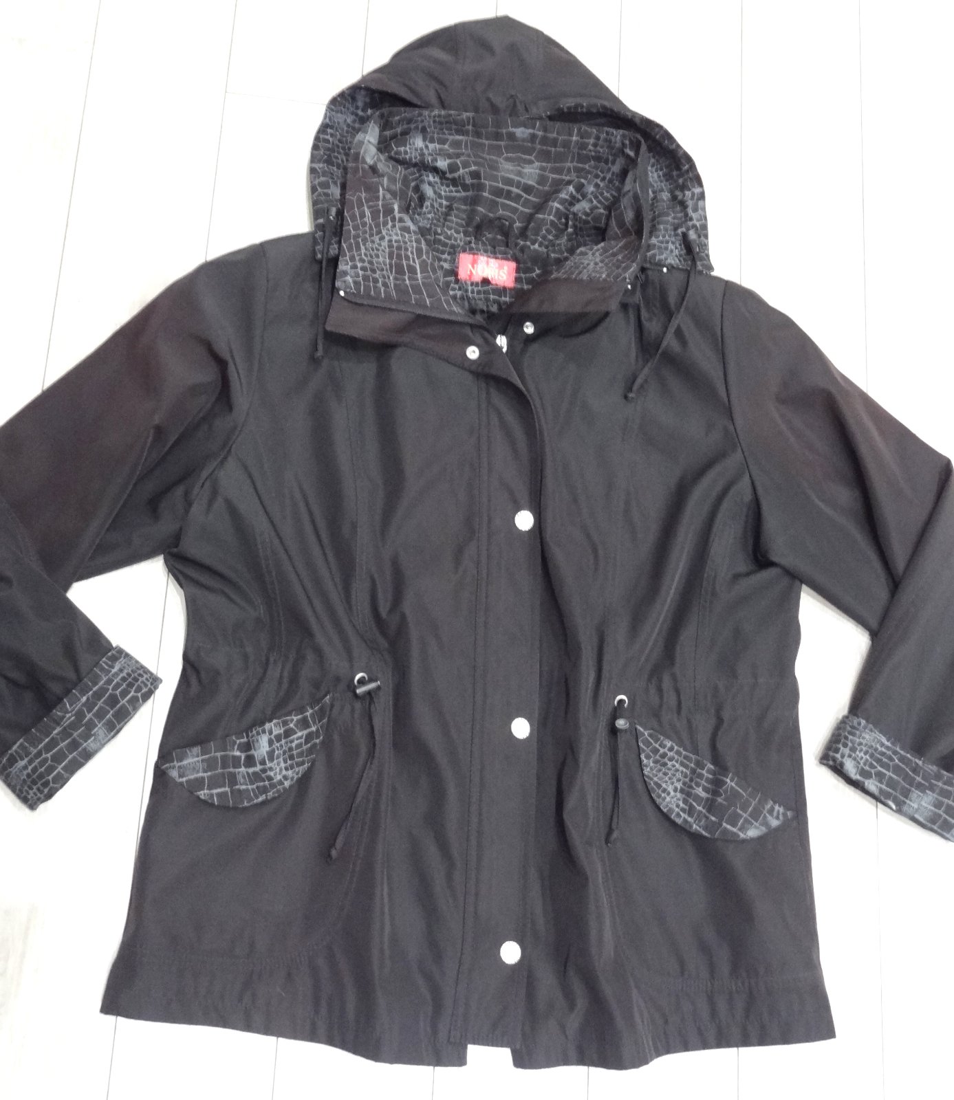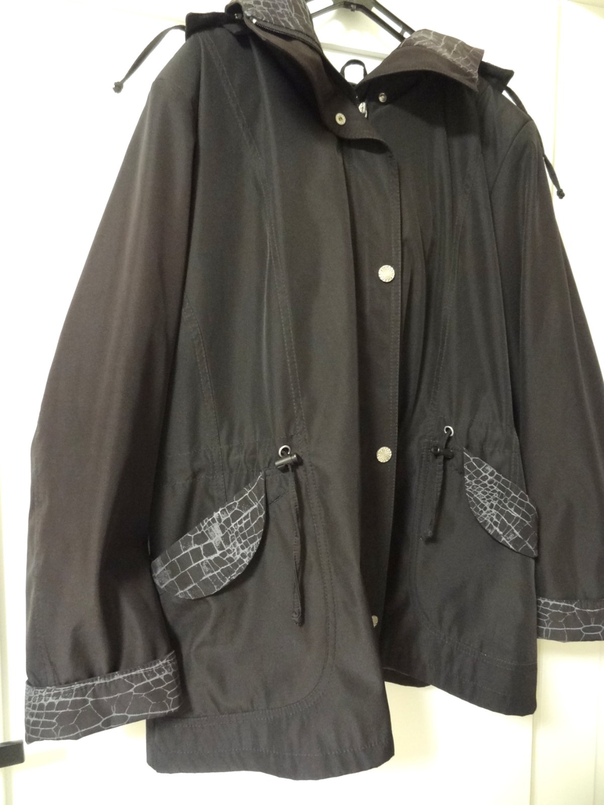 Dámska bunda vetrovka...v čiernej farbe, so vzorovaným motívom na vreckách, rukávoch, kapucni.... JAR/JESEŇ... zapínanie na zips, s vreckami, s odopínateľnou kapucou...v páse je možné ju stiahnuť ... značka: NORIS ... veľ. 50 - dlžka 84 cm, šírka pod pazuchami 69 cm, šírka pás 66 cm