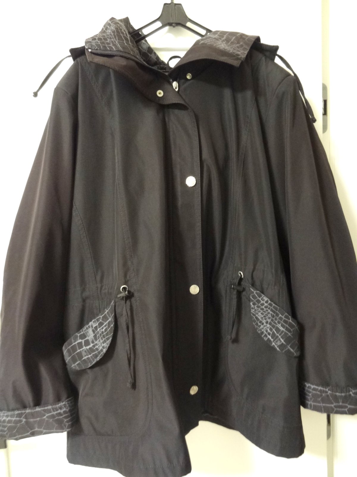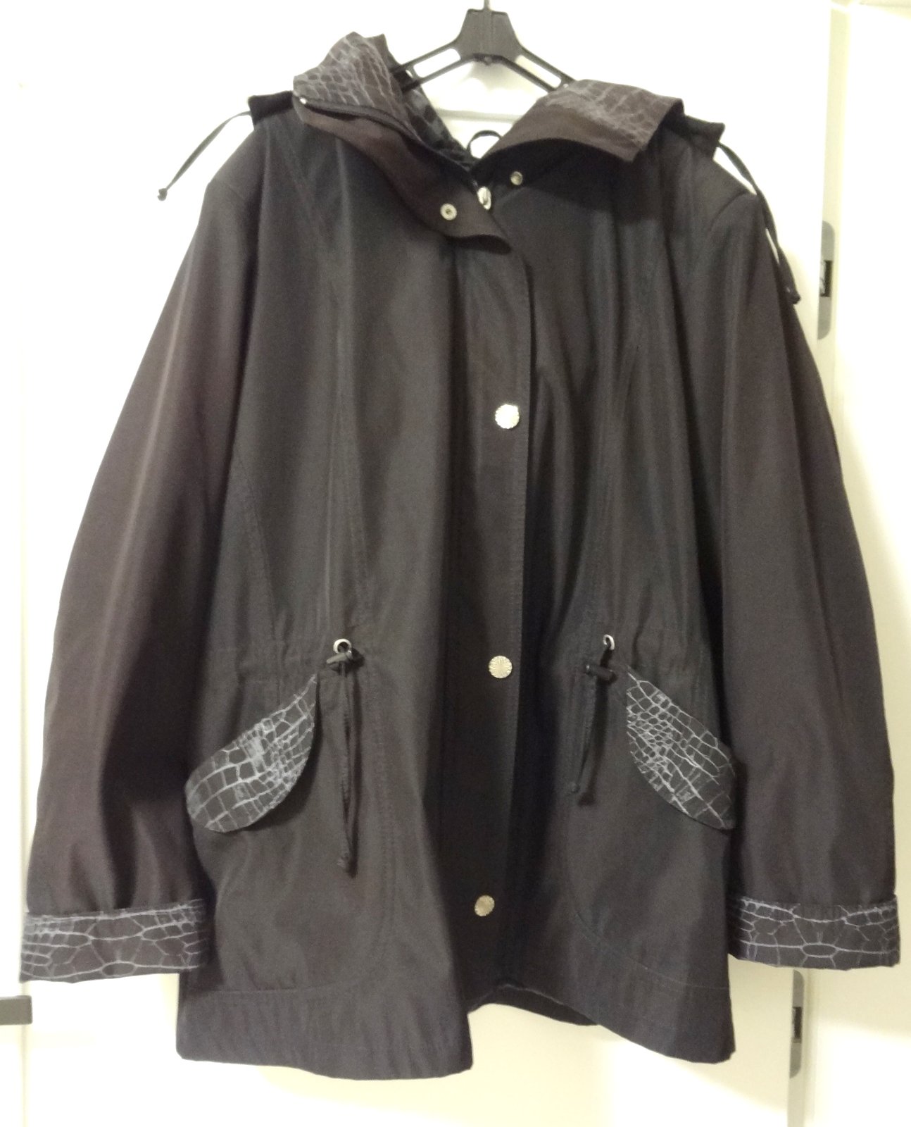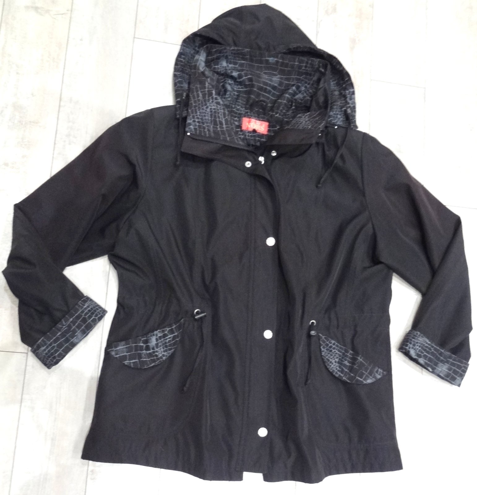 Dámska bunda vetrovka...v čiernej farbe, so vzorovaným motívom na vreckách, rukávoch, kapucni.... JAR/JESEŇ... zapínanie na zips, s vreckami, s odopínateľnou kapucou...v páse je možné ju stiahnuť ... značka: NORIS ... veľ. 50 - dlžka 84 cm, šírka pod pazuchami 69 cm, šírka pás 66 cm