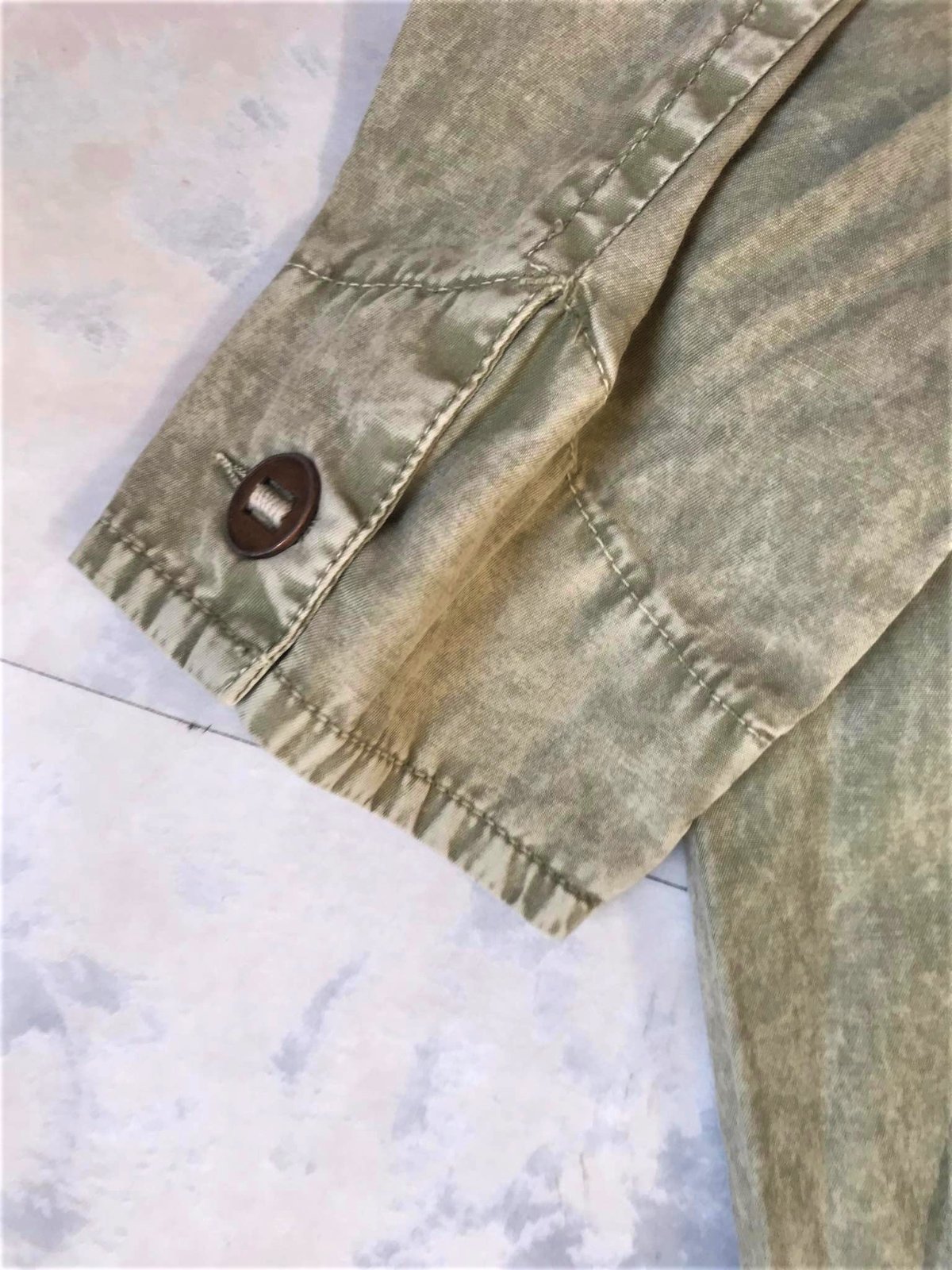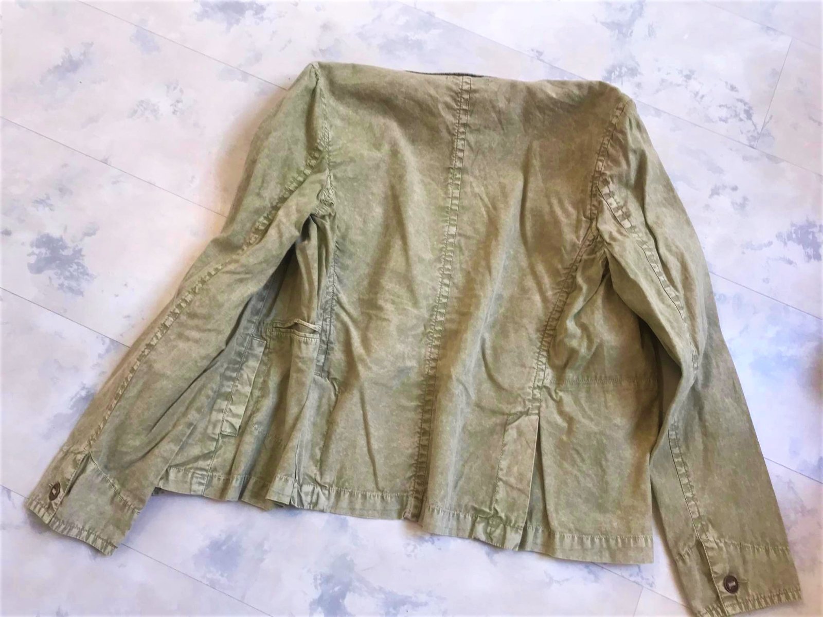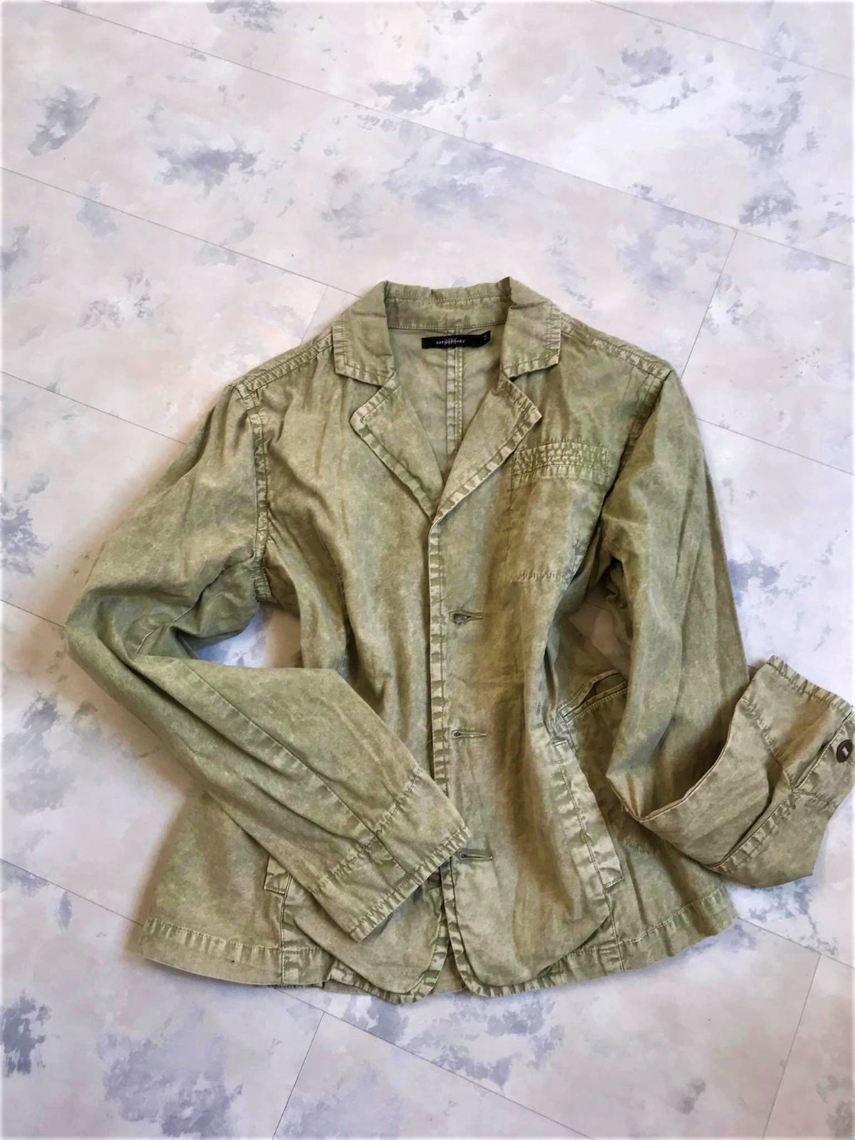 krásne neznosené trendové sako do pása,farba vyblednutá svetlá olivovo zelená - najlepšie vystihujú farbu prvé obrázky,tenké,nepodšité,materiál = 100% bavlna,upravené metódou stone wash - vykrčený obnosený vzhľad,veľmi pekné detaily,vzadu po bokoch 2 rozporky,zaujímavé šitie gombíkov,nosí sa vykrčené....je to typ ľahkého plátenného saka na leto,jeseň,jar