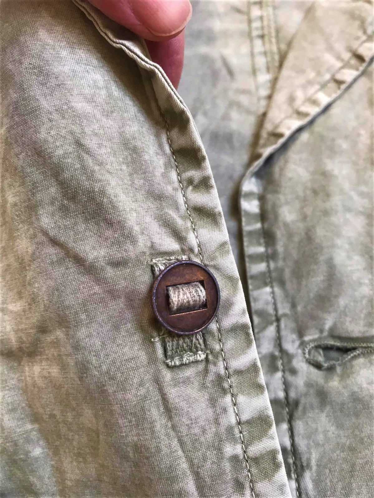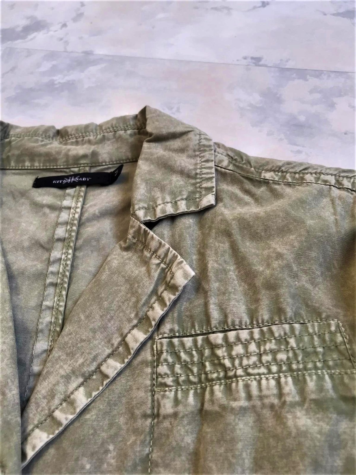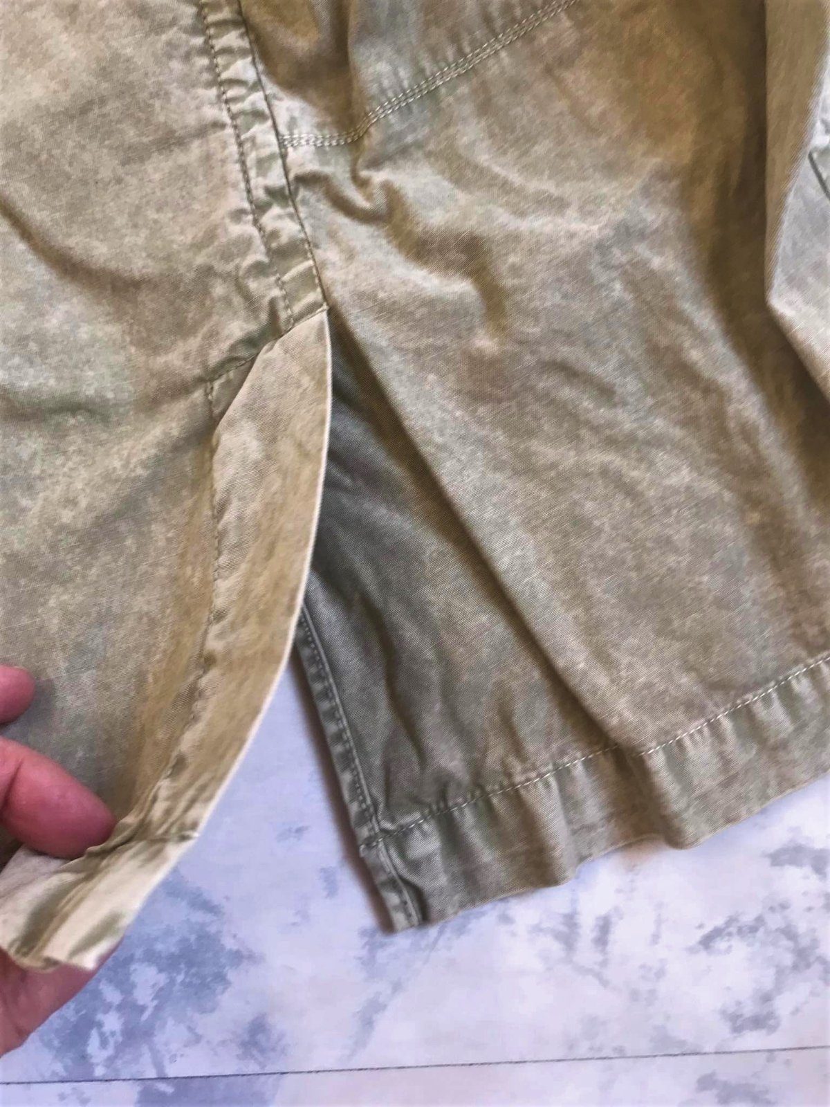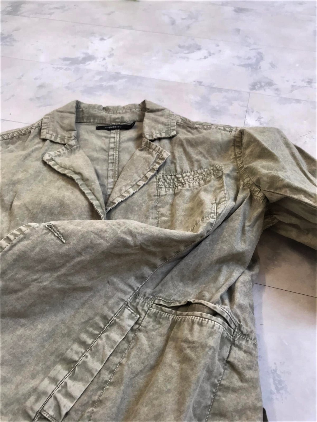 krásne neznosené trendové sako do pása,farba vyblednutá svetlá olivovo zelená - najlepšie vystihujú farbu prvé obrázky,tenké,nepodšité,materiál = 100% bavlna,upravené metódou stone wash - vykrčený obnosený vzhľad,veľmi pekné detaily,vzadu po bokoch 2 rozporky,zaujímavé šitie gombíkov,nosí sa vykrčené....je to typ ľahkého plátenného saka na leto,jeseň,jar