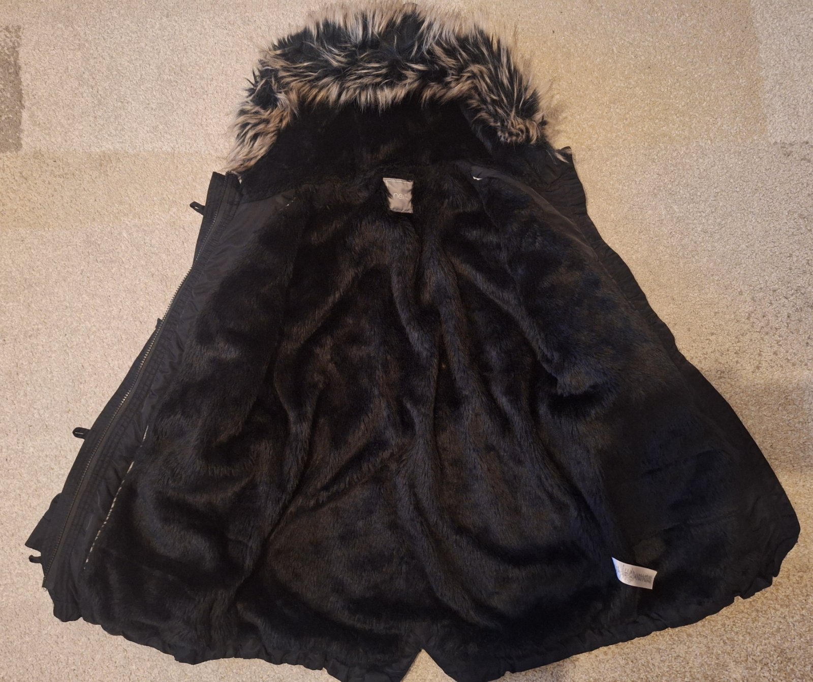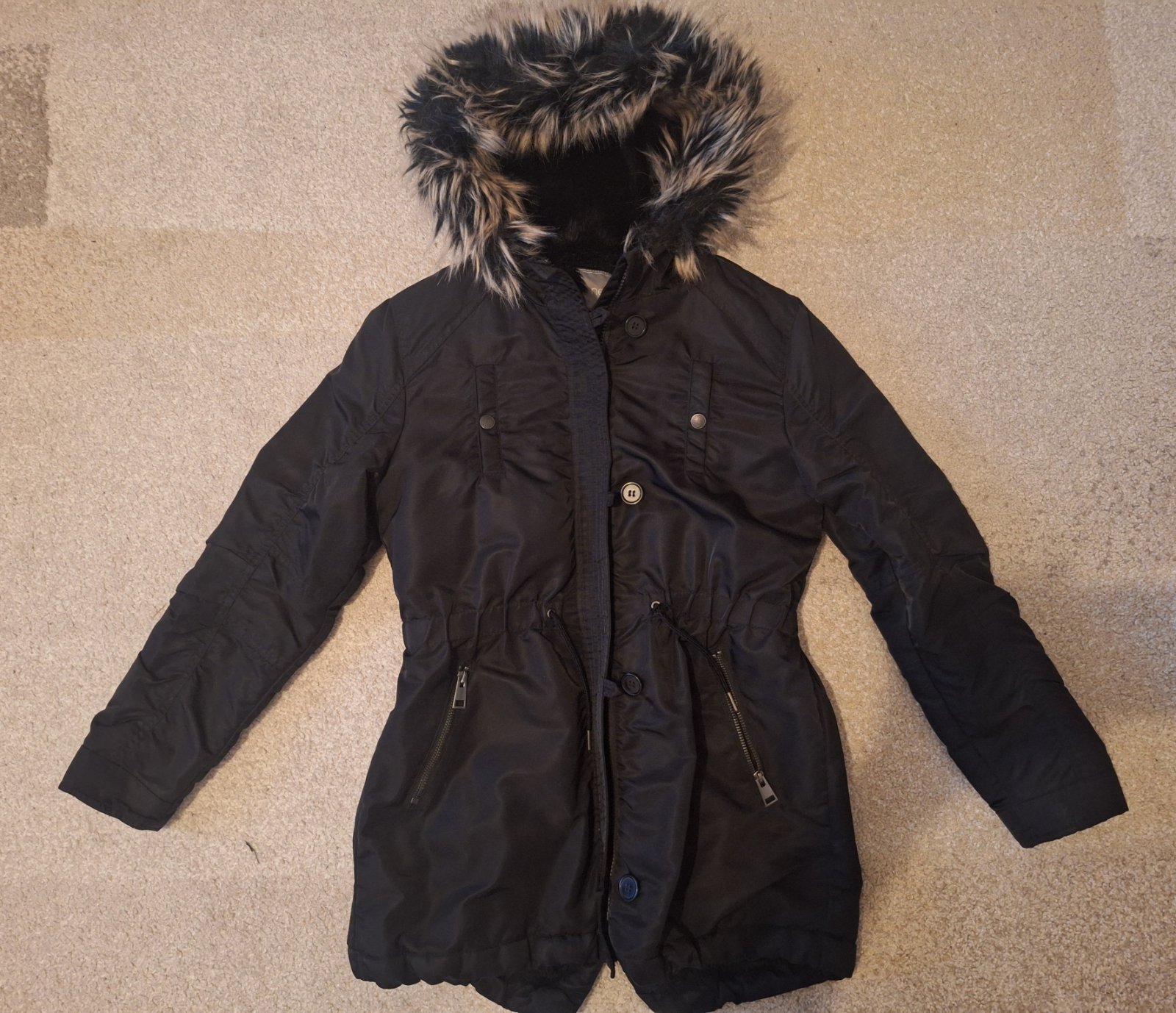 Next super teplá vetrovka, vel.152cm, 12 rokov. Podšitá umelou kožušinou. 2x vrecká na zips, v páse sa dá stiahnuť. Zapínanie na zips a gombíky. Rukáv od kapucne 65,5 cm, po šírka prsia- 48 cm,celk...