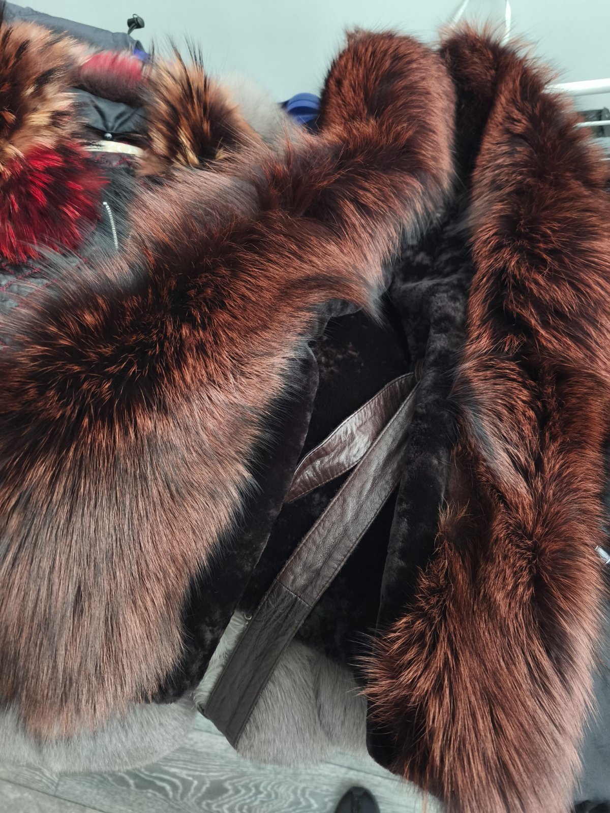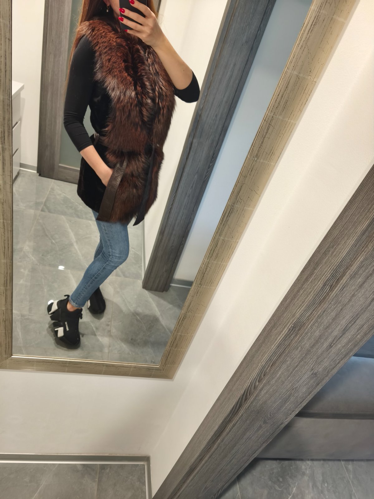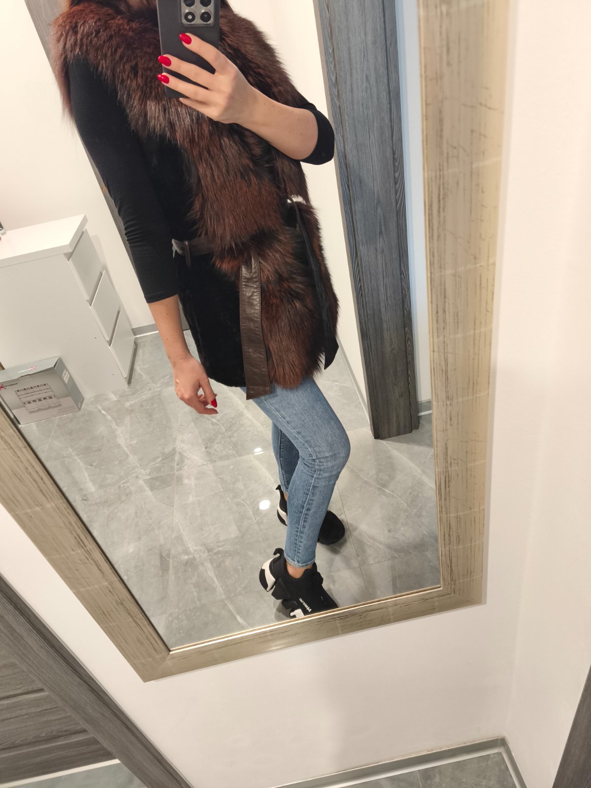 Krasny kusok bohata tepla vesta, kozusinka je luxusna dlhy chlp liska, farba cokoladovo hneda v kombinacii s hrdzavou, zapinanie ma na zips lemovana kozou v pase sa da zaviazat. Velkost uvesena M no pekne sedi S/M. Oblecena doslova 1x inak len skladovana mam vela inych nevyuzivam ju. Povodna cena bola 450€ kupovana v Polsku.