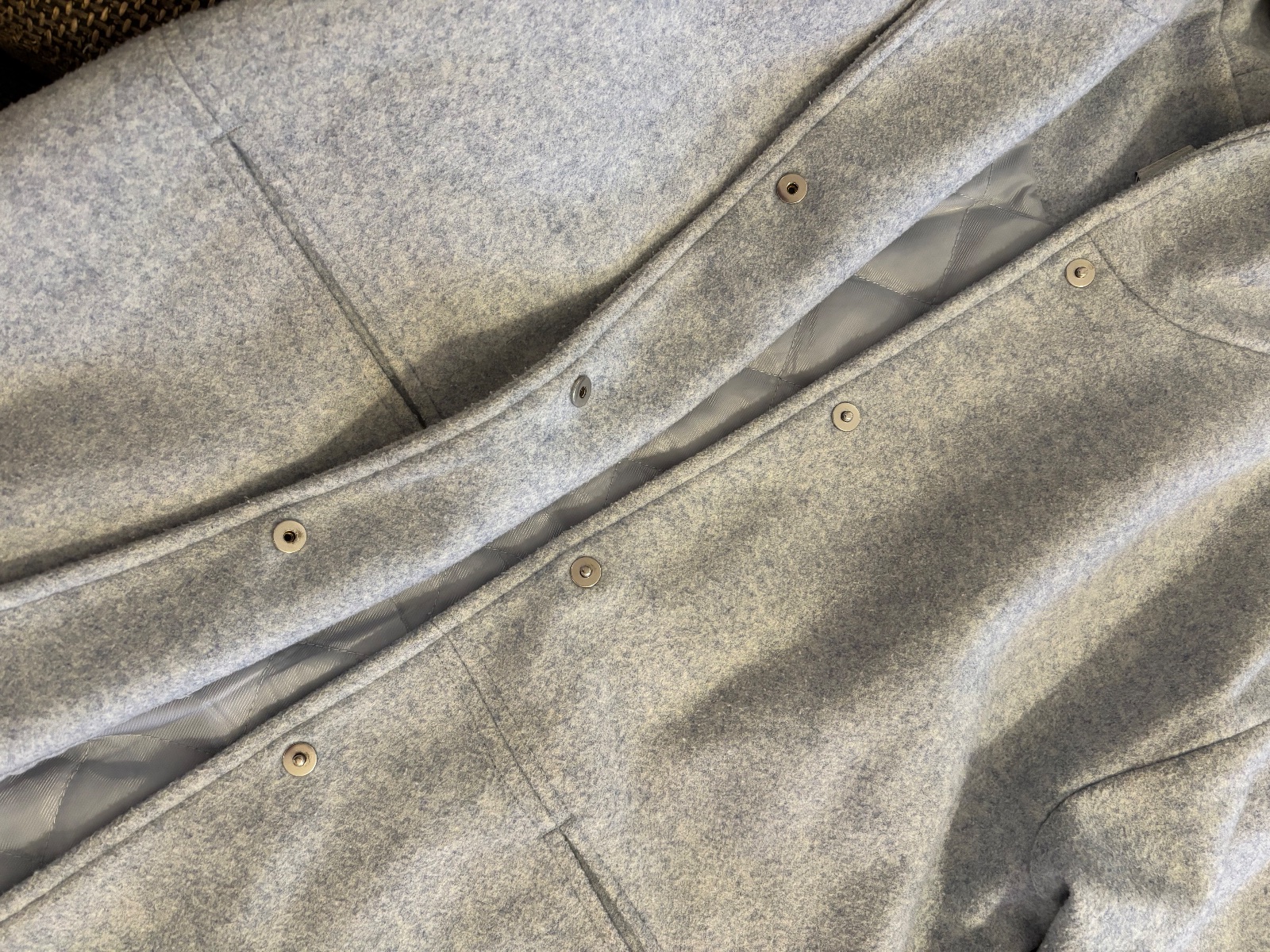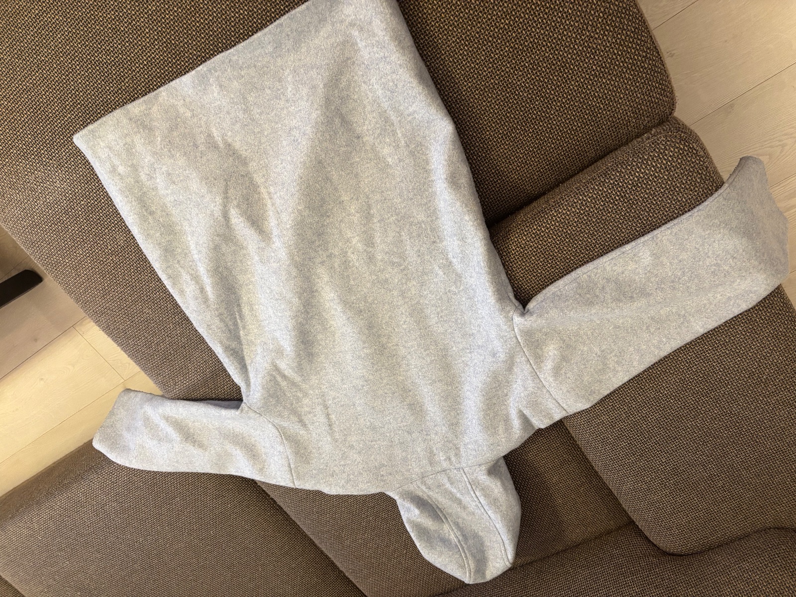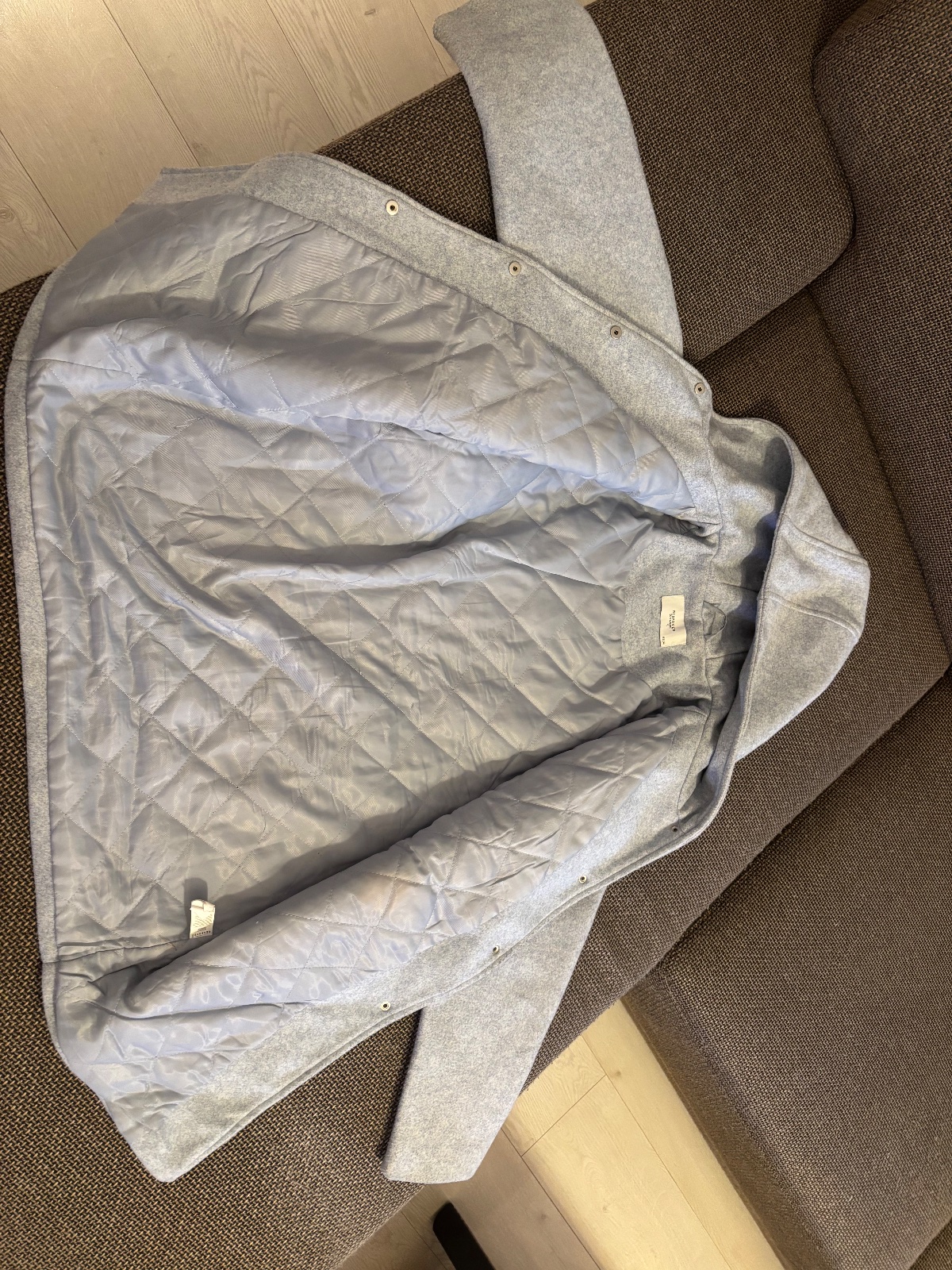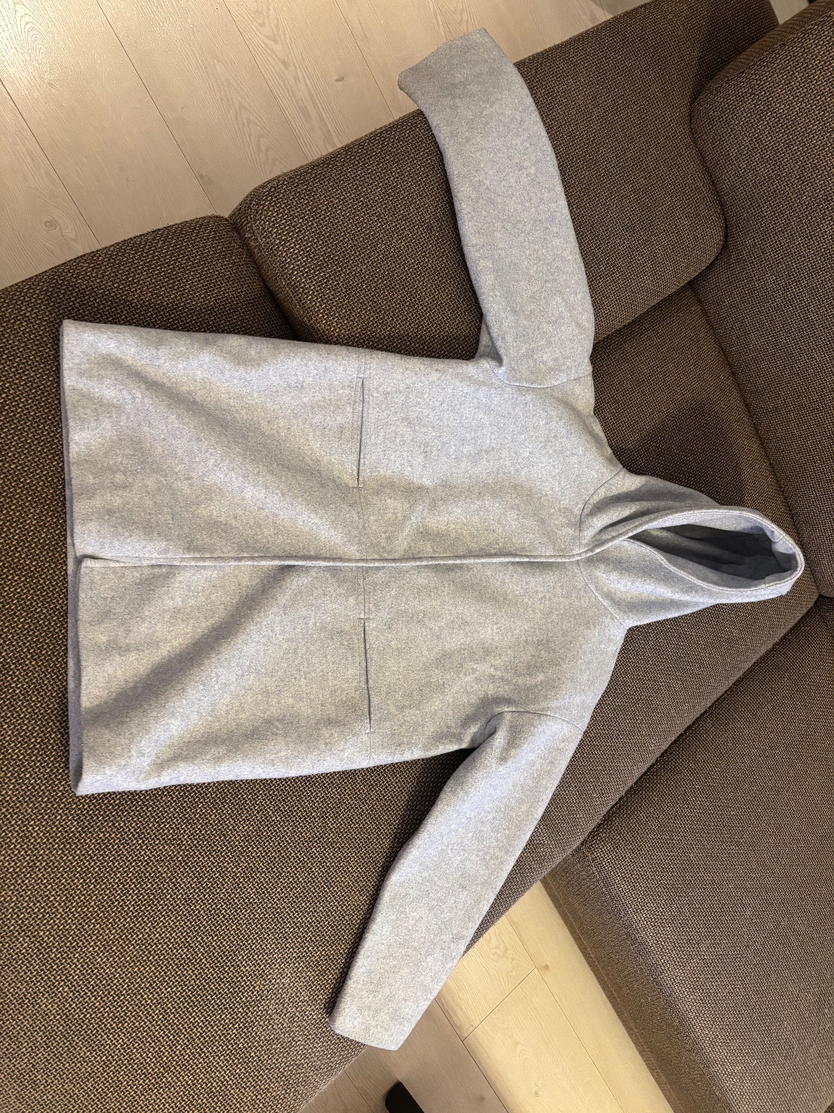 Vhodný na jeseň, jar alebo miernu zimu, farba modrošedá, voľný strih, ma zmolky.