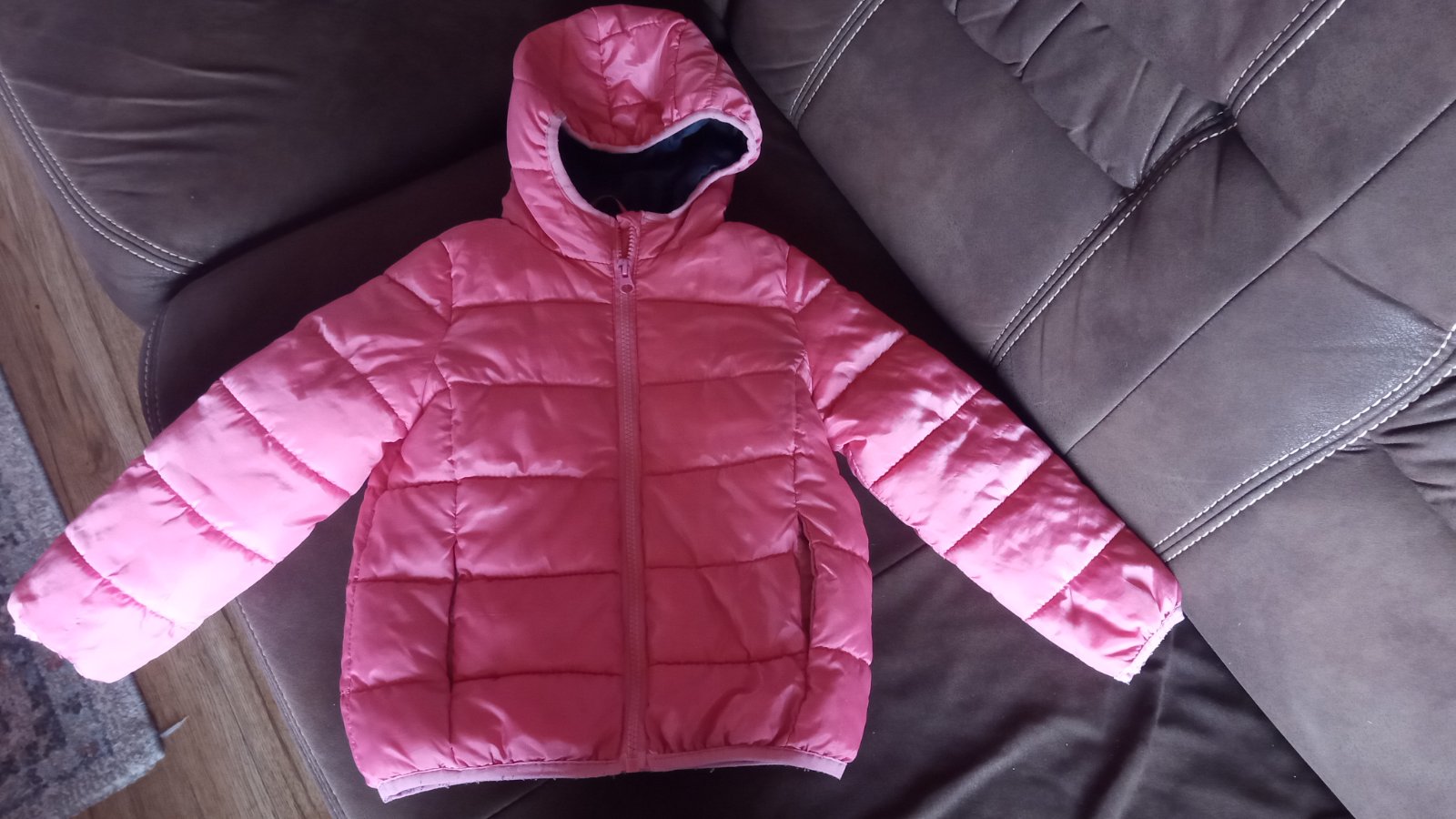 Pekná bunda bez vážnych poškodení.Je zateplená na chrbte jemným flisom.Nie je moc hrubá,takže len do teplej zimy.V páse na gumičku stiahla,takže pekná k šatom,sukni.