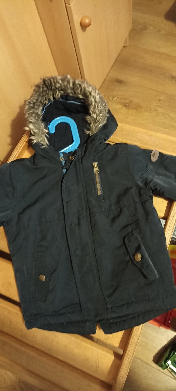 Chlapčenská hrubá zimná bunda/parka, tmavo-modrej farby. Zapína sa skrytým zipsom a cvokmi. Má neodnímateľnú kapucňu, ktorá je olemovaná kožušinou, ochranu na bradu a okolo celého krku úpletový pat...