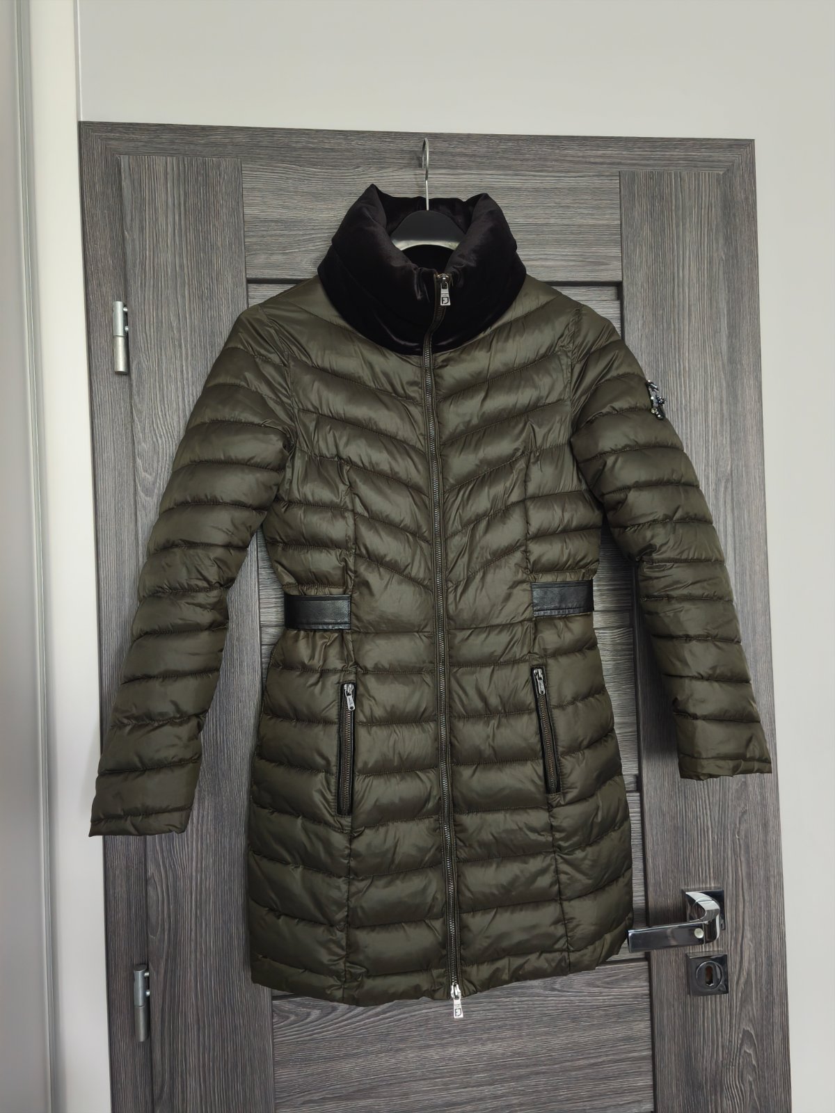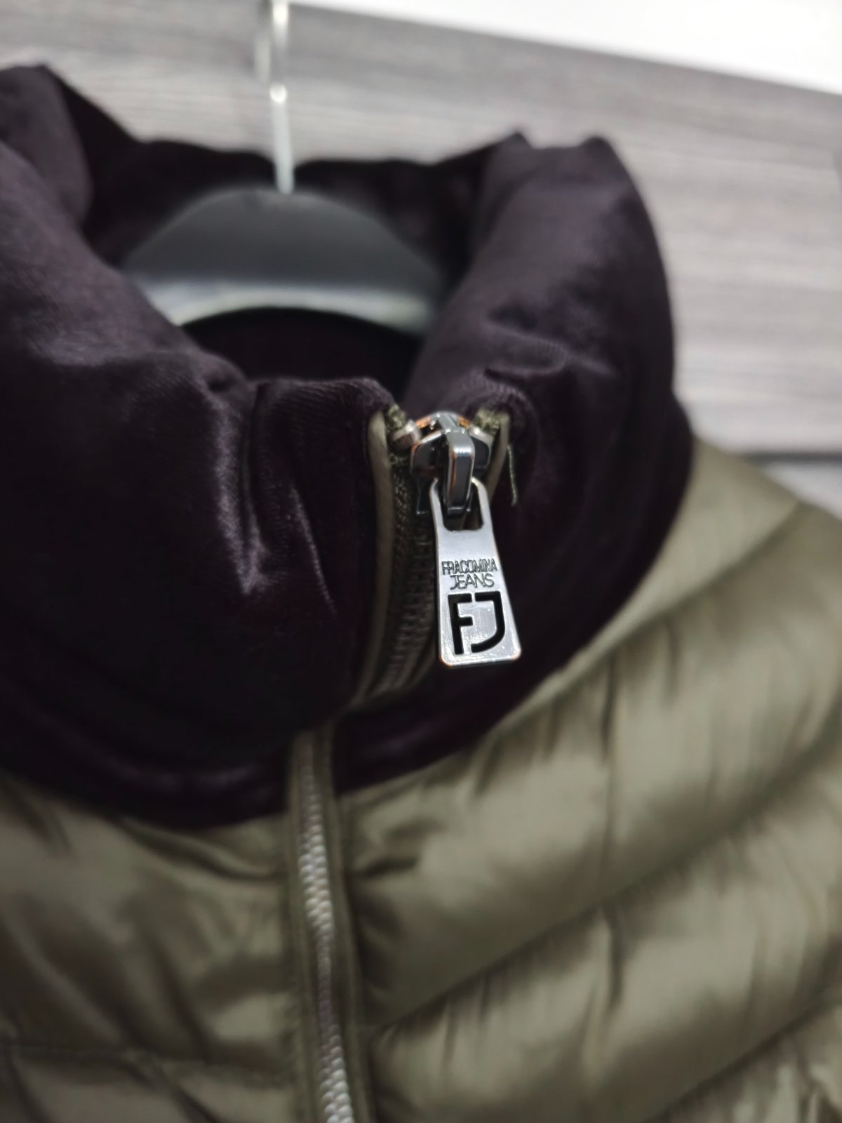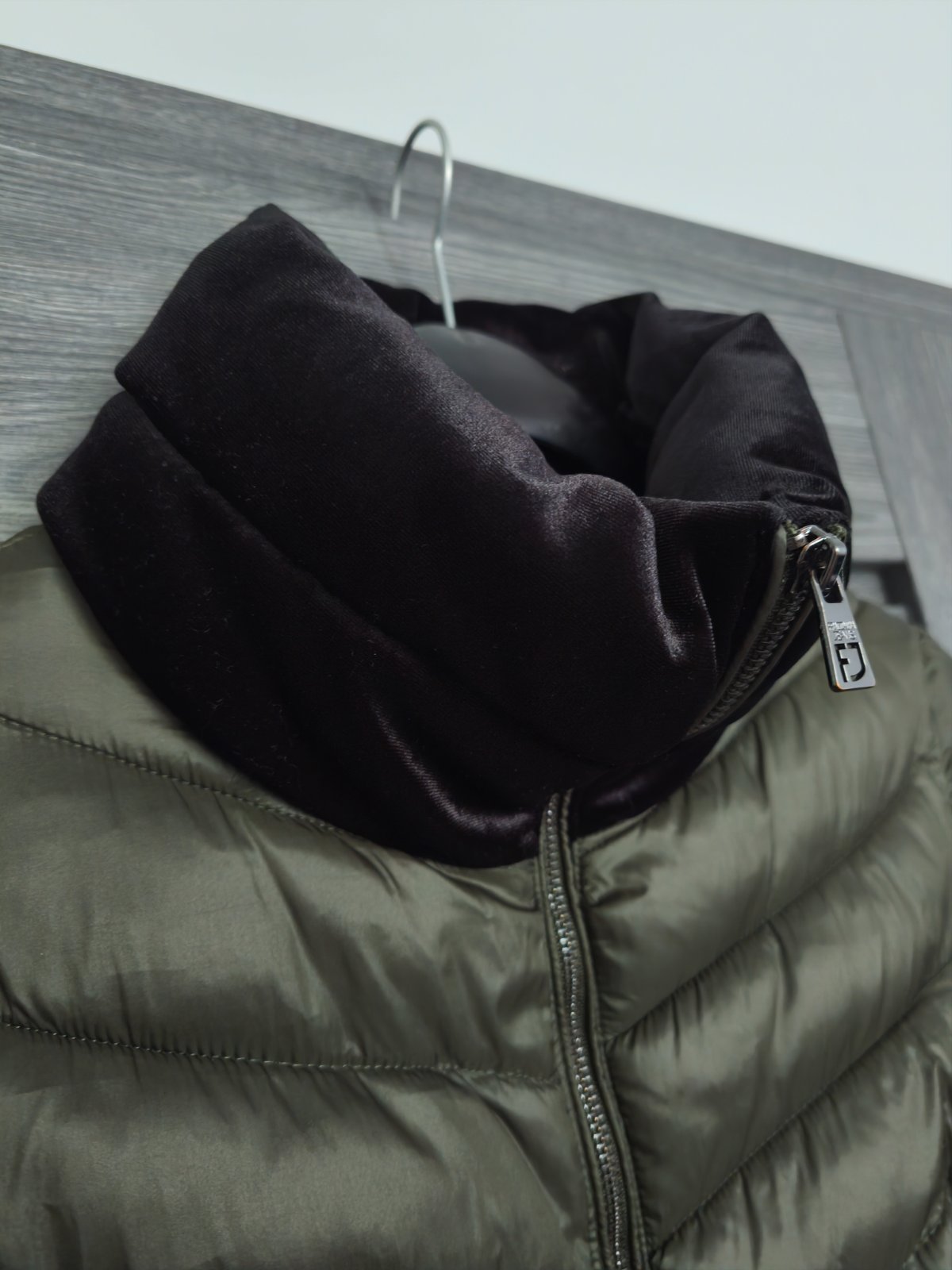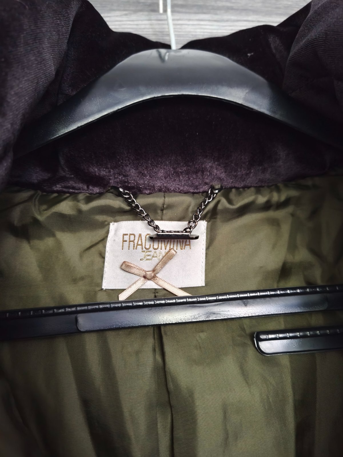 Nadherna bundicka luxusnej znacky Fracomina v krasnej olivovo-zelenej farbe v kombinacii so zamatovym vrchom a kozenkovymi detailami. Nosena na striedacku s vela inymi, krasne tvaruje postavu. Je tepla takze kludne na zimu. Jedina chybicka krasy ktora pri noseni ani nie je vidiet ze okolo vreciek sa kozenka zacina troska supat, je to vidiet len detailne. Preto aj cena prispsobena, povodna bola 250€.