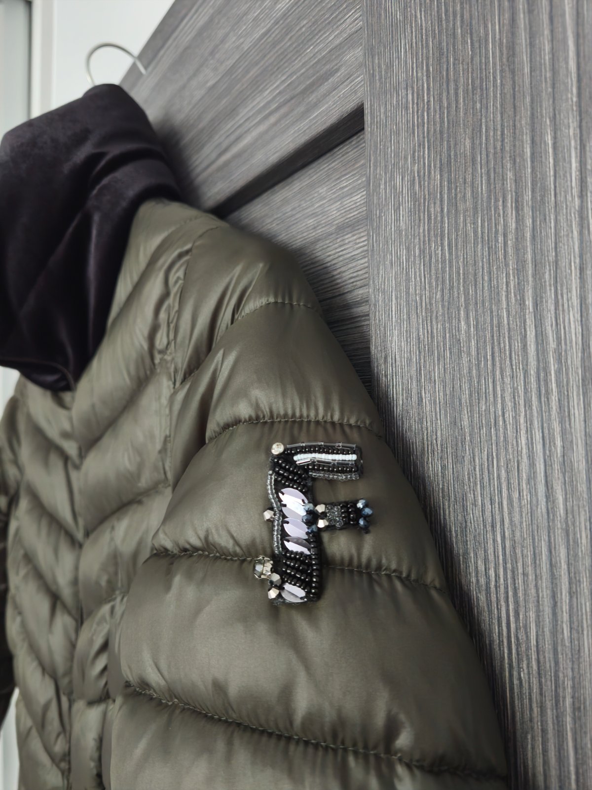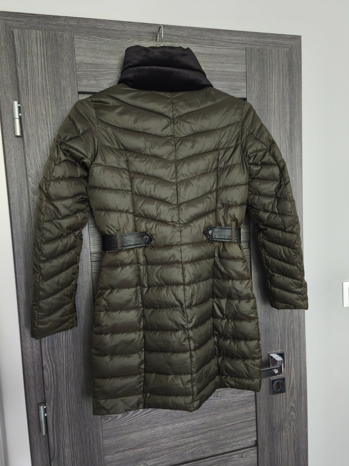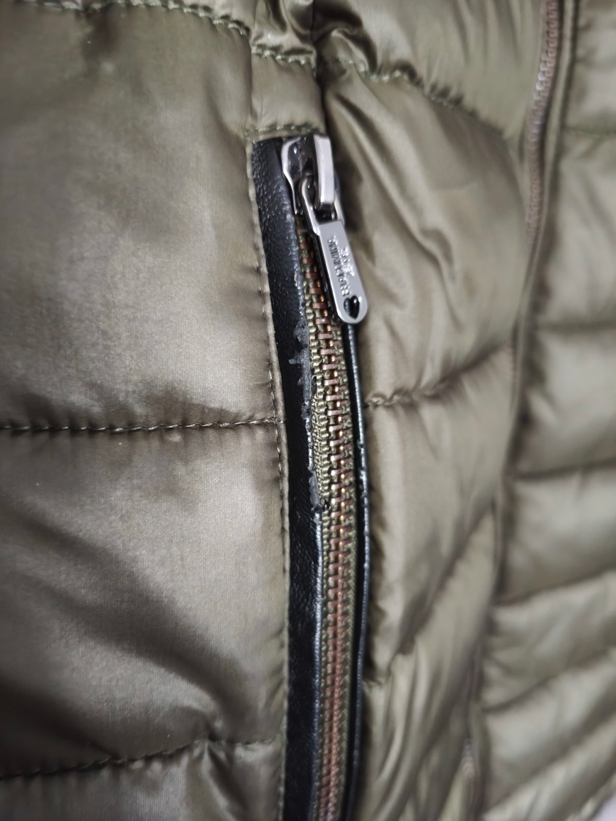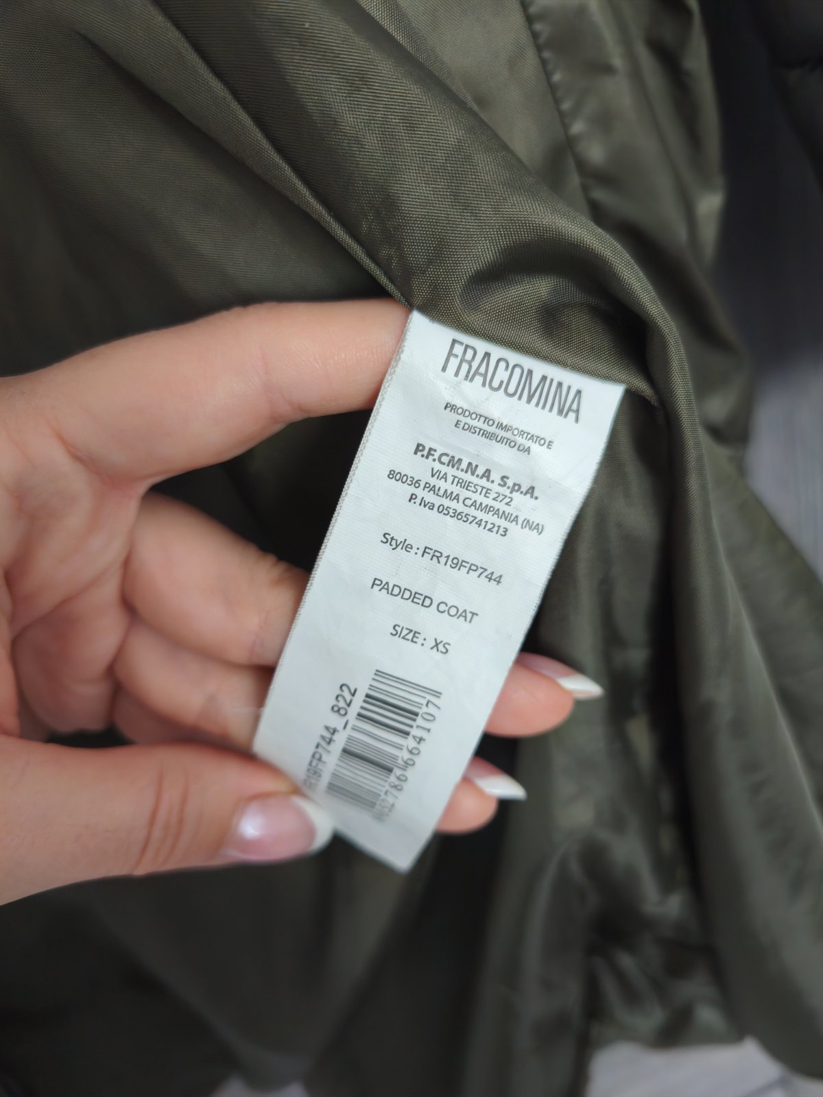 Nadherna bundicka luxusnej znacky Fracomina v krasnej olivovo-zelenej farbe v kombinacii so zamatovym vrchom a kozenkovymi detailami. Nosena na striedacku s vela inymi, krasne tvaruje postavu. Je tepla takze kludne na zimu. Jedina chybicka krasy ktora pri noseni ani nie je vidiet ze okolo vreciek sa kozenka zacina troska supat, je to vidiet len detailne. Preto aj cena prispsobena, povodna bola 250€.