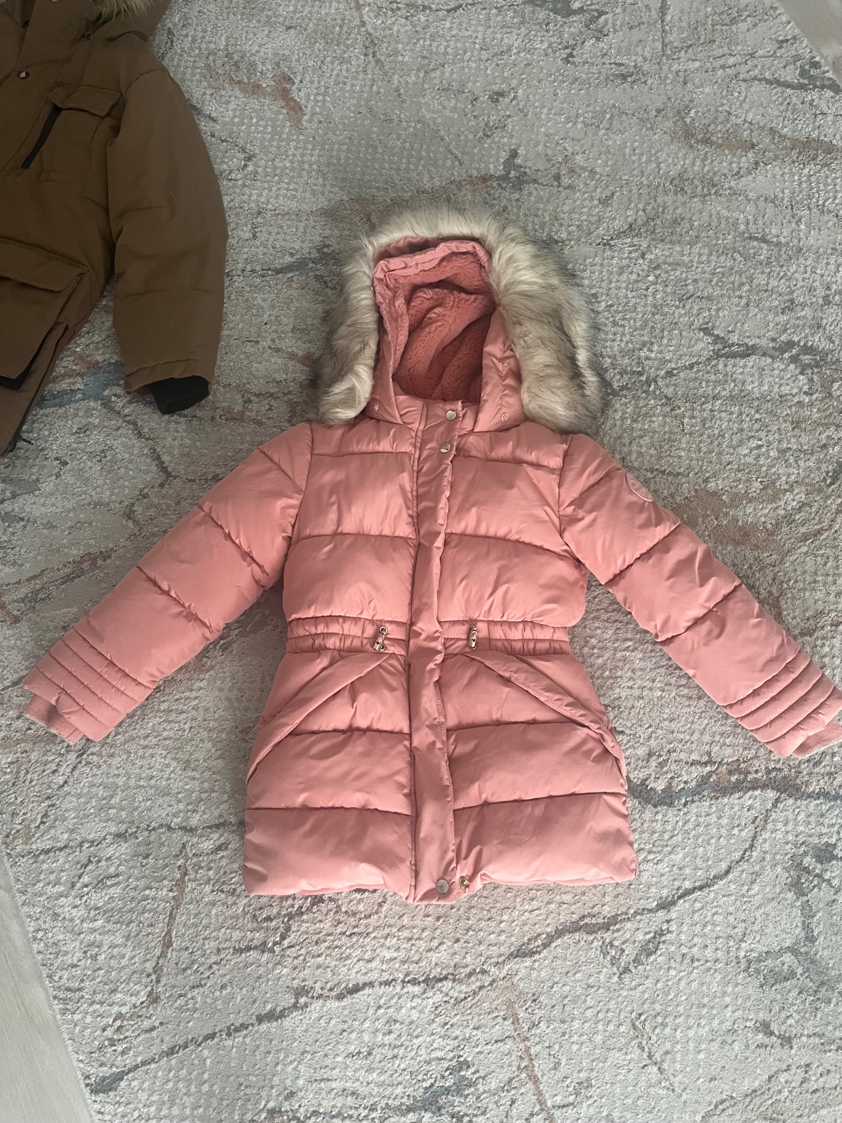 Predám dievčensku zimnu vetrovku zn.F&F, veľkosť 6 -7rokov. Je nosena, ale v peknom stave a ešte poslúži. Je bledo ružovej farby s kvietkami, okolo kapucne je jemná kožušinka. Teplá, podsita, kapuc...