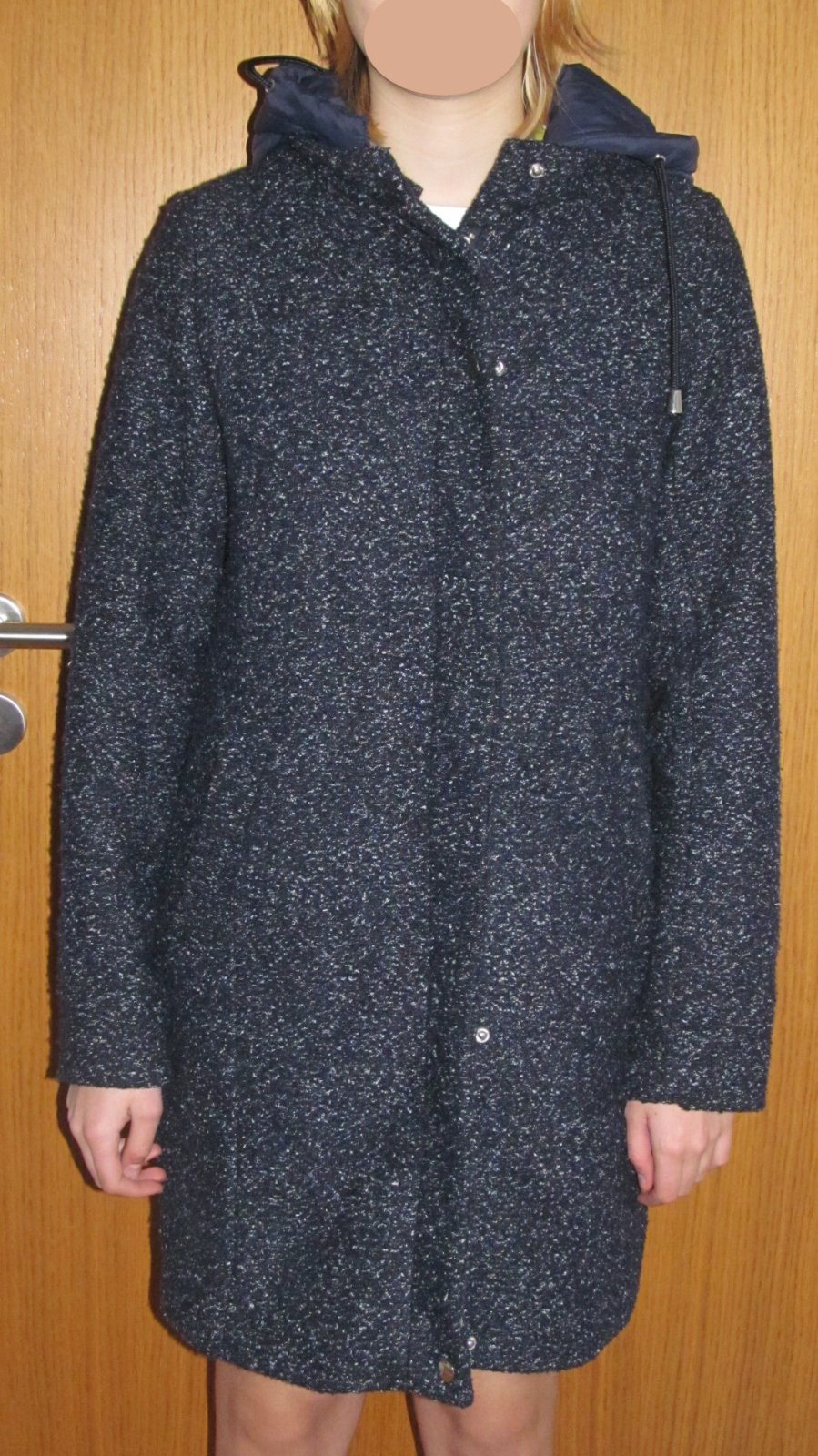 noseny 1 sezonu, uz je dcere uzsi, v dobrom nosenom stave. Material je hrubsie buocle , preto tazko posudit, co su zmolky a co boucle :) Poskodenia nema. Je podsity sustiakom, so zapinanim na zips, ktory je prekryty legou na cvoky. Kapucna je odopinatelna zipsom z vatovaneho sustiaku a so snurkou na zatiahnutie. 2 vrecka. rukav bez prieramku 63 cm, prieramok po stojacik 8 cm, dlzka od pleca 84 cm, sirka pod pazuchou 49, dole o par cm viac.