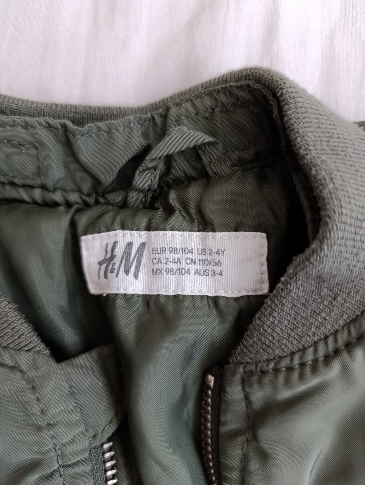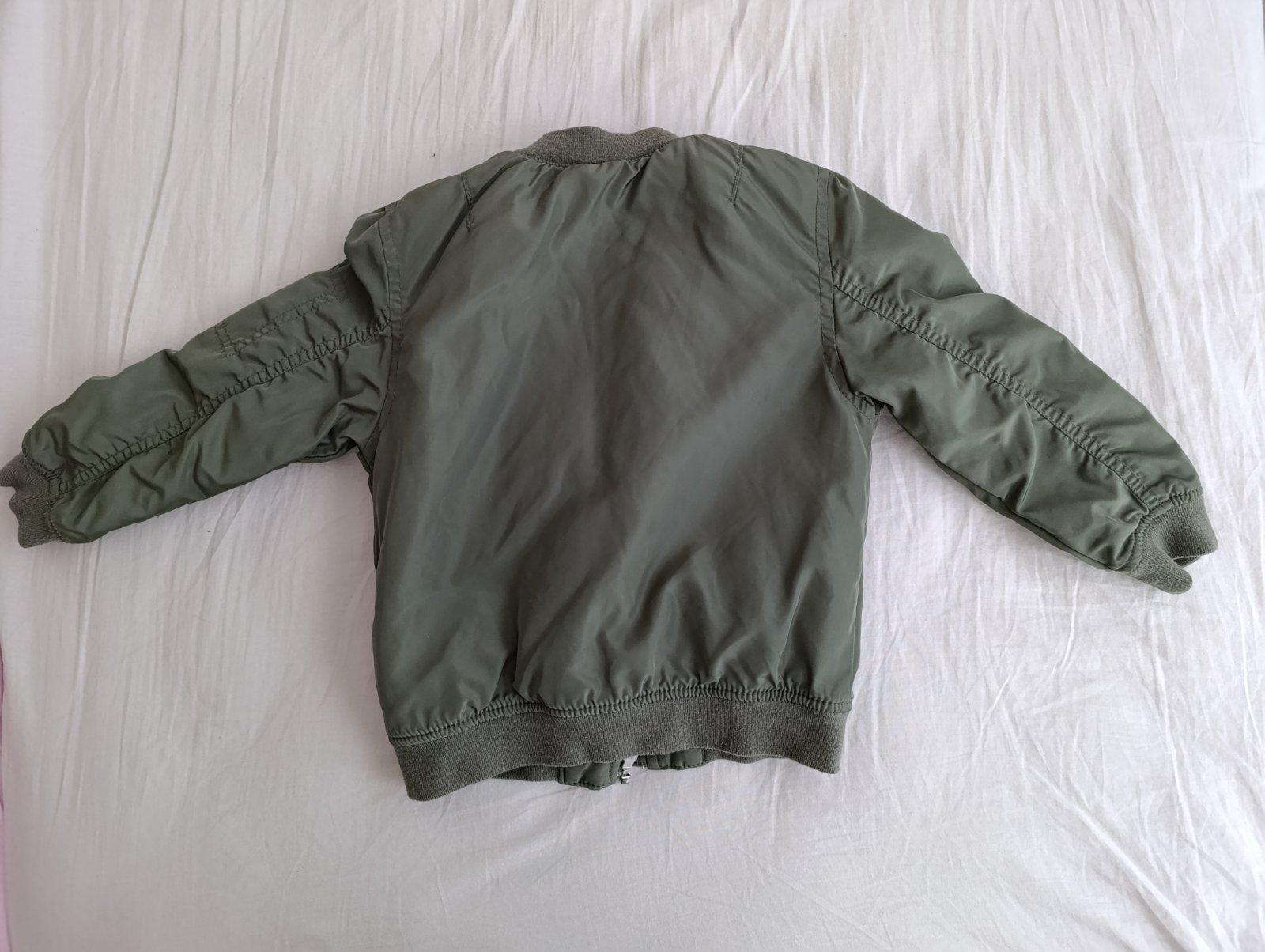 Predám zateplenú bombéročku H&M, veľ. 4-5, khaki farba, s patentami na rukávoch. Dĺžka 42 cm, rukávik 46 cm od krku, hrudníček 76 cm. V super stave, akurát vedľa pravého predného vrecka má kúštik r...