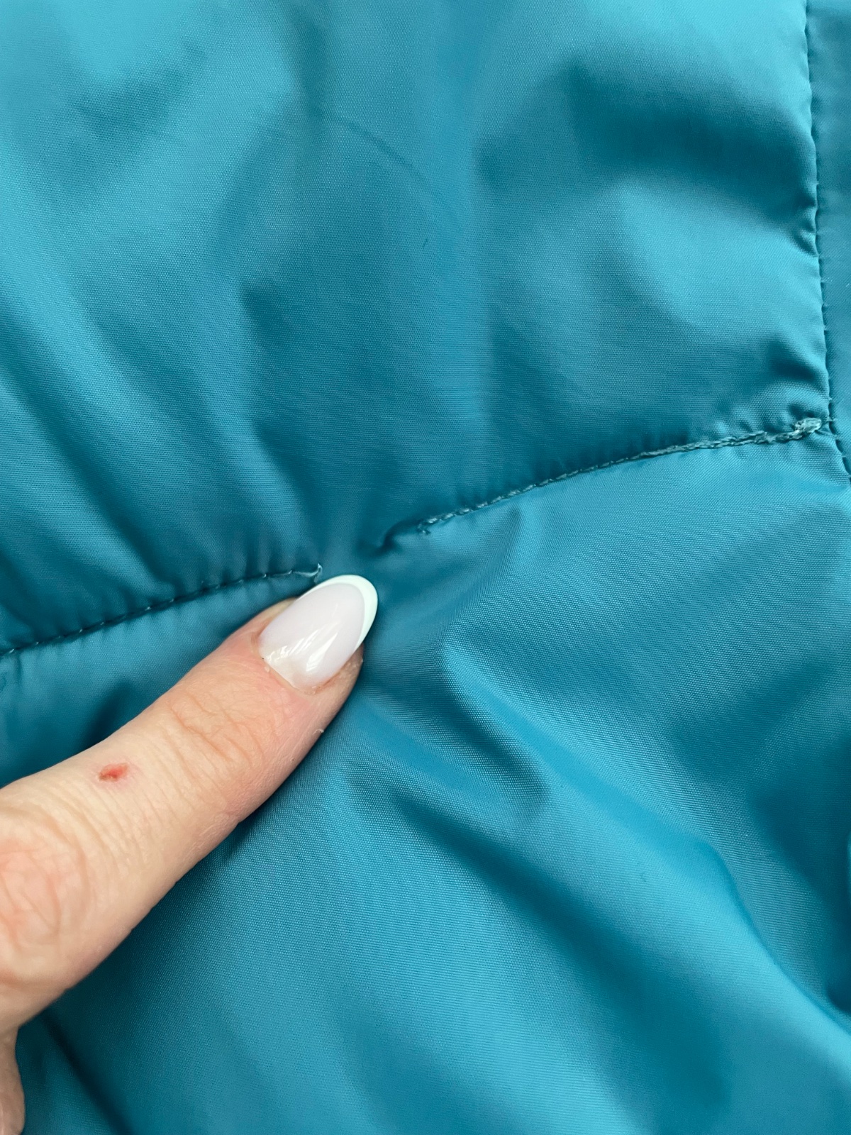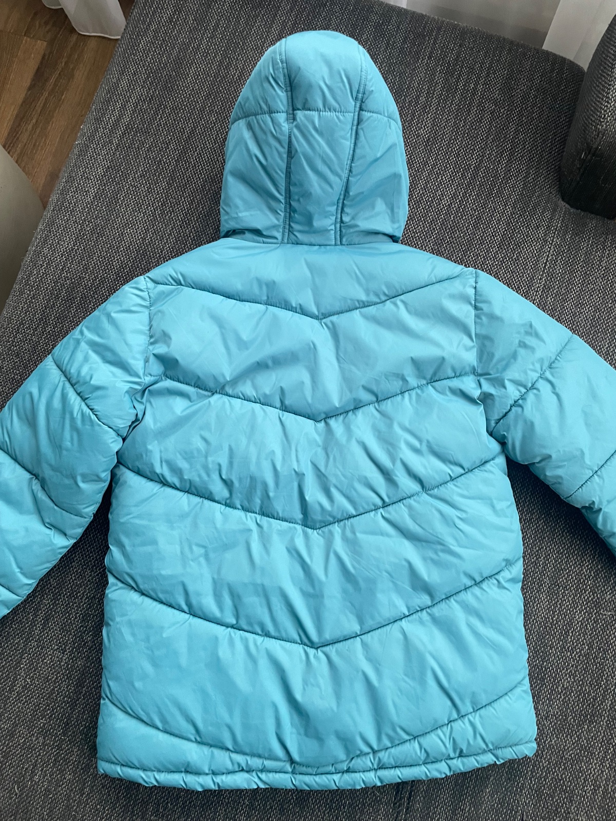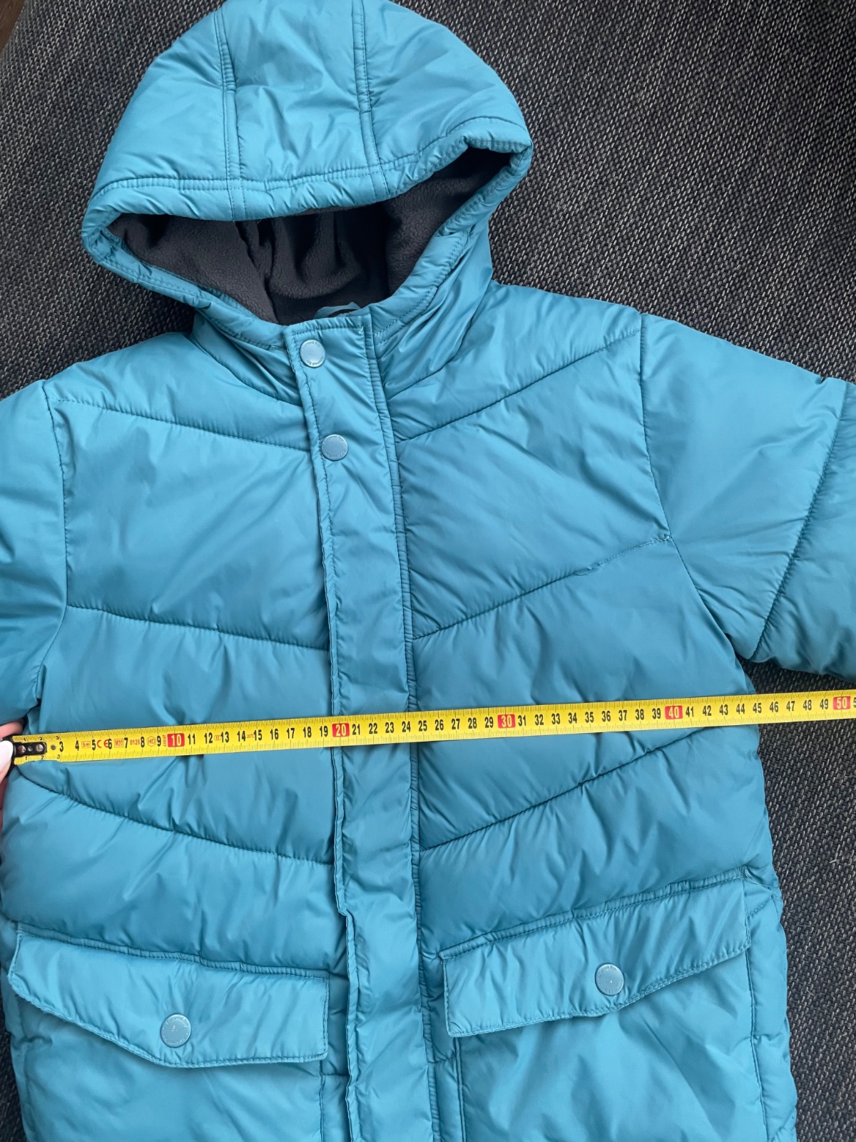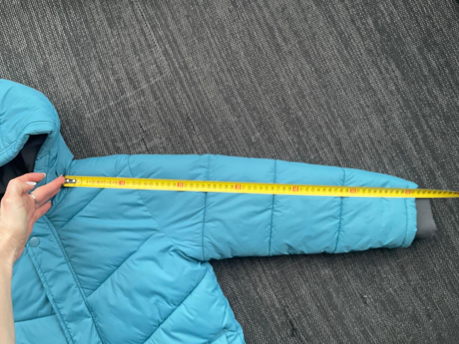 Teplá zimná bunda tyrkysovej farby, mierne predĺžený strih super zahreje vo veľkej zime. Rozmery na foto. Menšie poškodenia-viď foto.