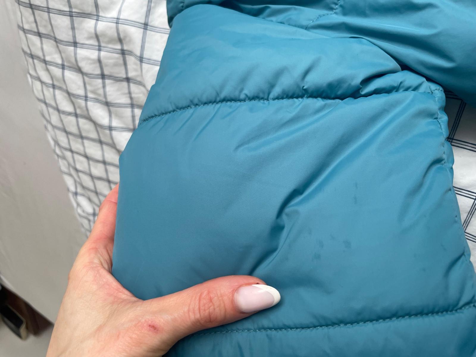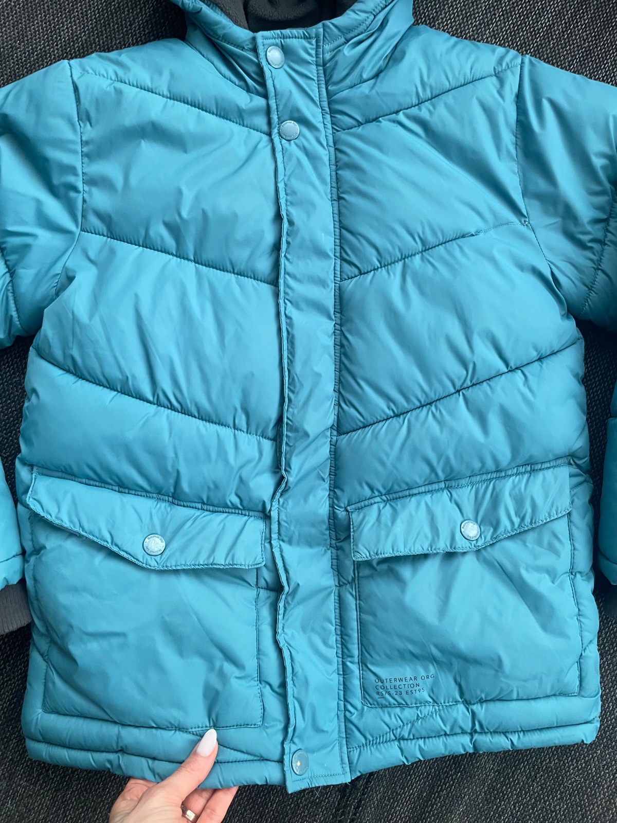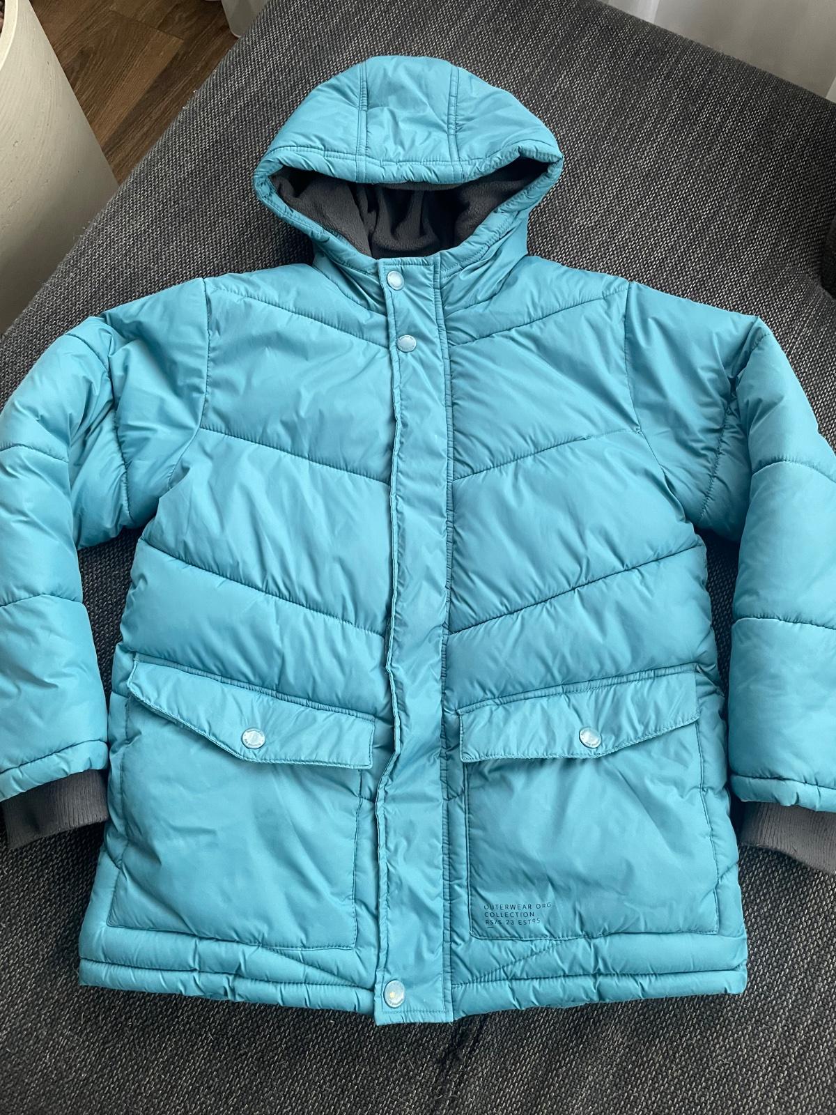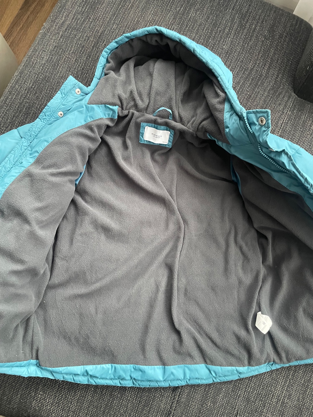 Teplá zimná bunda tyrkysovej farby, mierne predĺžený strih super zahreje vo veľkej zime. Rozmery na foto. Menšie poškodenia-viď foto.