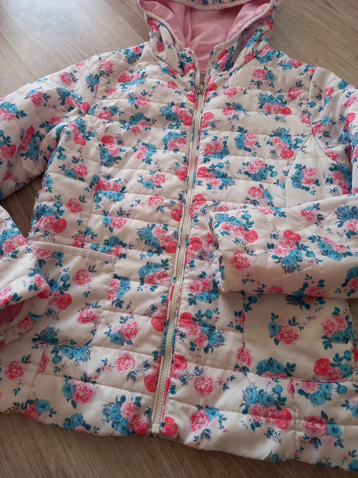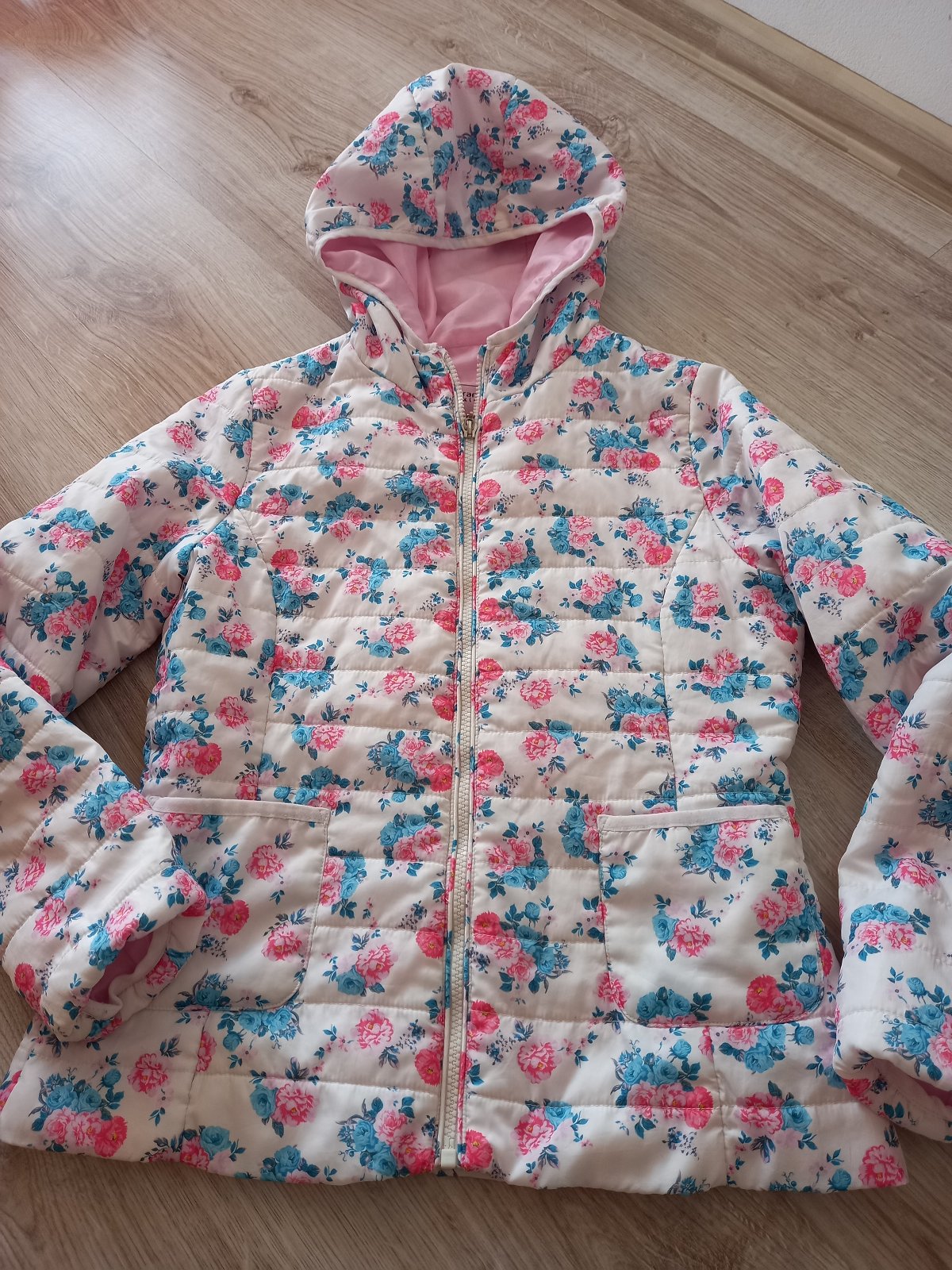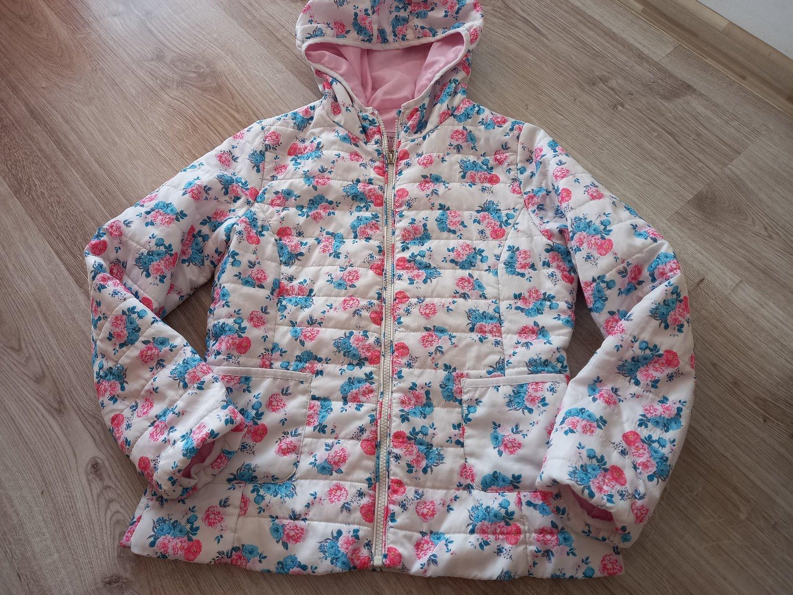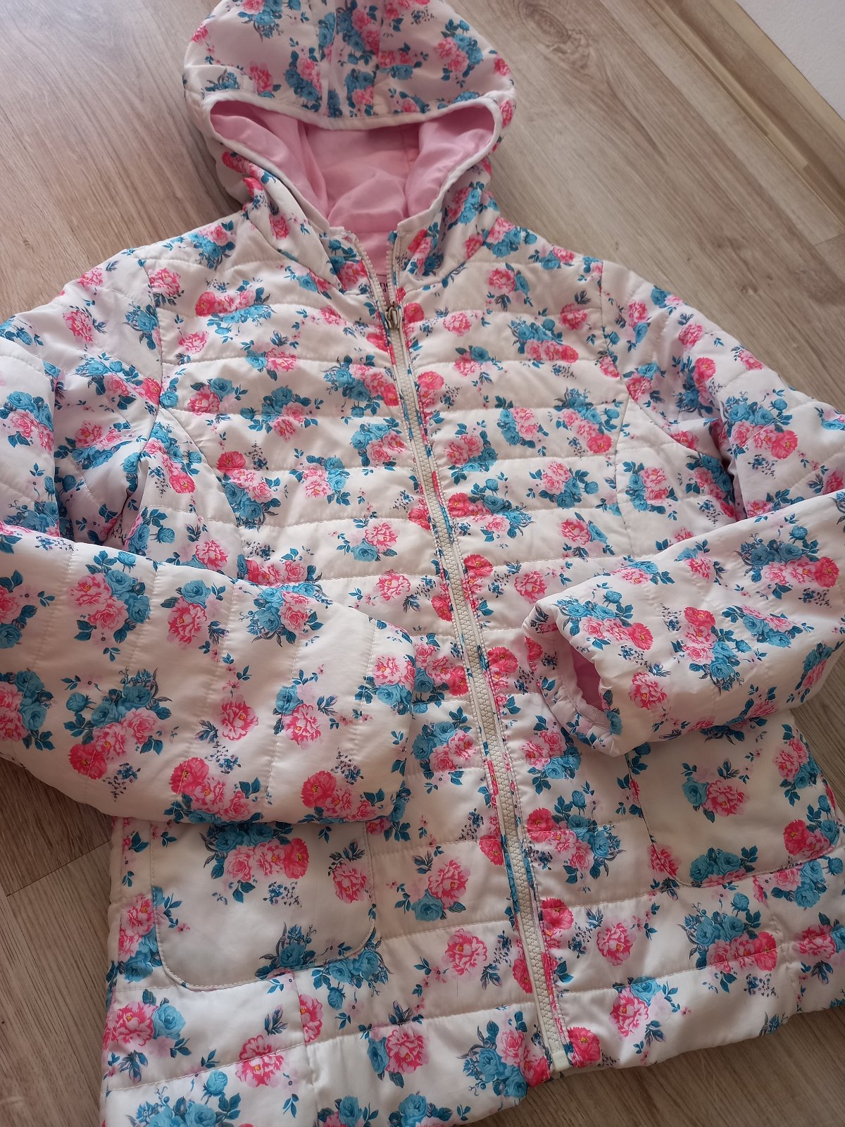 Krásna mierne vatovaná prešívaná bundička s kvietkami, super stav. Dvojčíslie 152/158. Pri výmene 7€