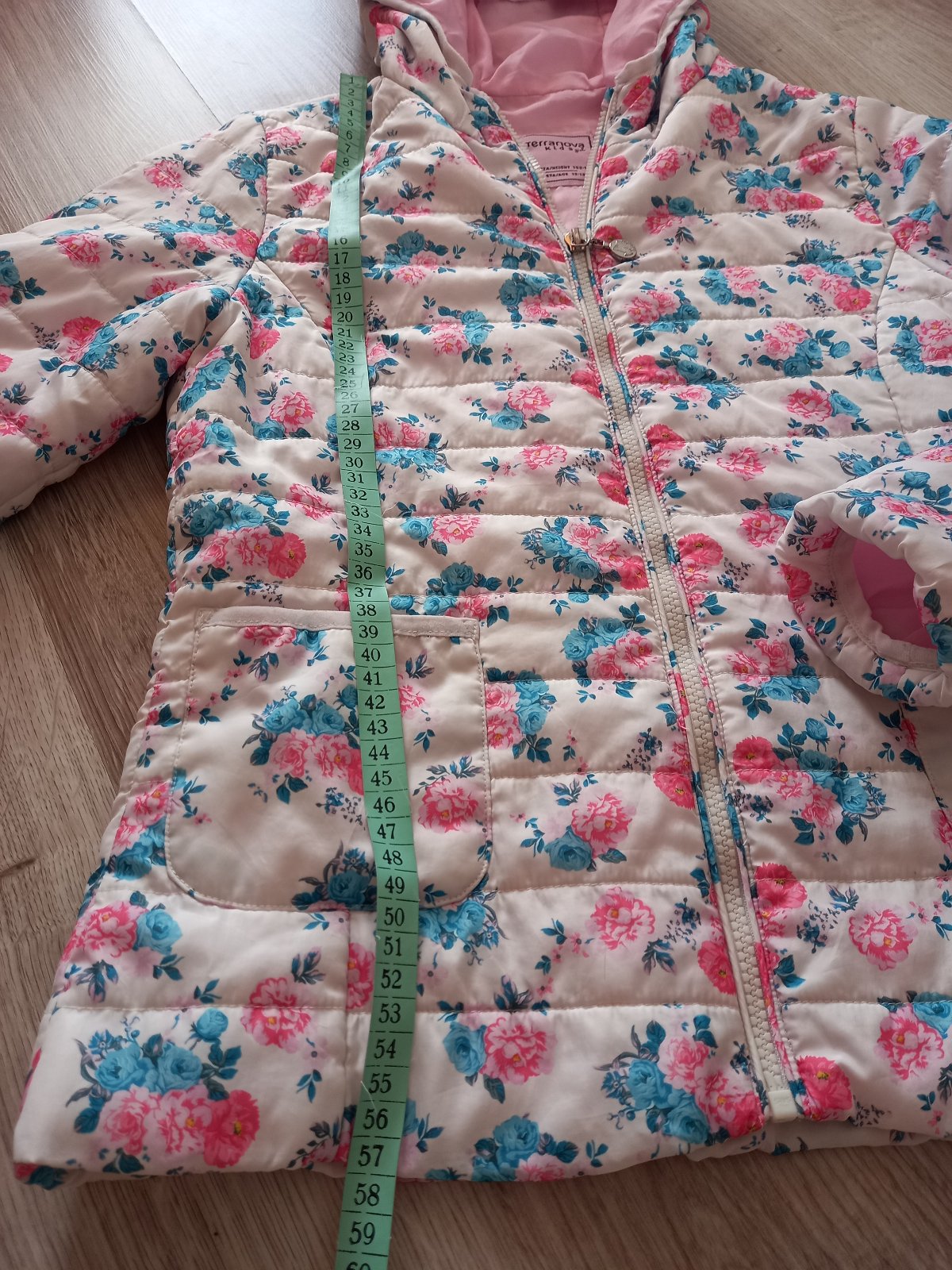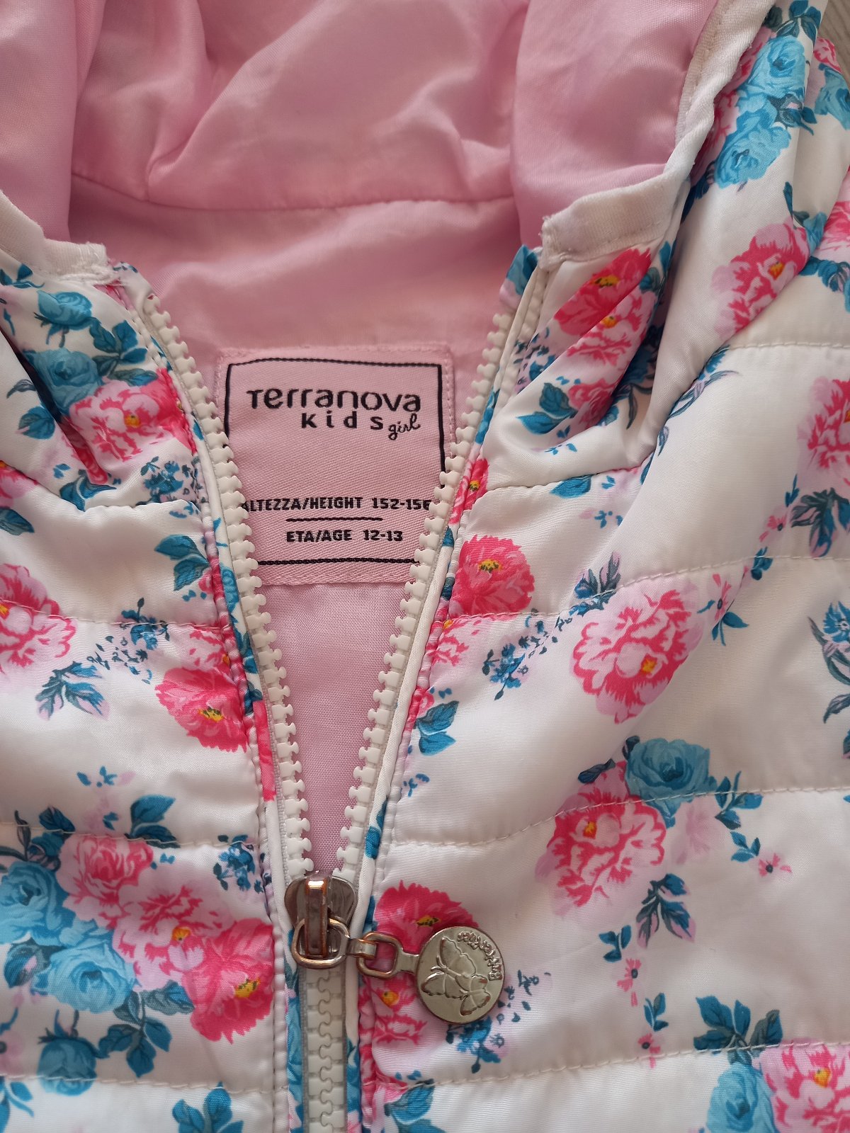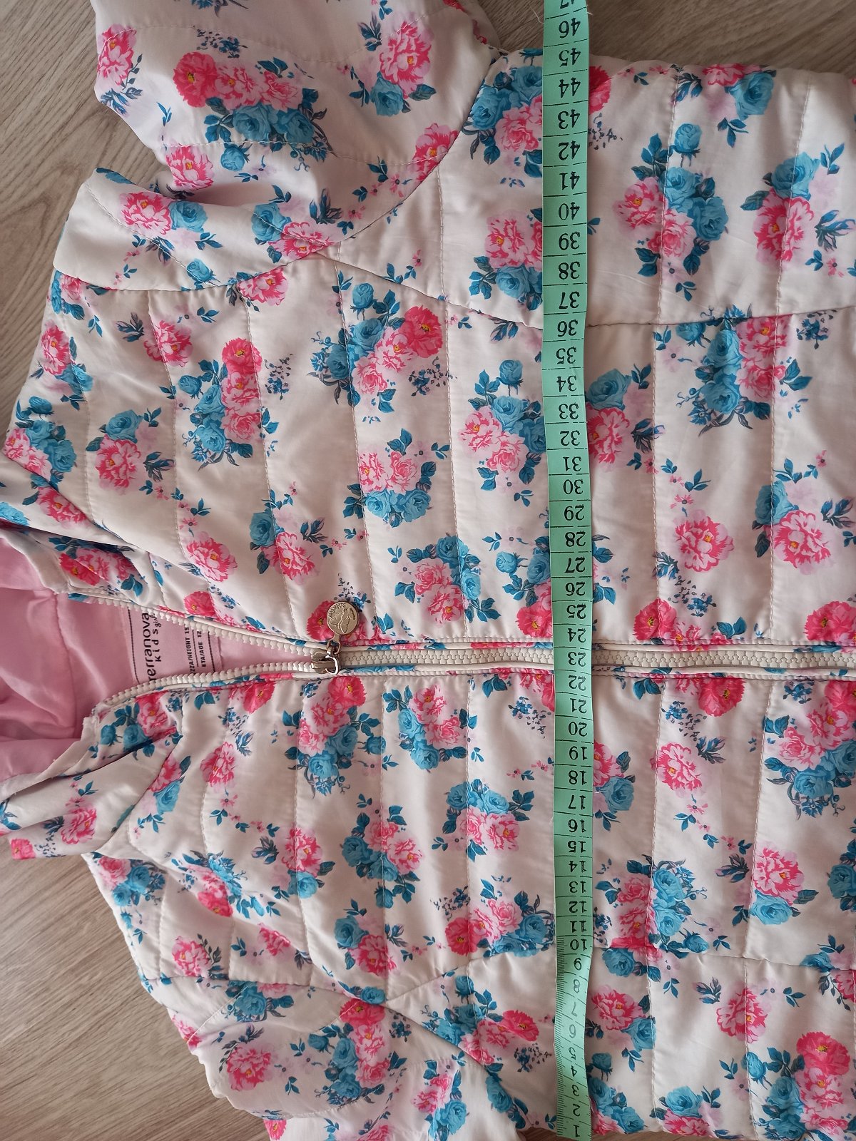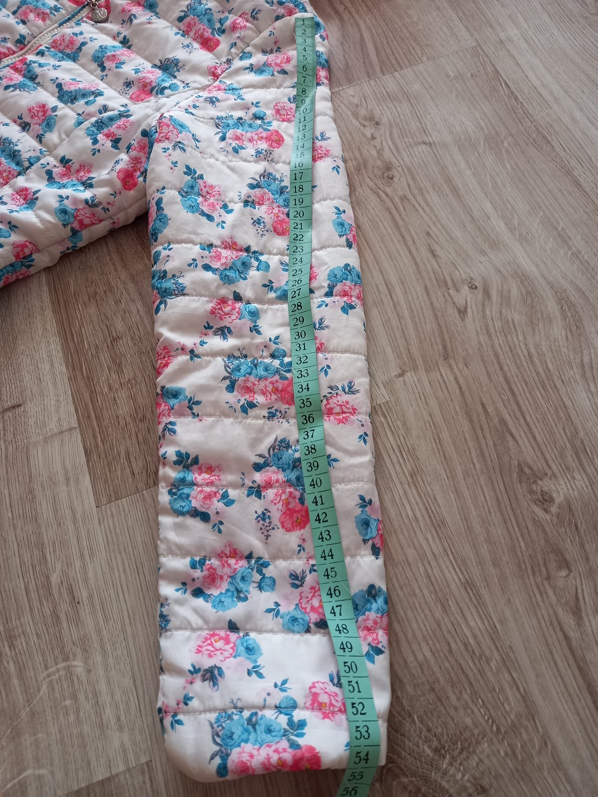 Krásna mierne vatovaná prešívaná bundička s kvietkami, super stav. Dvojčíslie 152/158. Pri výmene 7€