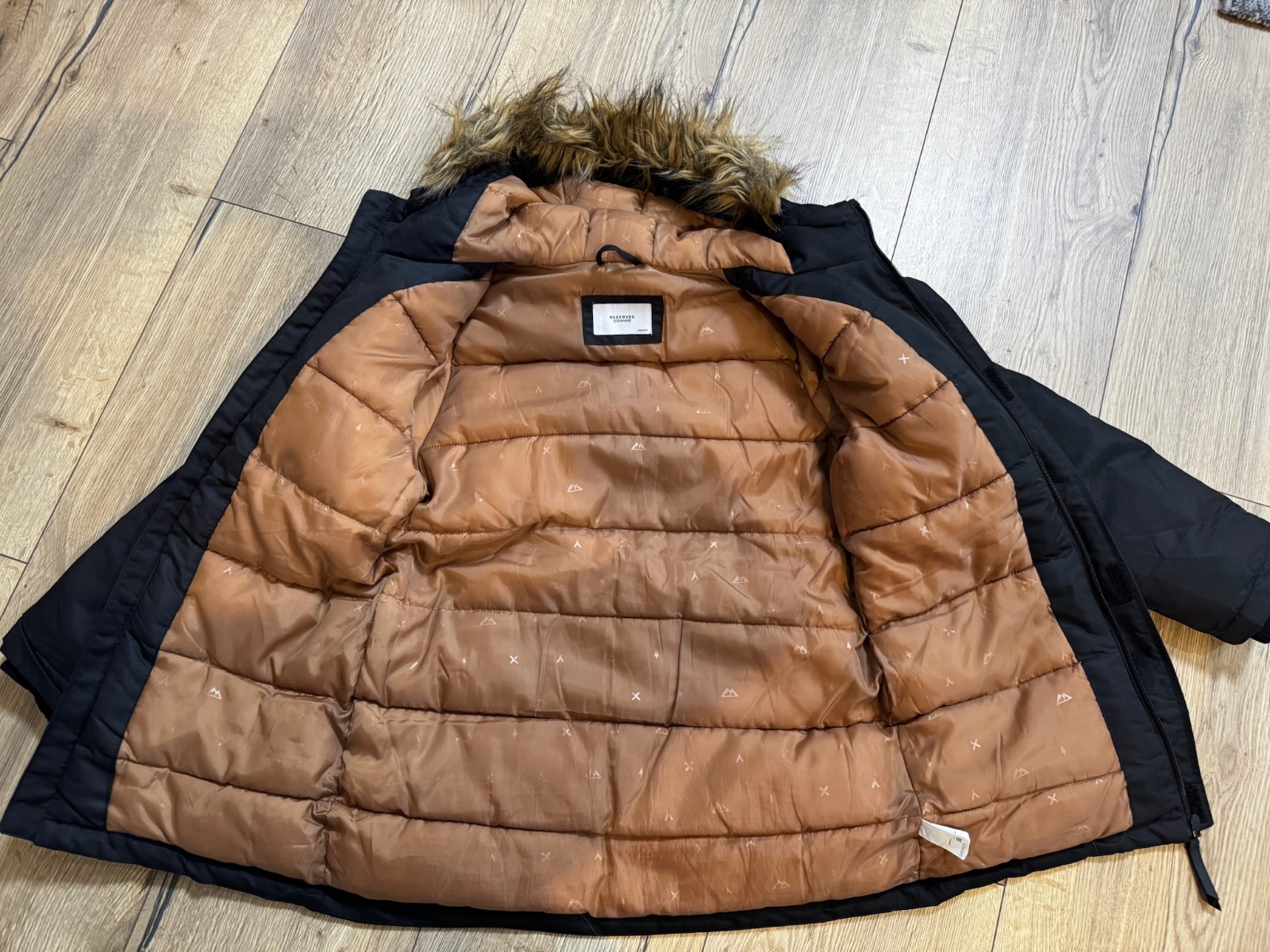 Nosená jednú zimu, má zatrhnutý suchý zips na zapínaní spredu (viď foto), ináč úplne vhodná na ďalšie nosenie, štýl parka, teplá, aj do tuhej zimy, farba čierna, rozmery - šírka v podpaží - 49 cm, dlžka - 70 cm, rukáv od ramena - 55 cm.