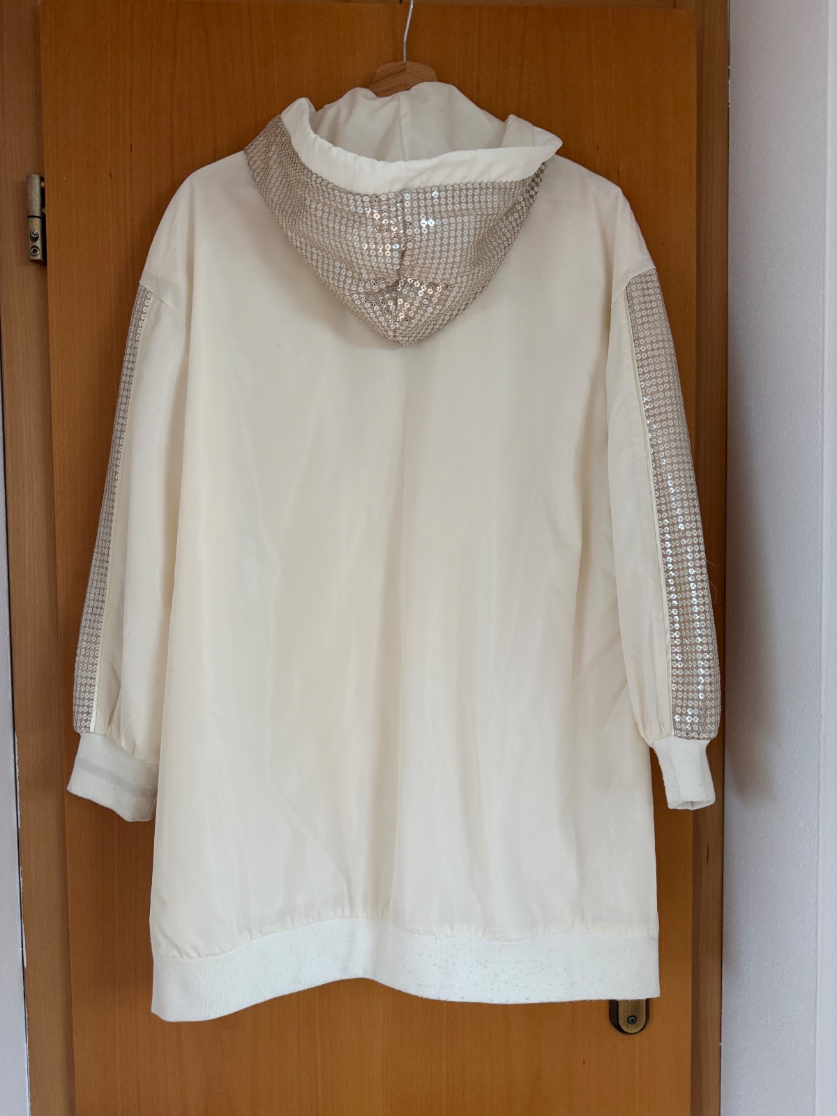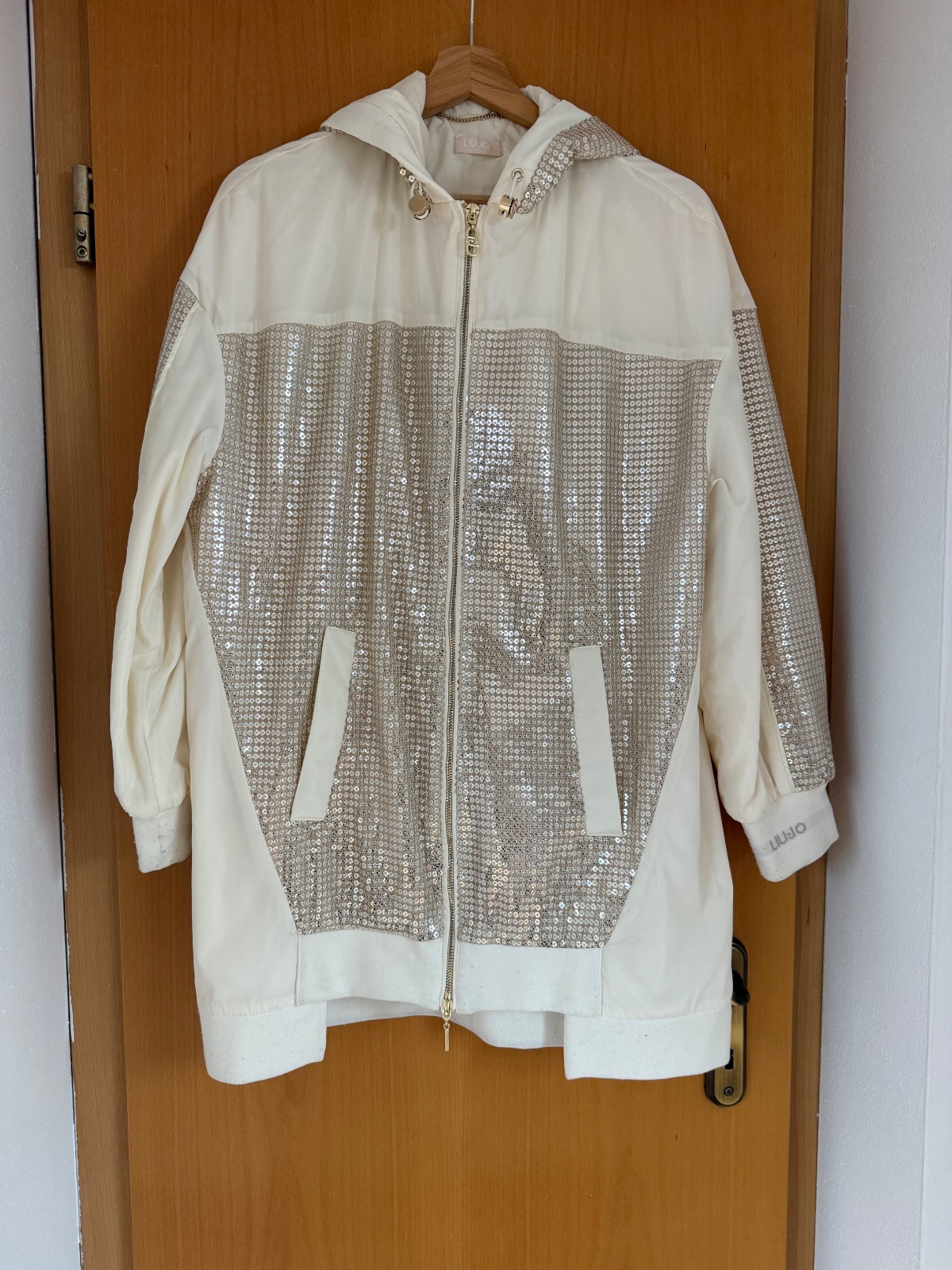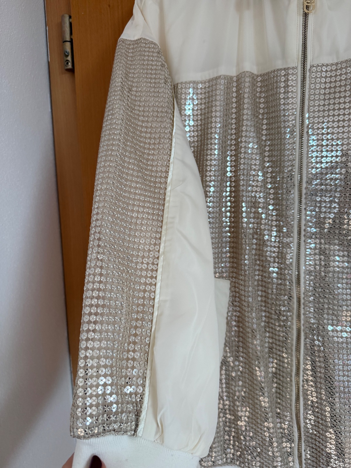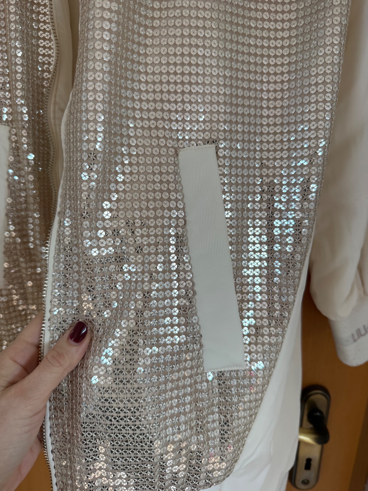 Nádherná bunda Liu Jo v krémovej farbe s flitrami. Má super strih. Veľkosť XXS ale je oversize sedí na Xs aj menšie S. Oblečená bola párkrát. Pôvodná cena bola 200€.