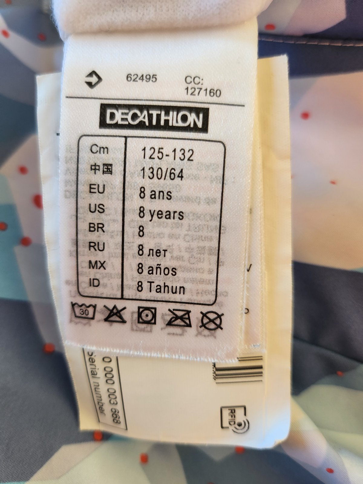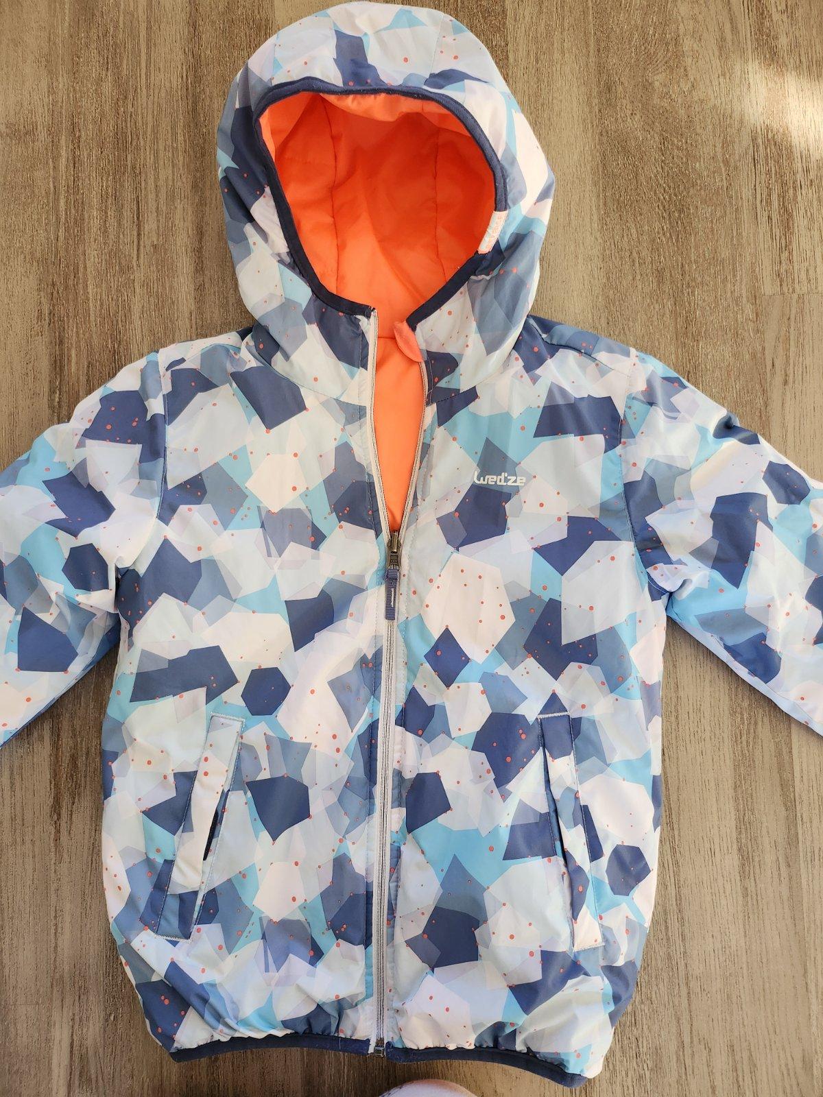 Obojstranná vetrovka aj na lyžovanie. Jedna strana lososová a druhá modro biela. Kupovaná v Decathlone, málo nosená, keďže sme mali toho veľa.Písaná veľkosť na 8 rokov.