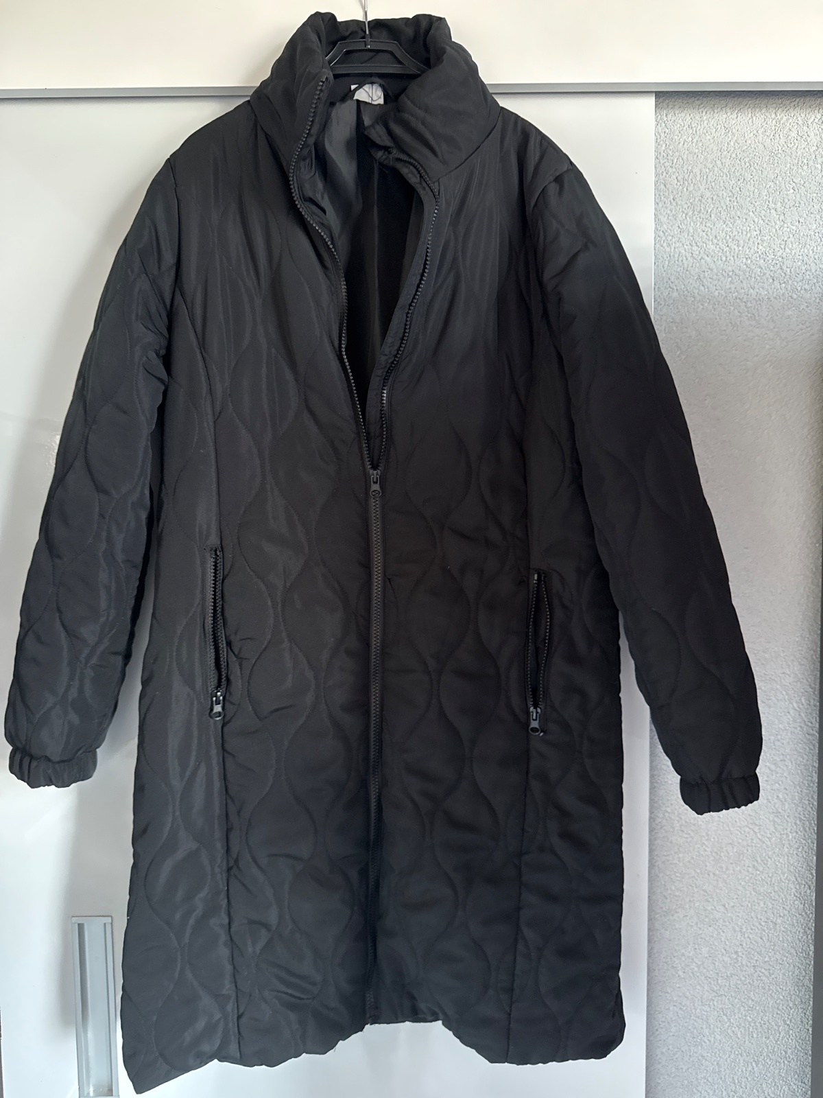 Dĺžka 59 cm, 51 cm popod pazuchy. Čierna matná, bordová predaná. Veľmi pekný stav. Minižmolky na rukáve. Čierna 13,50eur.