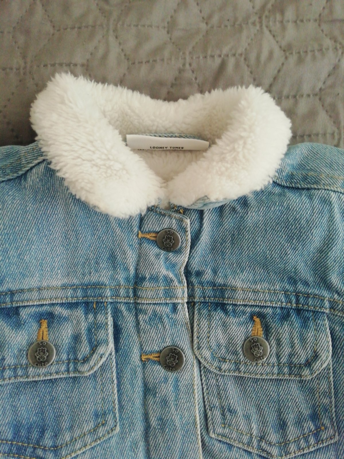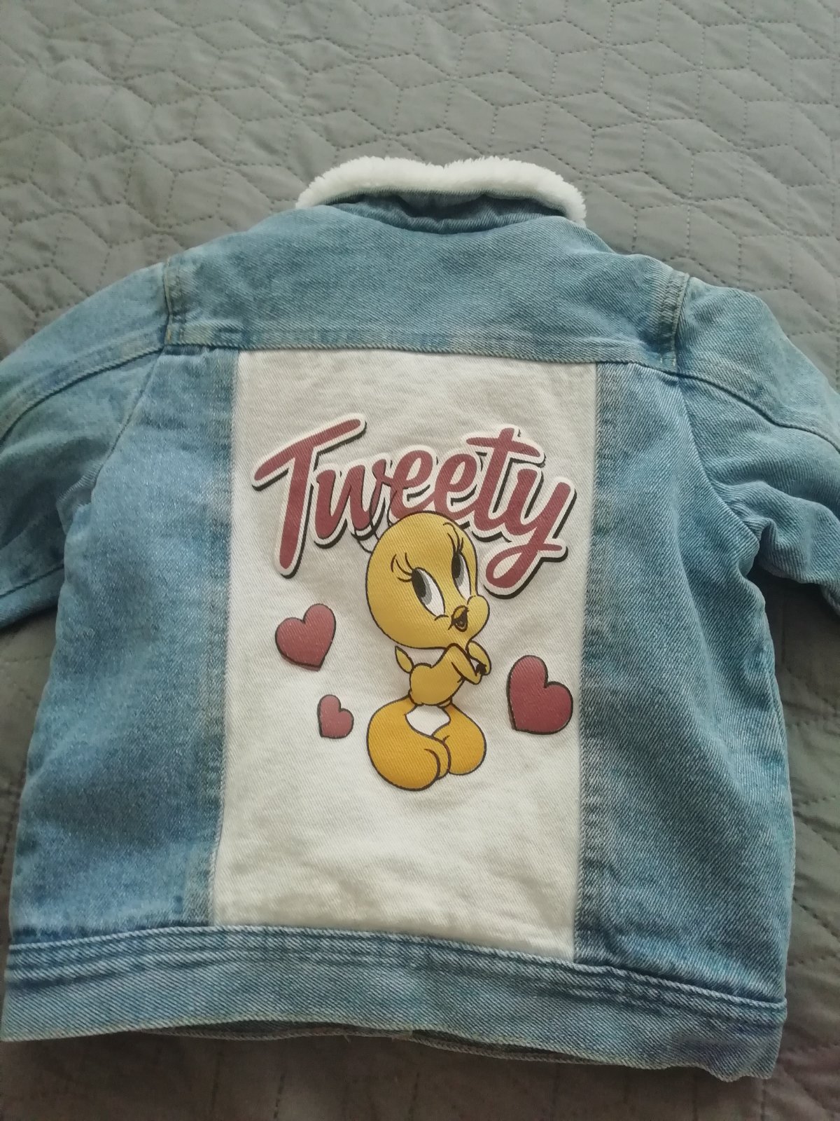 Predám zateplenú riflovú bundu, veľkosť 98 v peknom stave.Na chrbte je aplikácia tweetyho.