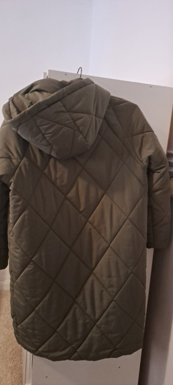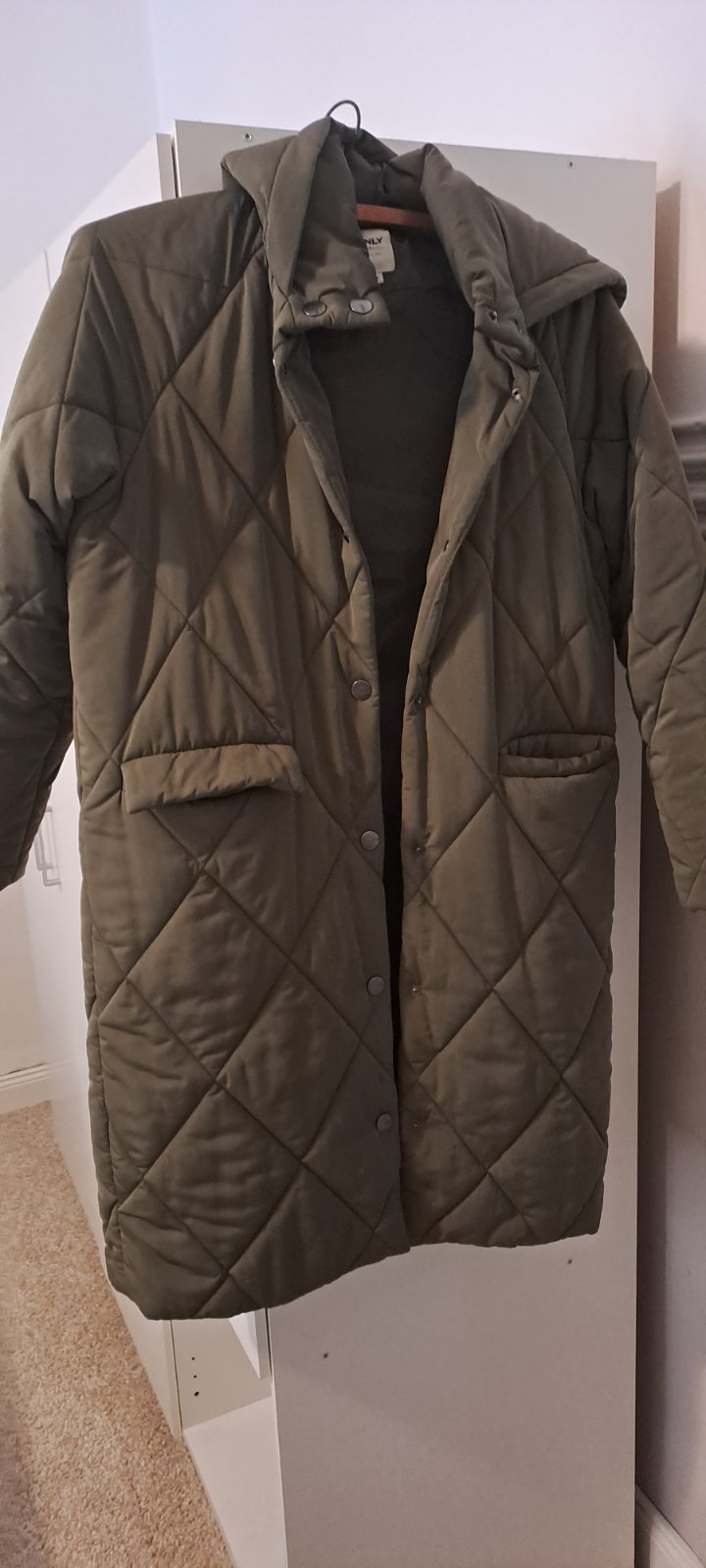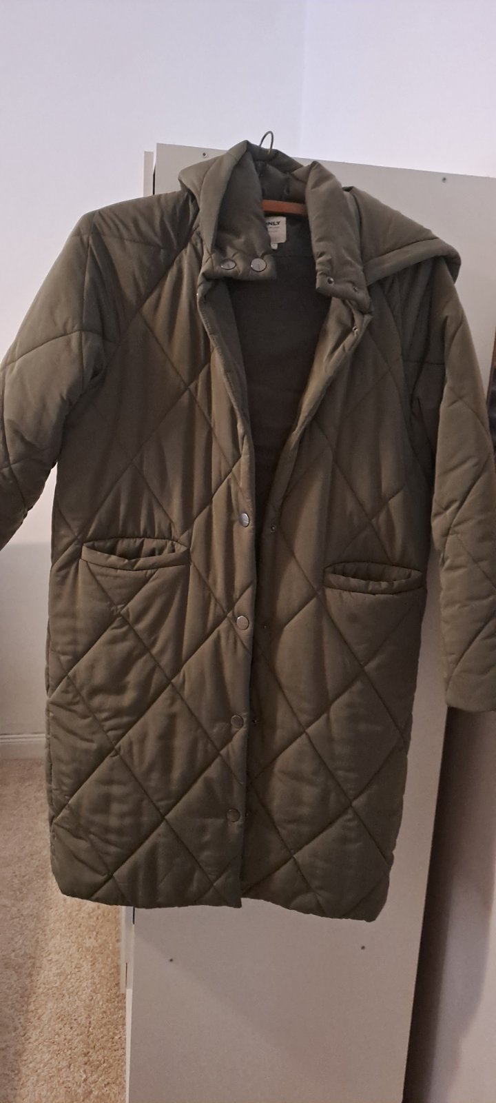 Dlhá prešívaná zimná bunda zn. JDY by Only Veľ.S, farba svetlá olivová s chladným podtónom/ došeda S dvomi vreckami a obojstranným zipsom Celková dĺžka 99cm Šírka cez pazuchy 2x50cm Rukáv od krku...