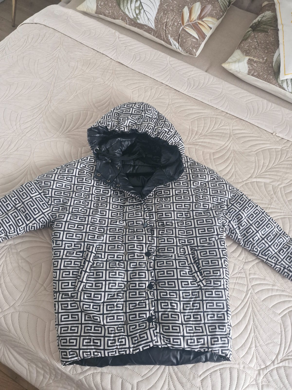Kockovaná veľmi teplá bundička... kapucňa sa dá odopnúť a aj kožušinka na kapucni sa dá odopnúť.