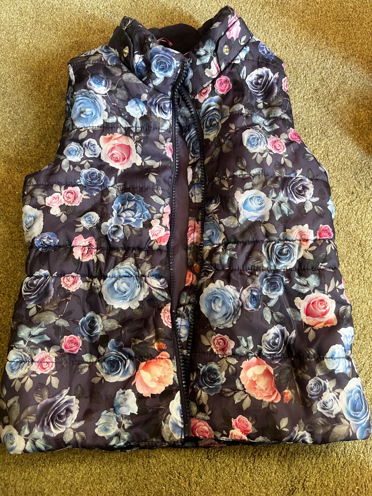 Krásna vesta s ružami v top stave, bez poškodenia, veľkosť 5-6rokov. Zapínanie na zips, kapucňu sme stratili.V