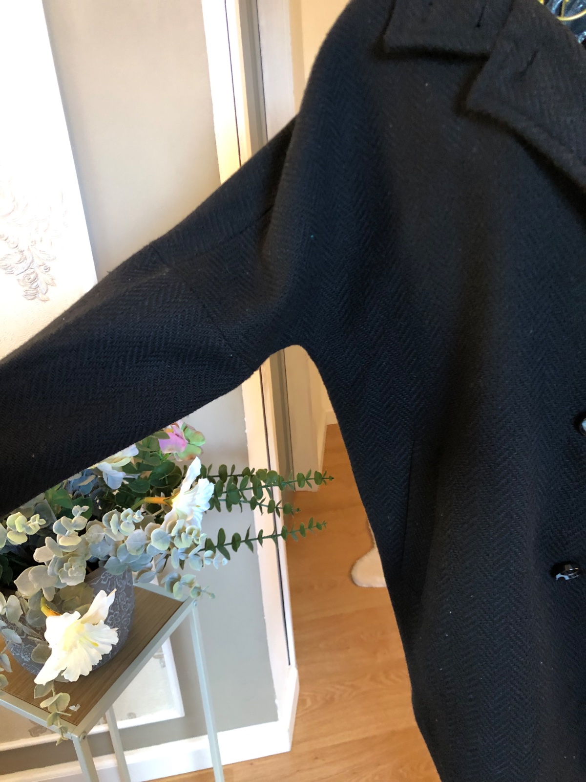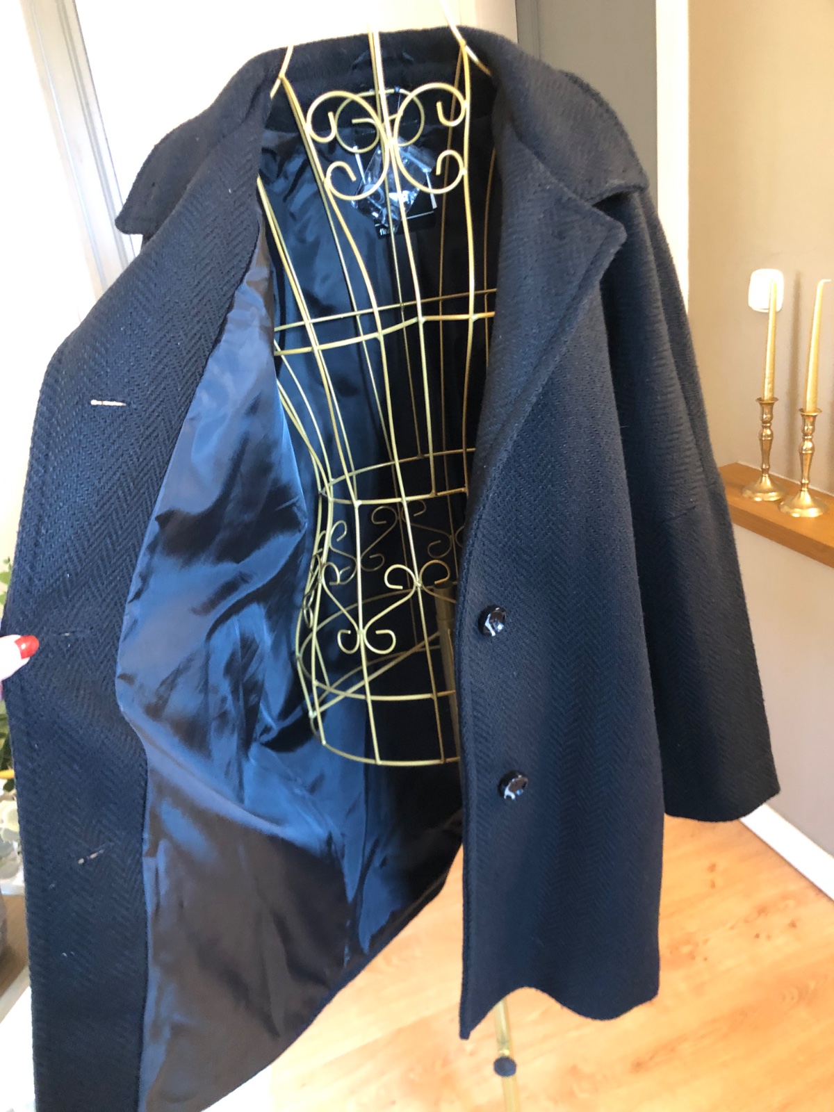 Kvalitný čierny kabát, zapínanie na gombíky, podšitý, nový s visačkou.