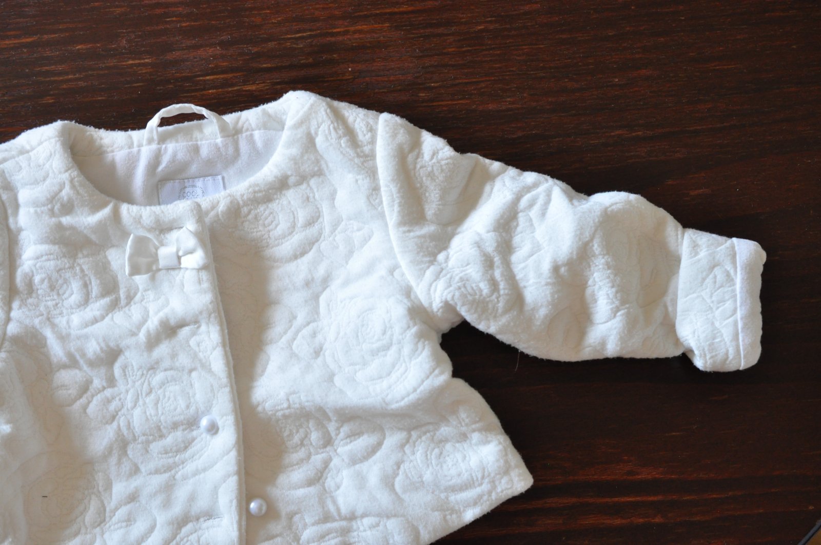 Kabatik ,ktorý som mala najradsej, biela už je taka nie čisto biela,skôr smotanova. Zdnuka bavlna,nie taka satenove,ako mavaju dospelacke saka. Tie Horne časti z cvokov sa odtrhli,ale kabatik sa da...