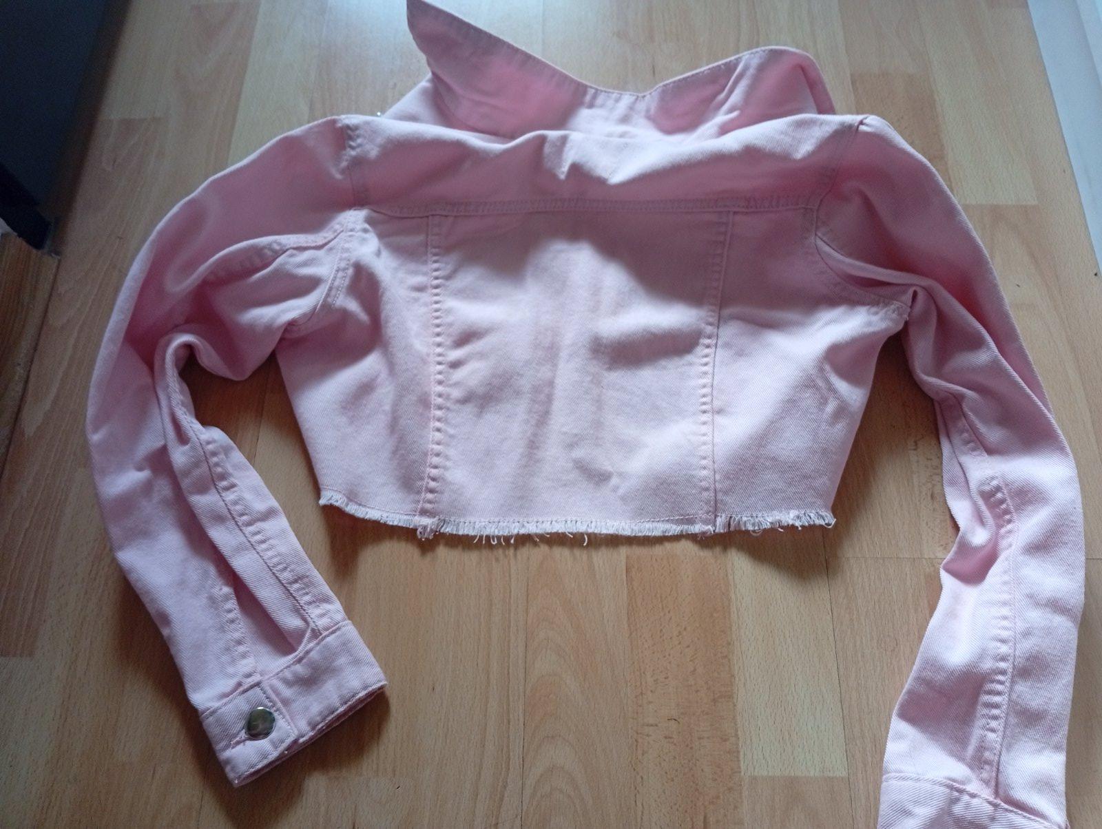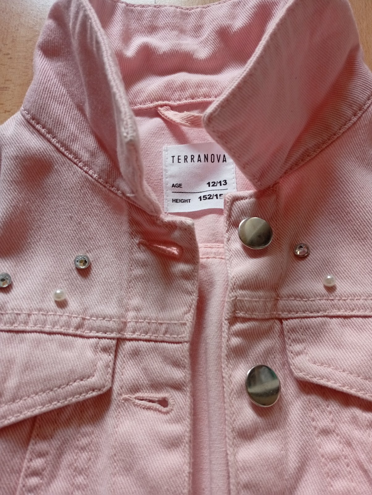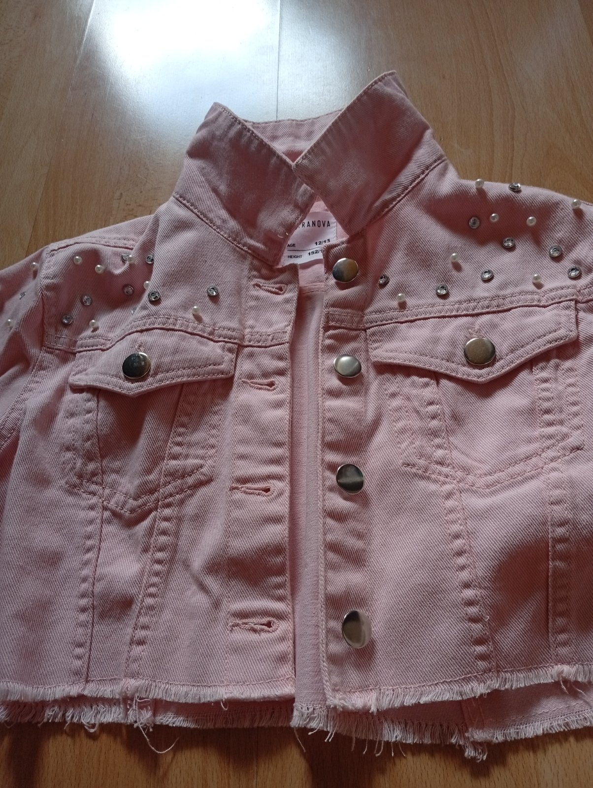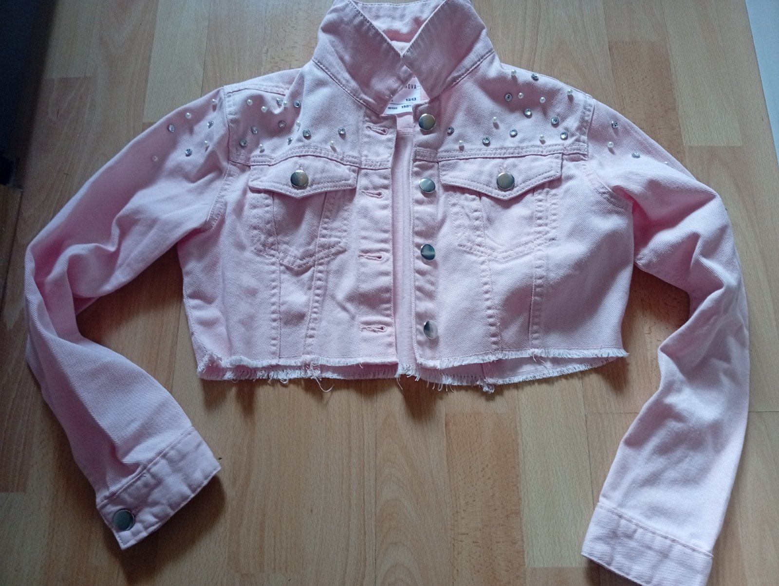 Predám nenosenu krátku bundičku/riflovku s perličkami a ozdobným kovom č.152/158.Nová ,aj ako darček.