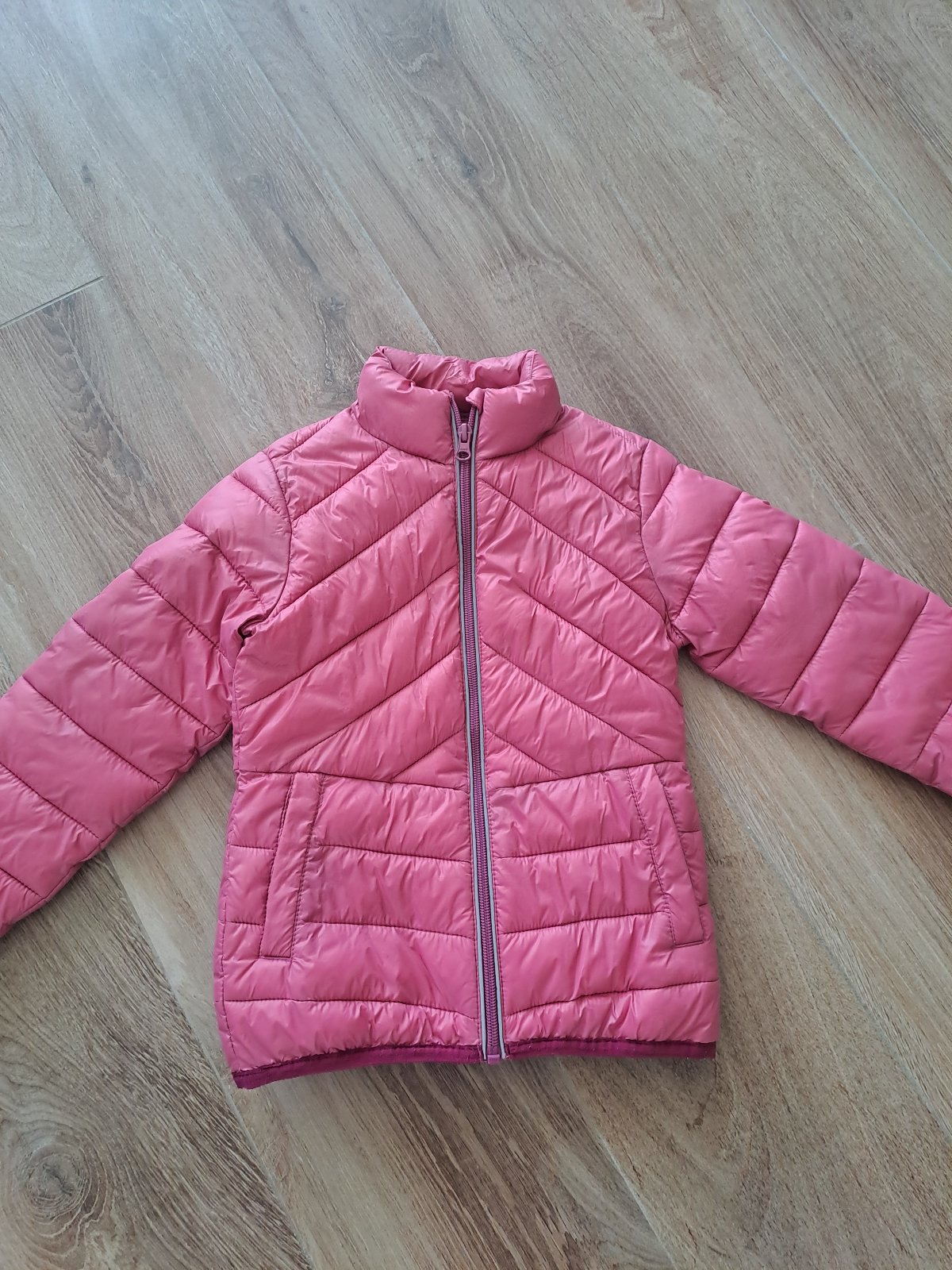 Prechodna bundicka,bez poskodenia.Farba krajsia ako na foto,vyraznejsia,kombi s tyrkys.farbou.Velkost na stitku 134/140 ale nositelna uz od c.122 preto som ju dala uz pid mensiu velkost. Dlžka -51...