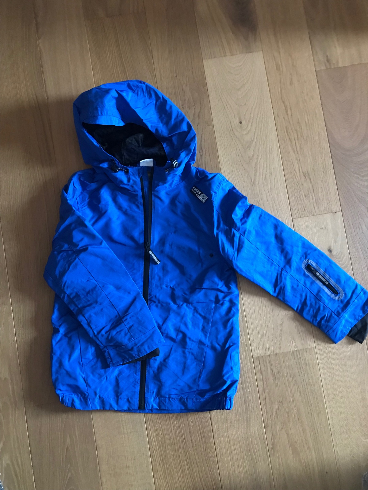 bunda je vo veľmi dobrom nosenom stave, nepremokavá, zvnútra podšitá fleesom okrem rukávov, velkost je 150/158 na 11/-12 rokov, rozmery sú: dlžka je 61cm, šírka je 48cm, rukáv od krku meria 64cm