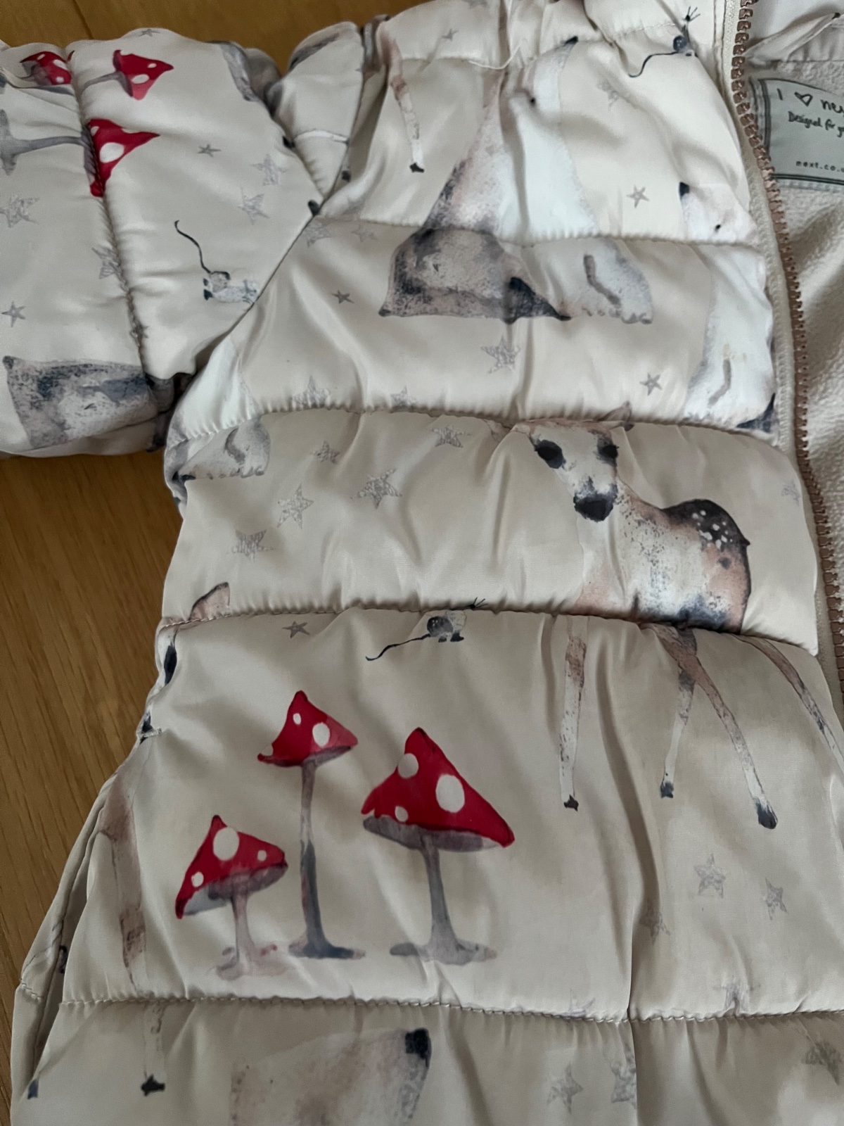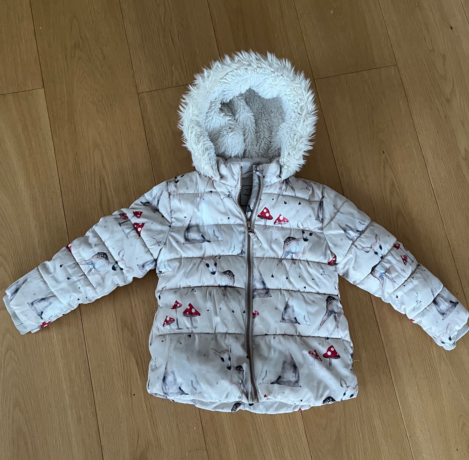 Nadherna zimna bundicka vel. 116, 5-6r, jemna bezova farba so srnkami a muchotravkami, fleesova podsivka, kapucna. Idealne odber v ramci BA alebo plus postovne.
