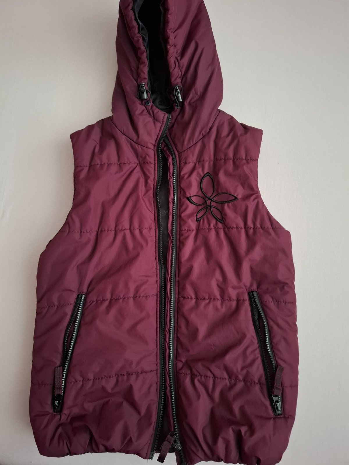 Tepla vesta bez kapucne, výborný stav. Dĺžka 50 cm, šírka 43 cm