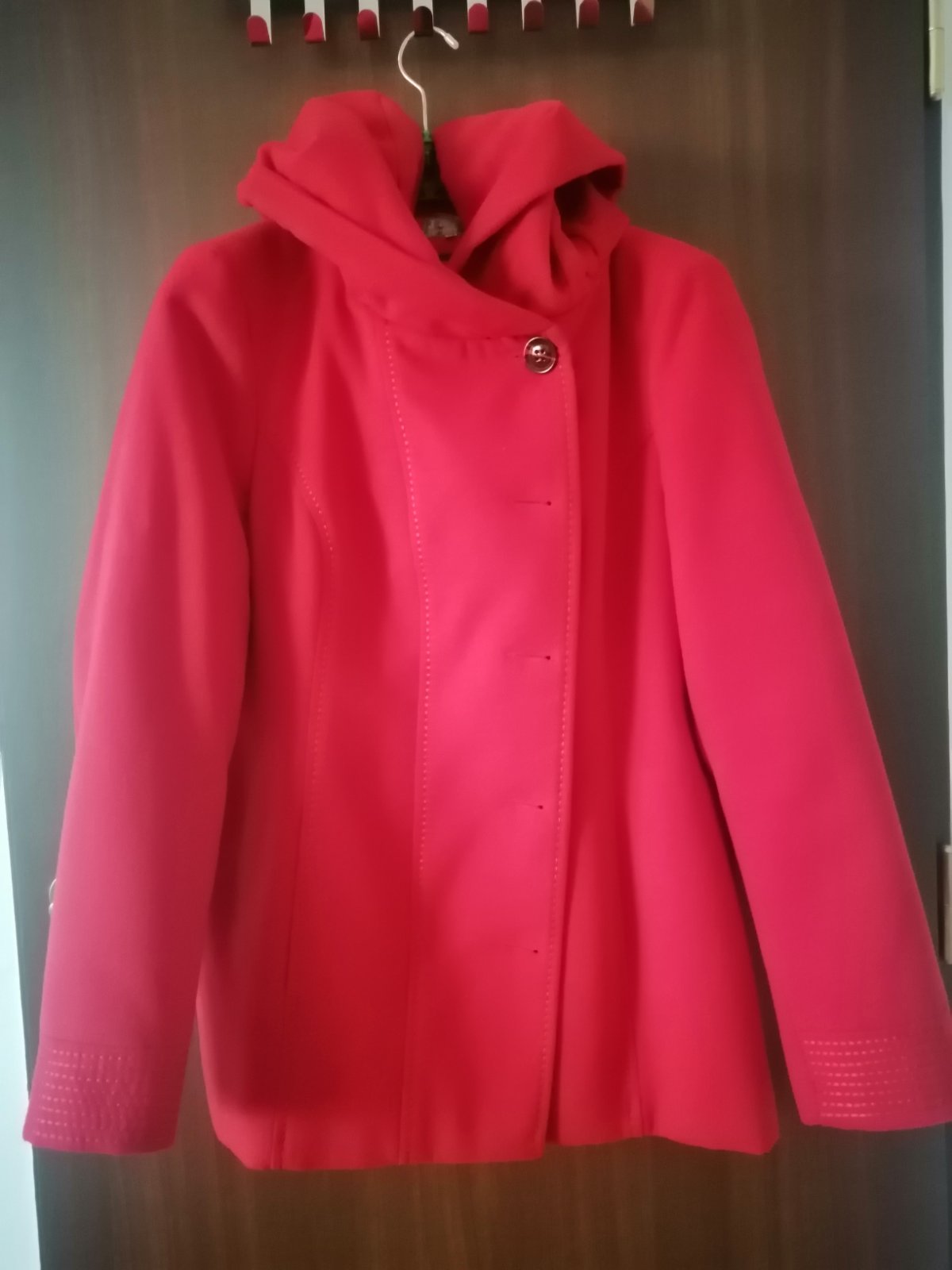 Nenosený kabát, krásnej jasnej červenej farby, má úžasnú kapucňu, ktorá tvorí aj krásny golier.
