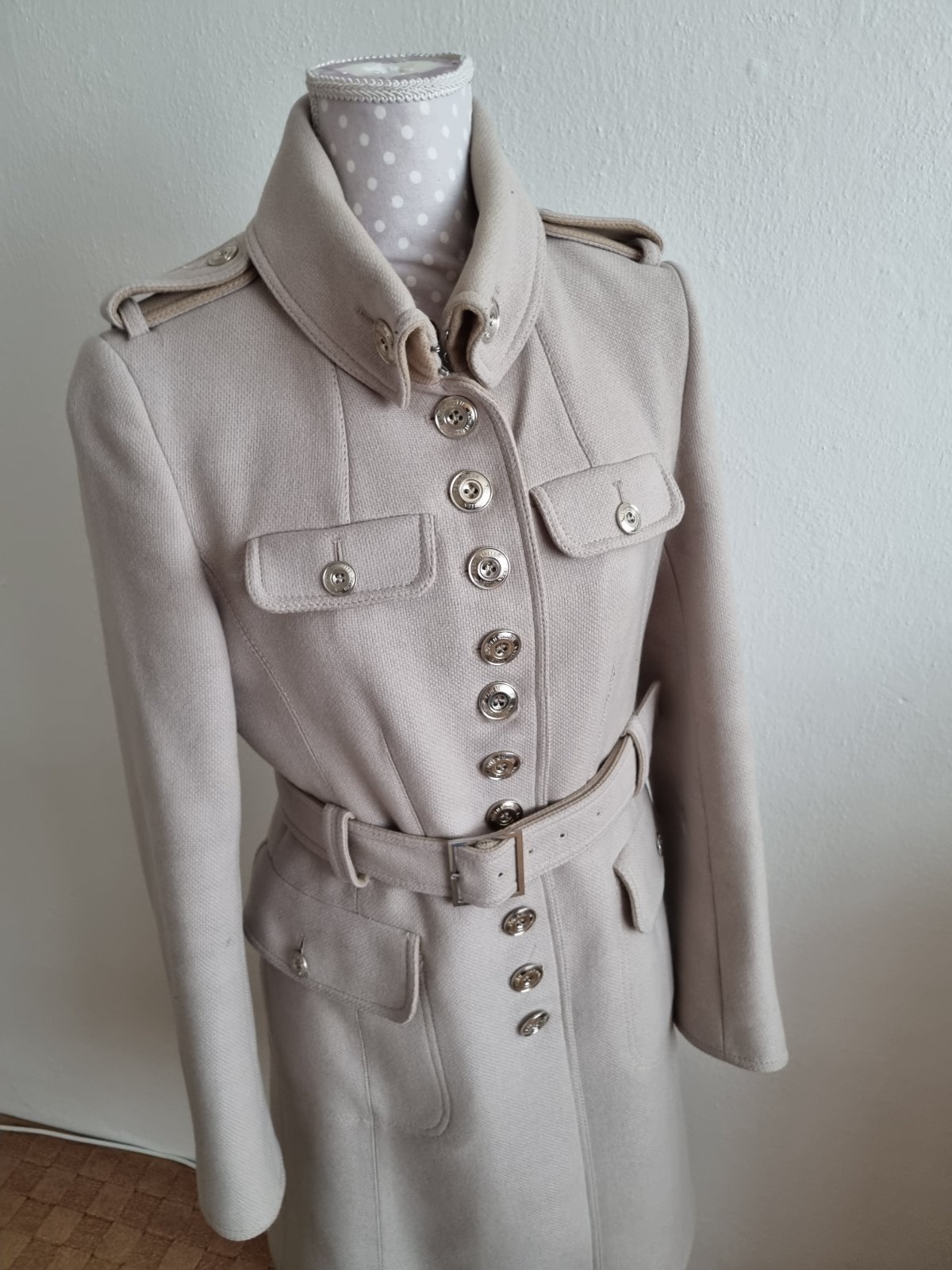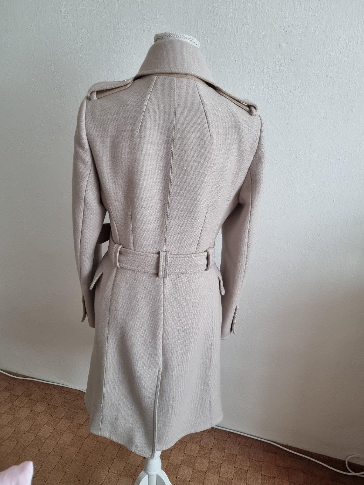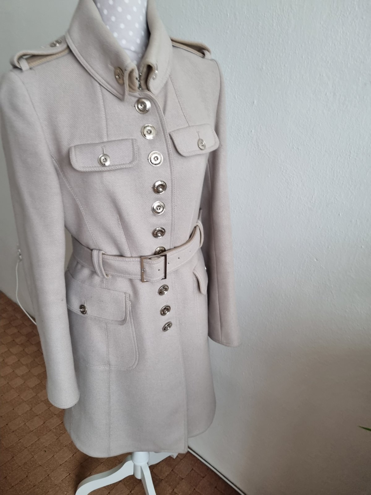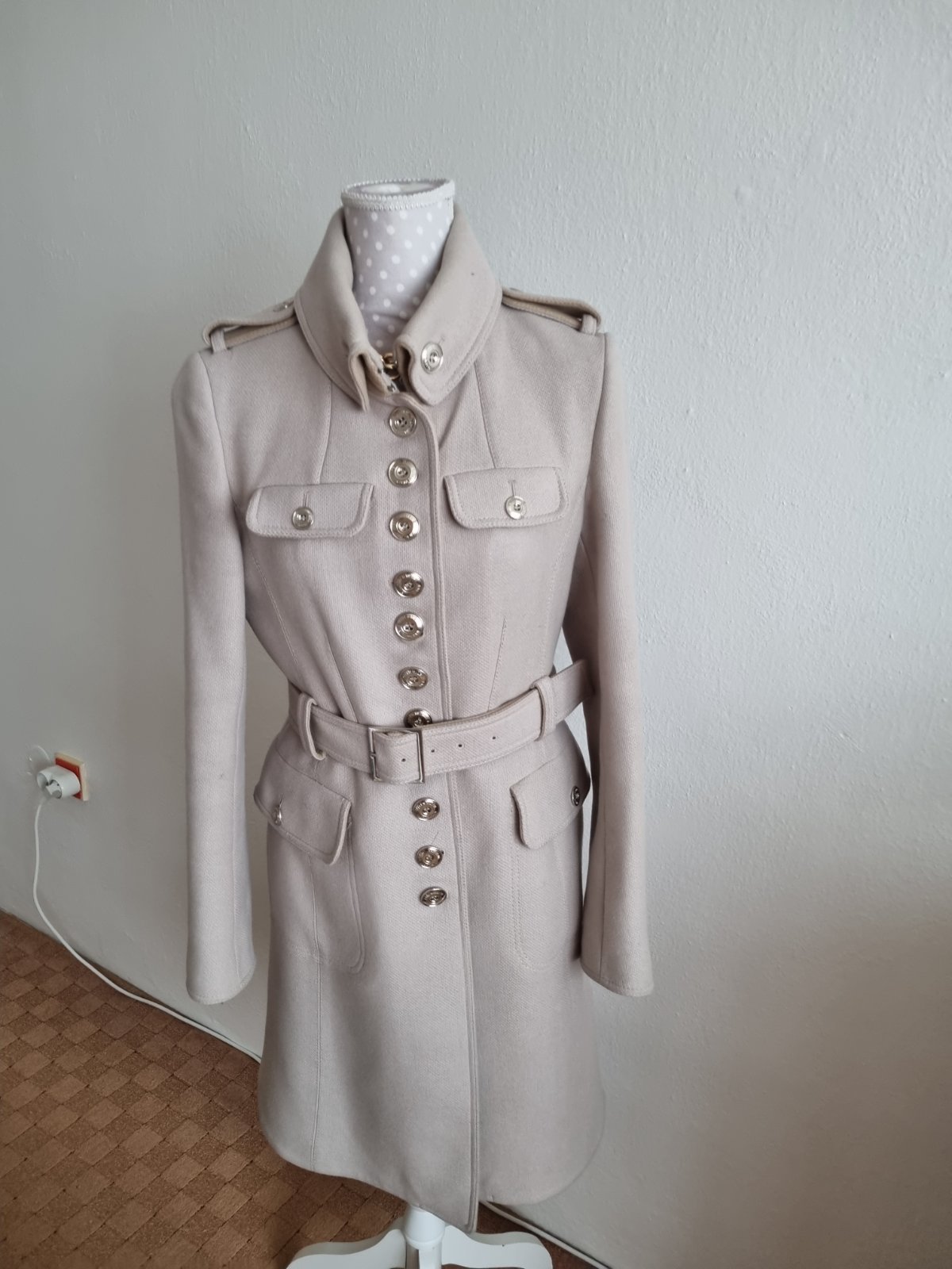 jednu zimu párkrát oblečený luxusný kabát drahej značky Karen Millen, veľ. píše 40, no je to menšia 38, dlžka 98, prsia 47x2 max., pás 40x2, boky 47x2, rukáv od krku 74..luxusná hologramová podšívka, vrchný materiál taký štrukturovaný, zloženie na štítku...Kabát je po čistiarni, zlaté gombíky s logom značky...Nový bol nehorázne drahý, dcéra po pôrode už neoblečie, posúvame....farba bielej kávy...