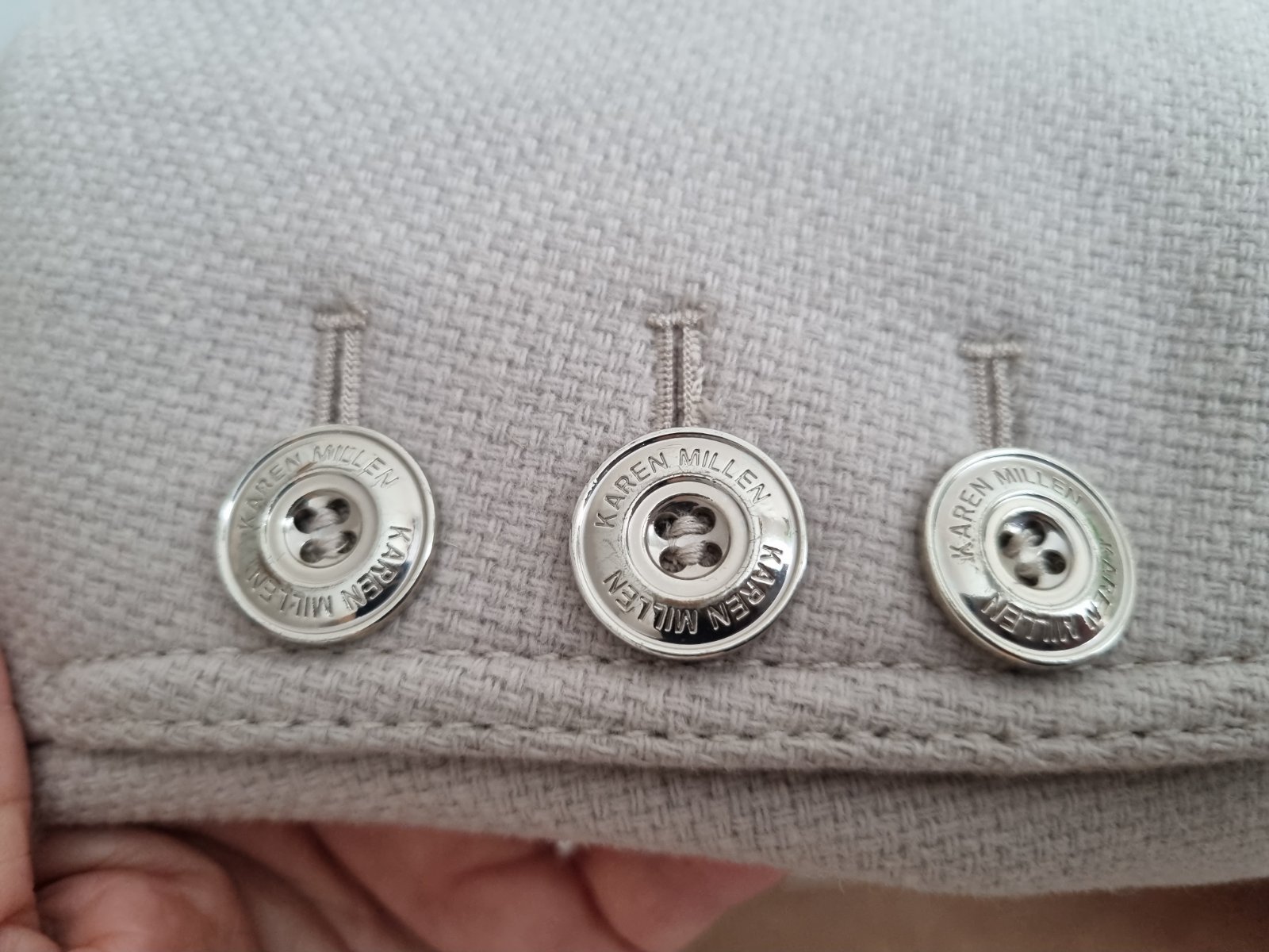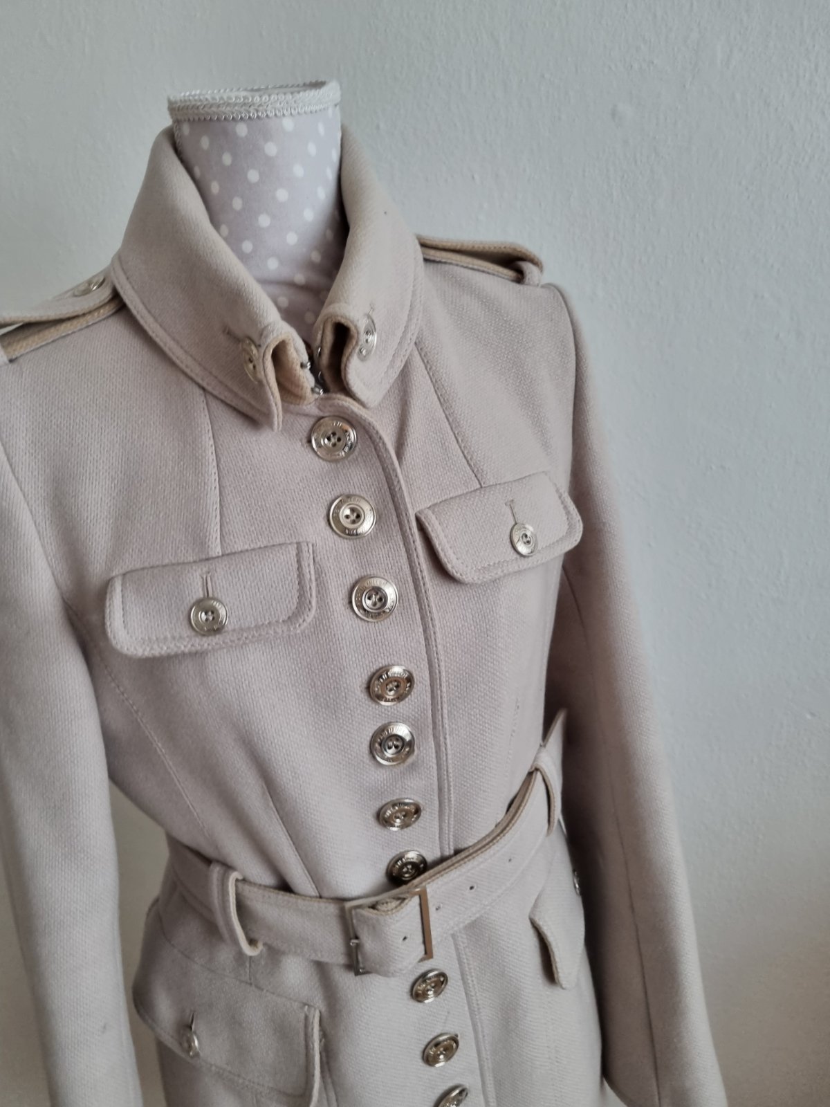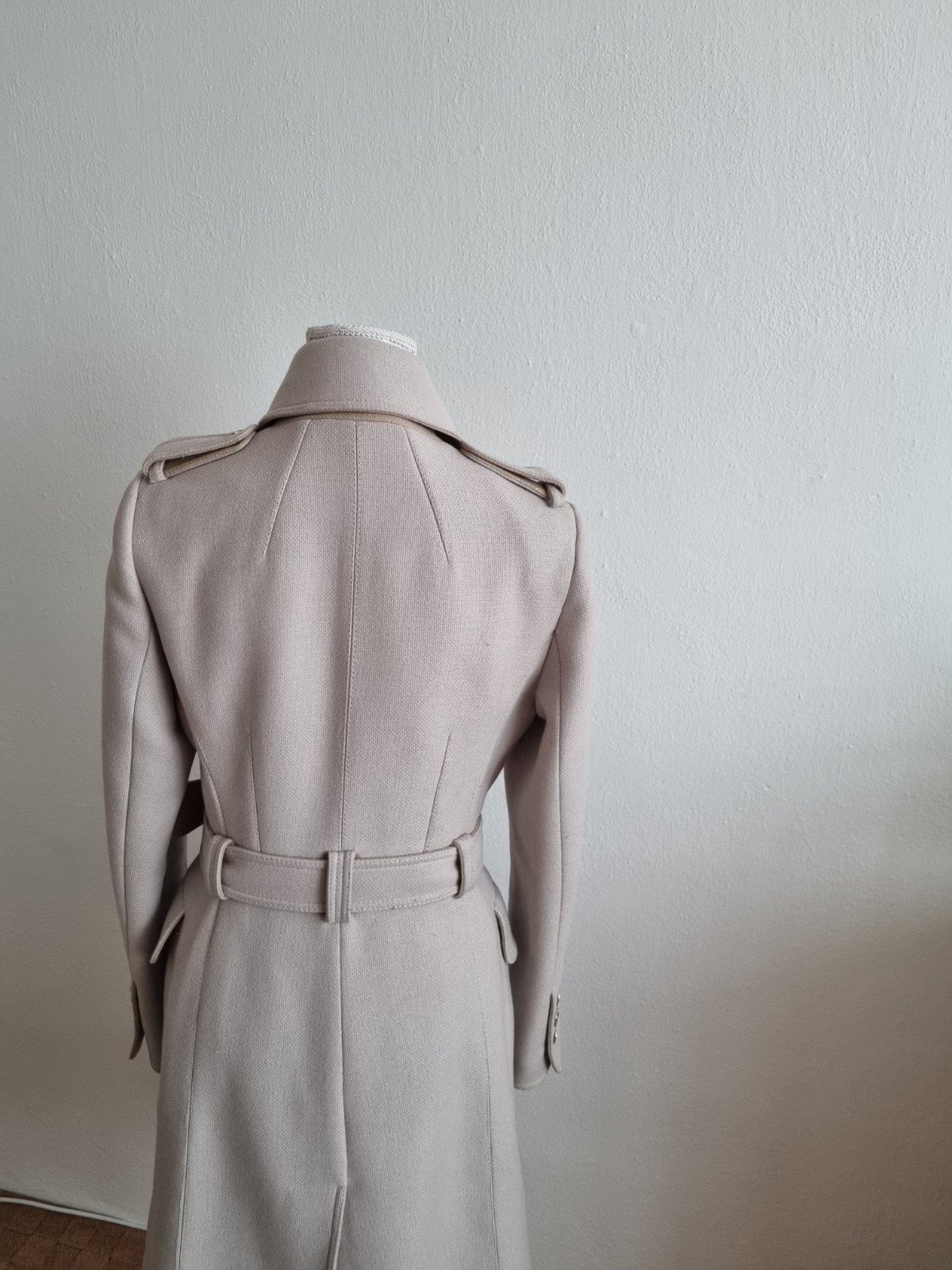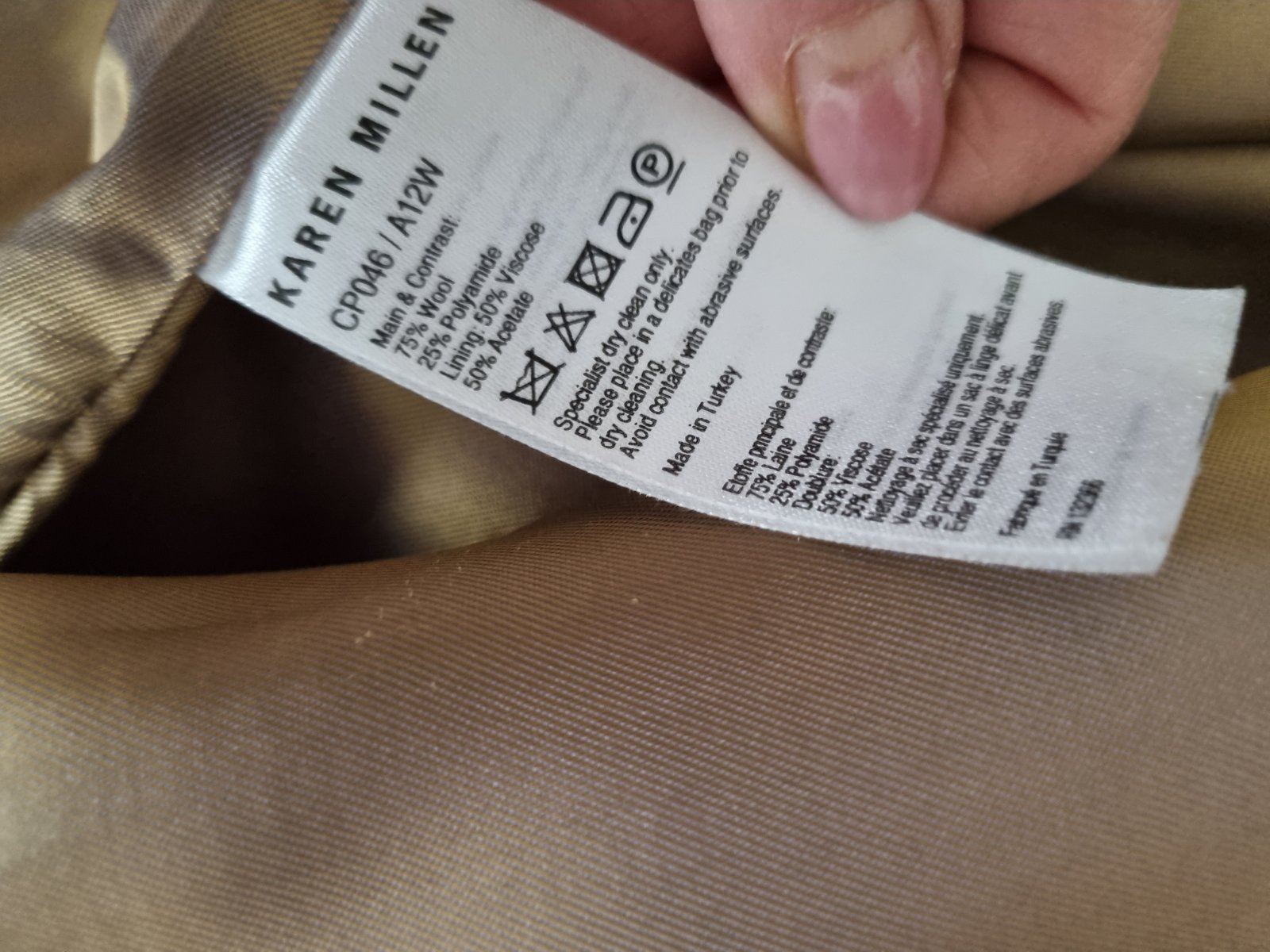 jednu zimu párkrát oblečený luxusný kabát drahej značky Karen Millen, veľ. píše 40, no je to menšia 38, dlžka 98, prsia 47x2 max., pás 40x2, boky 47x2, rukáv od krku 74..luxusná hologramová podšívka, vrchný materiál taký štrukturovaný, zloženie na štítku...Kabát je po čistiarni, zlaté gombíky s logom značky...Nový bol nehorázne drahý, dcéra po pôrode už neoblečie, posúvame....farba bielej kávy...