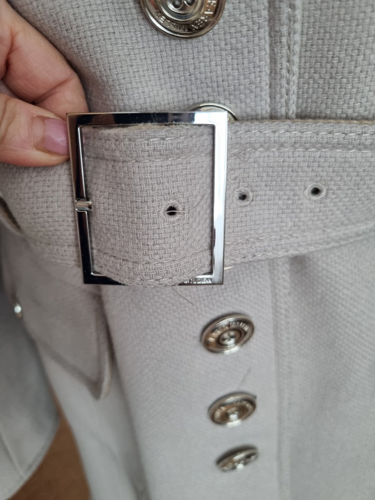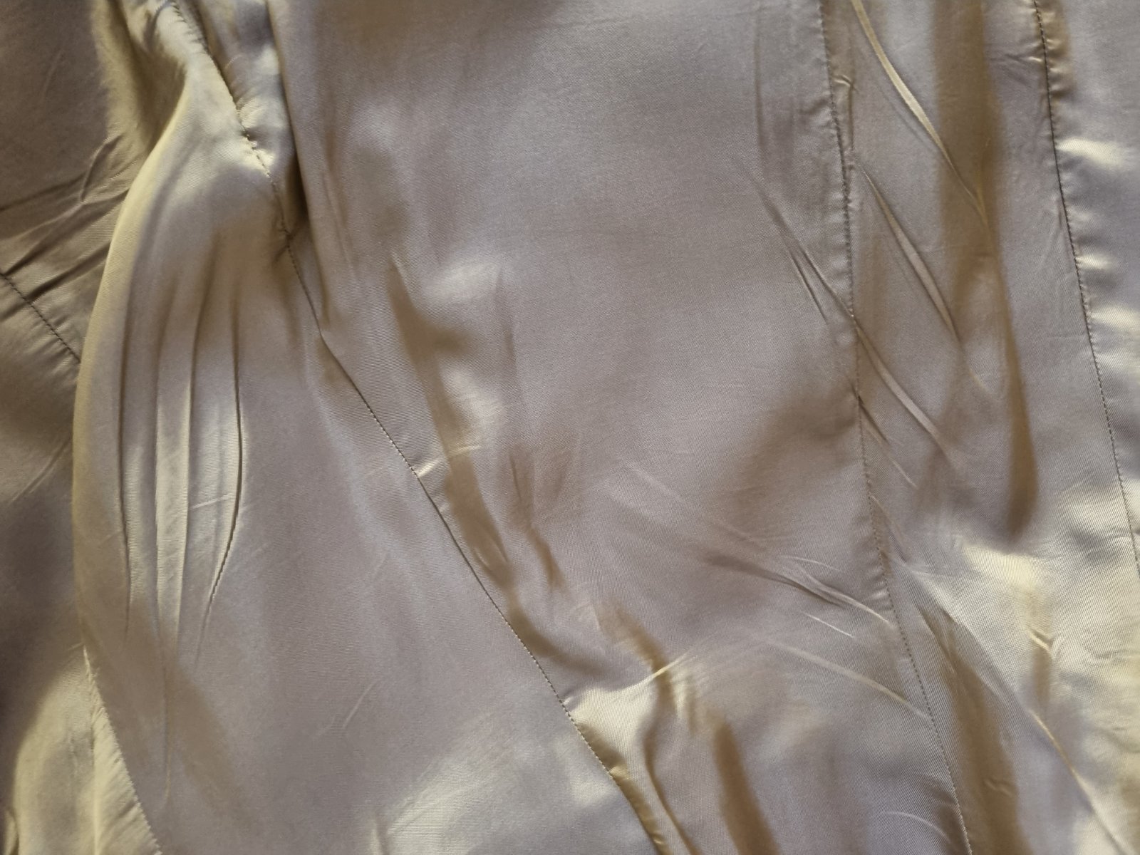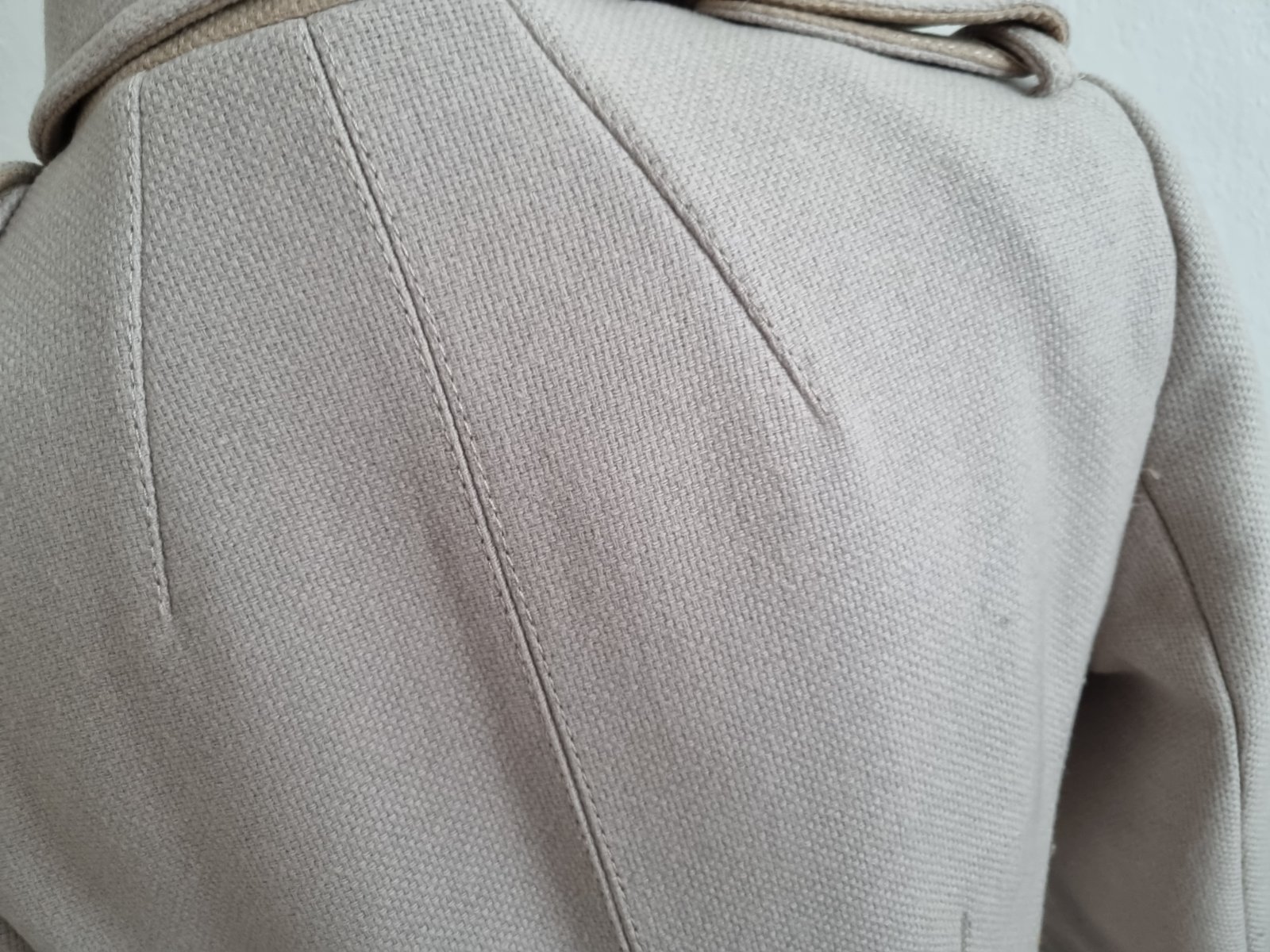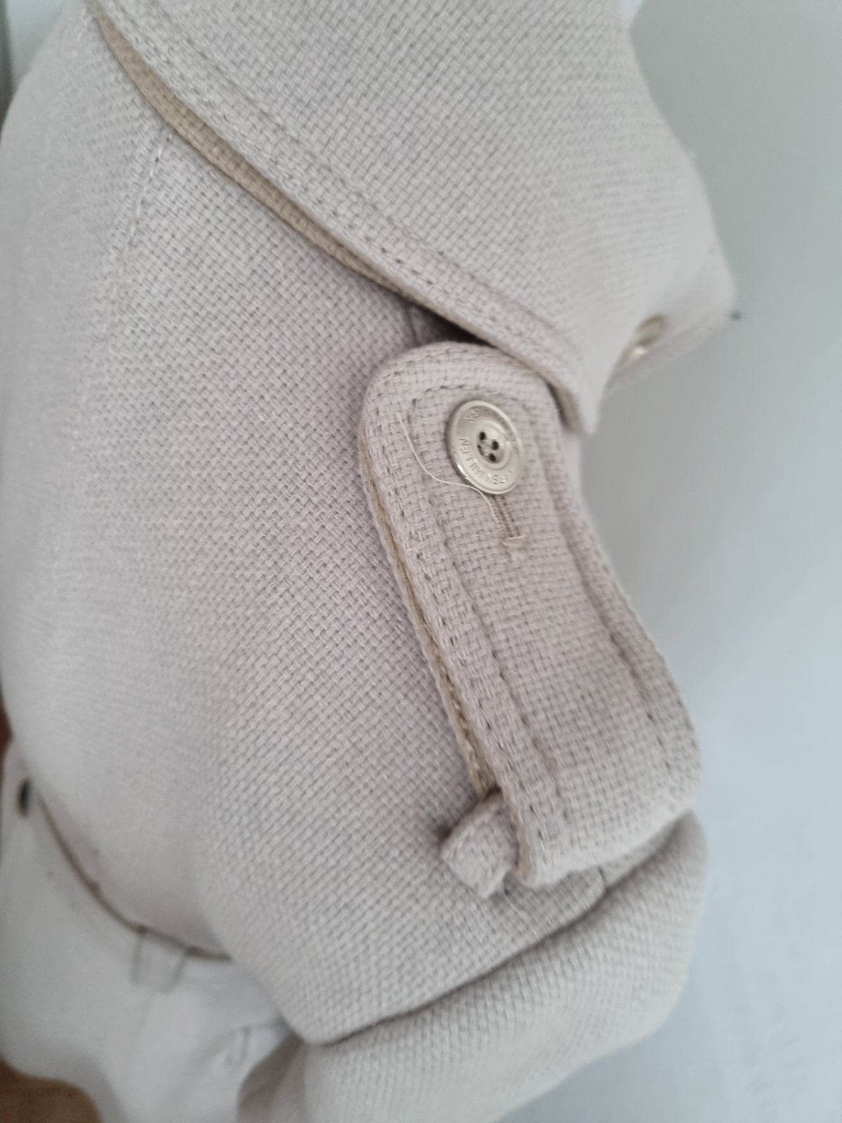 jednu zimu párkrát oblečený luxusný kabát drahej značky Karen Millen, veľ. píše 40, no je to menšia 38, dlžka 98, prsia 47x2 max., pás 40x2, boky 47x2, rukáv od krku 74..luxusná hologramová podšívka, vrchný materiál taký štrukturovaný, zloženie na štítku...Kabát je po čistiarni, zlaté gombíky s logom značky...Nový bol nehorázne drahý, dcéra po pôrode už neoblečie, posúvame....farba bielej kávy...